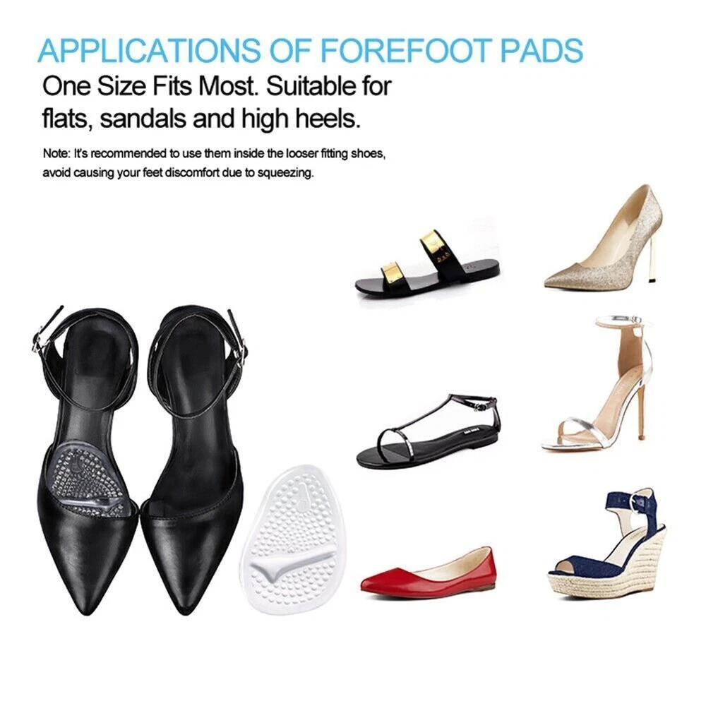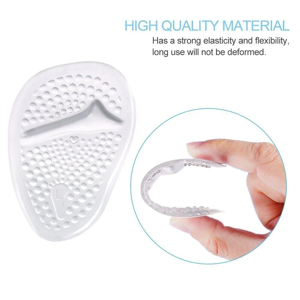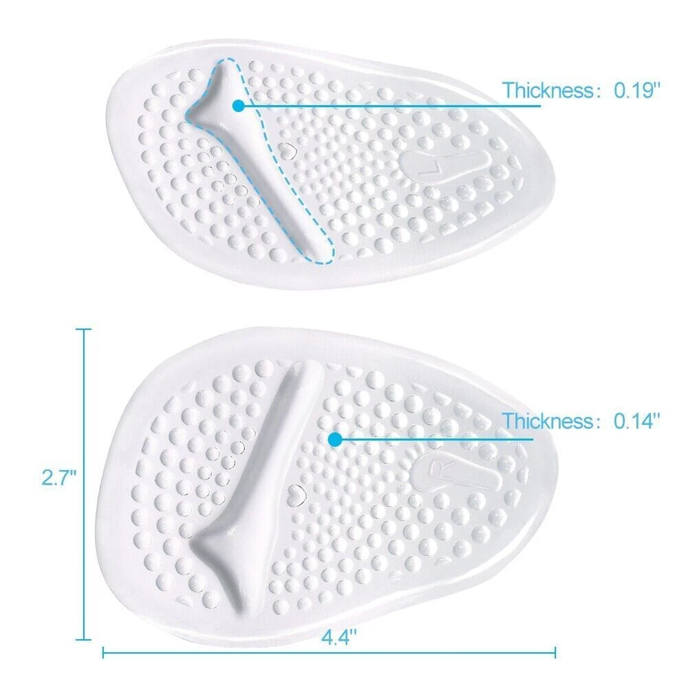 Feature: 1. EXCELLENT ARTIFICIAL FAT PAD: The super soft gel foot pads help to reduce the pressure on the toes and metatarsal, provide maximum comfort for the sensitive tissue of your foot, and absorb the shock of walking in heels. Relieve ball of foot pain rapidly 2. HIGH-QUALITY MATERIAL: Made of , soft and safe -grade silicone gel, has a strong elasticity and flexibility, long use will not be deformed. If your feet tend to sweat a lot, you could wear NO SHOW socks before wearing your shoes. 3. HUMAN ENGINEERING DESIGN: Our forefoot pads meet the shape of human's foot, have a comfortable little that helps hold the ball of your foot in place and prevents your foot from slipping forward. 4. ONE SIZE FITS MOST: Moderate thickness, not too thick so it leaves room for your toes. But we still suggest you use them inside the looser fitting shoes to avoid causing your feet discomfort due to squeezing. 5. Guarantee: Put your worries aside! If you don't like it for any reason, you can just take advantage of our 30 days warranty. We will replace it or give your money back for any reason. Go ahead, you deserve the quality of these Ball Of Foot Cushions Specification: Help provide symptomatic relief for various foot pain like: Metatarsalgia/Ball of Foot Pain Morton's Neuroma Diabetic Foot Pain Metatarsal Fat Pad Atrophy Blisters & Calluses Other Forefoot Pain Features: 1. With this soft and comfortable gel based metatarsal pads in your high heels, you'll feel less pains and more relief when enjoy your great high heels day. 2. Self-adhesive and washable, the stickiness is strong enough to fix the cushions firmly on shoe insole while at the same time will not damage your shoes, the stickiness will the remain the same after washing 3. Non-slip design, the backside is sticky to make the metatarsal pad stay in place in shoe all day, while the upside is cloth covered convex surface with a raised at the ball of foot position to prevent your foot slip forward in shoes 4. and reusable, our ball of foot cushion is high quality gel material made, can be reused for many times and in different pairs of shoes, at least it can make you an easy summer day 5. One size fits for most shoes. Pack of 4 or 2 pairs for sale, you'll have a spare pair. And they're very smart and portable, you can take them in your bag Specifications: Color: Clear+Beige Size: One size fits most Length*Width: 4.4"*2.7" Thickness: 0.14"/0.19" Material: -grade silicone Package Includes: 2 Pairs of Gel Metatarsal Pads