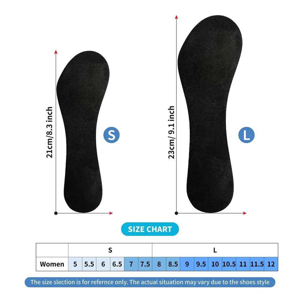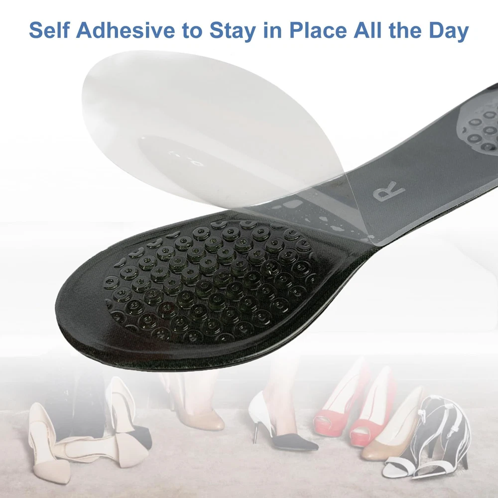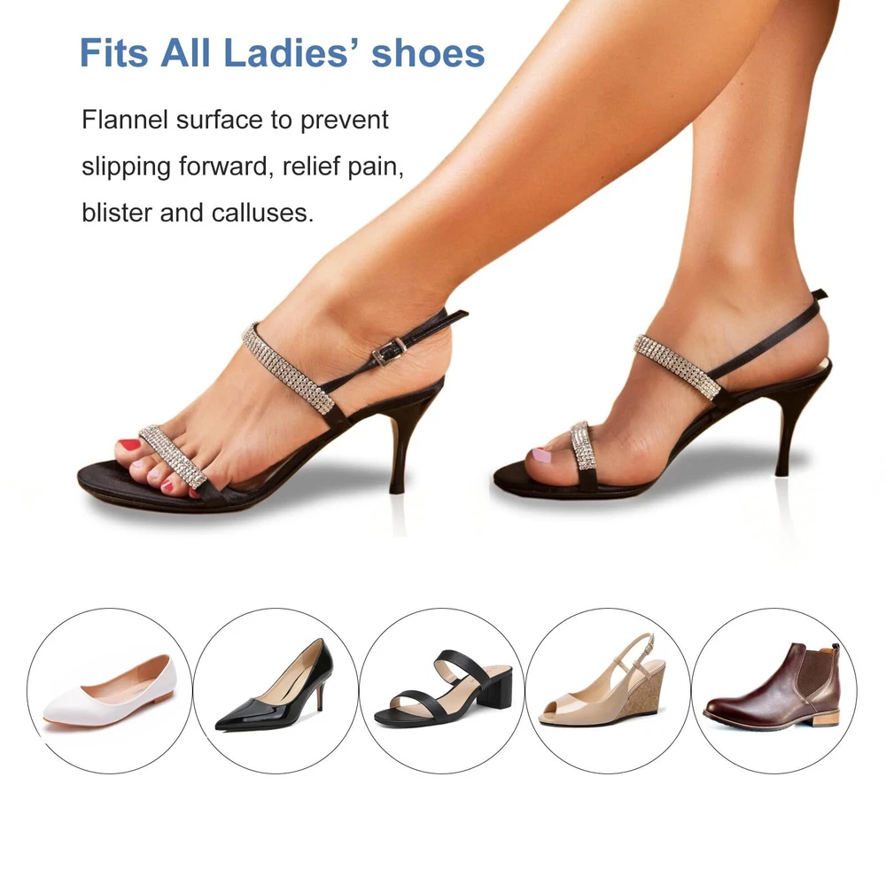No Slip High Heel Cushion: Made of medical gel, it's friendly for skin, and design dot at heel and ball of foot area, prevent your foot slipping forward when you stand, walk and dance. Fits Dress Shoes for Ladies: Relief your feet fatigue and pressure, perfect for high heels, flat ballets, loafers, slippers, wedges, sandals, etc 2 Size for All Women: S/5-7.5 Size, L/7.5-10 Size, Cushioning provides superior shock absorption while being soft, keeping your feet cool, dry, and comfortable. Strong Self Adhesive: Clean your shoes first and remove the adhesive backing, then place them from heel to forefoot and firmly press ,Make the insoles stay in place all the time. Stop Foot Pain: Alleviates forefoot pain and burning, cushions heel and joints, reduce blisters,corn and calluses. not recommended to remove and reuse to another shoe.