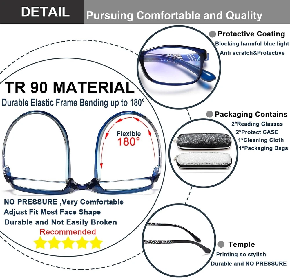 2 Pairs of Blue Light Blocking Glasses - Ultra-Light & Trendy Design ‹ › ‹ › ‹ › ‹ › ‹ › ‹ › ‹ › ‹ › ‹ › ‹ › ‹ › 2 Pairs of Blue Light Blocking Glasses Embrace a lifestyle of comfort and style with our chic and functional blue light blocking glasses. Ideal for both men and women, these glasses are designed to shield your eyes from harmful blue rays emitted by screens. Features: ANTI BLUE LIGHT: Effectively blocks harmful blue rays to protect your eyes from computer visual syndrome and headaches. ULTRA-LIGHT FRAME: Constructed with ultra-light resin lens and a flexible TR90 frame for comfort during prolonged wear. PAIR INCLUDES: 2 pairs of trendy reading glasses, 2 elegant glasses cases, and 1 high-grade cleaning cloth to keep your glasses spotless. DURABLE MATERIAL: Crafted from high-quality materials, these glasses feature memory legs that can be adjusted for the perfect fit. QUALITY ASSURANCE: 30-day and dedicated customer service to address all your needs. Benefits: Protect your eyes from digital strain. Look stylish and professional while working or reading. Durable yet lightweight design for everyday use. Included protective cases make storage and transport a breeze. Dedicated customer service ensures 100% satisfaction. Why Choose Our Blue Light Blocking Glasses? Elevate your eyewear collection with these blue light blocking glasses. Whether you're working long hours on the computer, indulging in video games, or simply enjoying an evening of reading, our glasses provide the protection your eyes deserve combined with a stylish design. With a lightweight feel and versatile frames, these glasses are not just an accessory, but a necessity for modern living. Your eyes deserve the best—experience the comfort and elegance of our blue light blocking glasses today! Shipping Free & Fast Shipping - We offer free shipping to most of the USA with a normal delivery time of 3-7 days. However, due to the current situation, additional delivery time (up to 3 weeks) may be required for some items. Alternative Carriers - We may use alternative carriers (e.g. USPS, FedEx, UPS, etc.) to ensure your package arrives safely and on time. Due to the use of multiple carriers, we are unable to provide a tracking number automatically. Handling Time - Orders are processed and shipped within 1-2 business days of receiving cleared payment. Shipping Restrictions - Shipping to Alaska, Hawaii, Puerto Rico, Guam, and other US territories may incur shipping charges or delivery restrictions. Please contact us before ordering, or your order can be refunded/cancelled. State Restrictions - There may be restrictions based on your state of purchase. For example, certain items may not be shipped to California due to state regulations. Contact for Tracking Updates - If you require tracking updates or have any concerns about the delivery of your order, please feel free to contact us, and we will be happy to assist you. Return 30-Day Hassle-Free Returns - We want you to be completely satisfied with your purchase. If you are not, you can return the item within 30 days of receiving it for a full refund or exchange. Easy Return Process - To start a return, simply contact us and we will provide you with a prepaid return shipping label and detailed instructions. Restocking Fee - There are no restocking fees for returns. However, the buyer is responsible for return shipping costs if the return is not due to a seller's error. Refund Processing Time - Refunds will be processed within 5 business days of receiving the returned item in its condition. Payment We accept all major credit cards, PayPal, and Apple Pay for your convenience. Your payment information is secure and encrypted to ensure a safe and seamless transaction. Please complete your payment within 3 days of purchase to avoid any delays in shipping. Feedback Your feedback is extremely important to us. We strive to provide the best products and customer service possible. If you are satisfied with your purchase, please take a moment to leave us a positive review. If you have any concerns or issues with your order, please contact us before leaving negative feedback. We are committed to resolving any problems and ensuring your satisfaction. Contact Us If you have any questions or concerns, please feel free to out to our customer support team. You can contact us through the eBay messaging system. We are available Monday to Friday, 9:00 am to 5:00 pm EST, and we will do our best to respond to your inquiry within 24 hours. Buy it now and enjoy a pleasant shopping experience! Unit Quantity: 2 Lens Technology: Blue Light Filter Frame Material: TR90 Lens Material: Resin Theme: Designer Features: Lightweight,Anti-drop,Durable,Comfortable,Casual frame design Type: Blue Light Blocking Glasses Department: Unisex Adults Frame Color: Multicolor Lens Color: Blue Style: Rectangular Magnification Strength: =+2.25 strength Unit Type: Unit