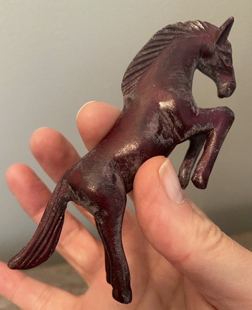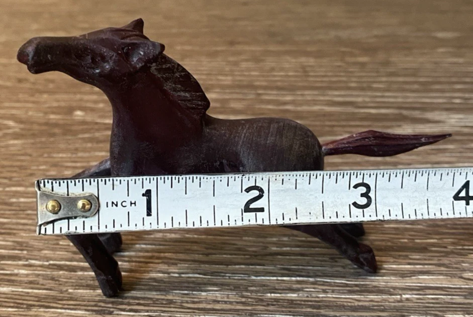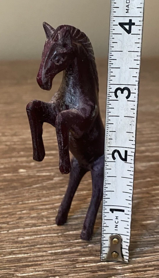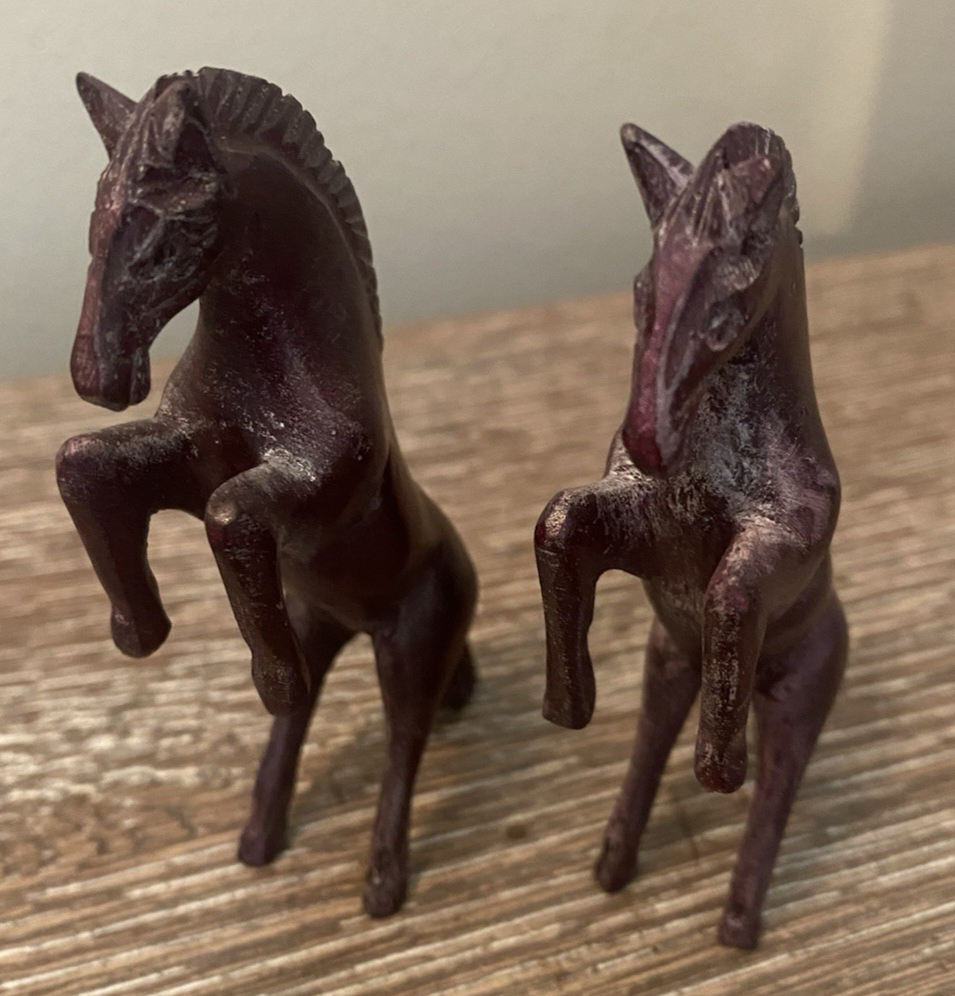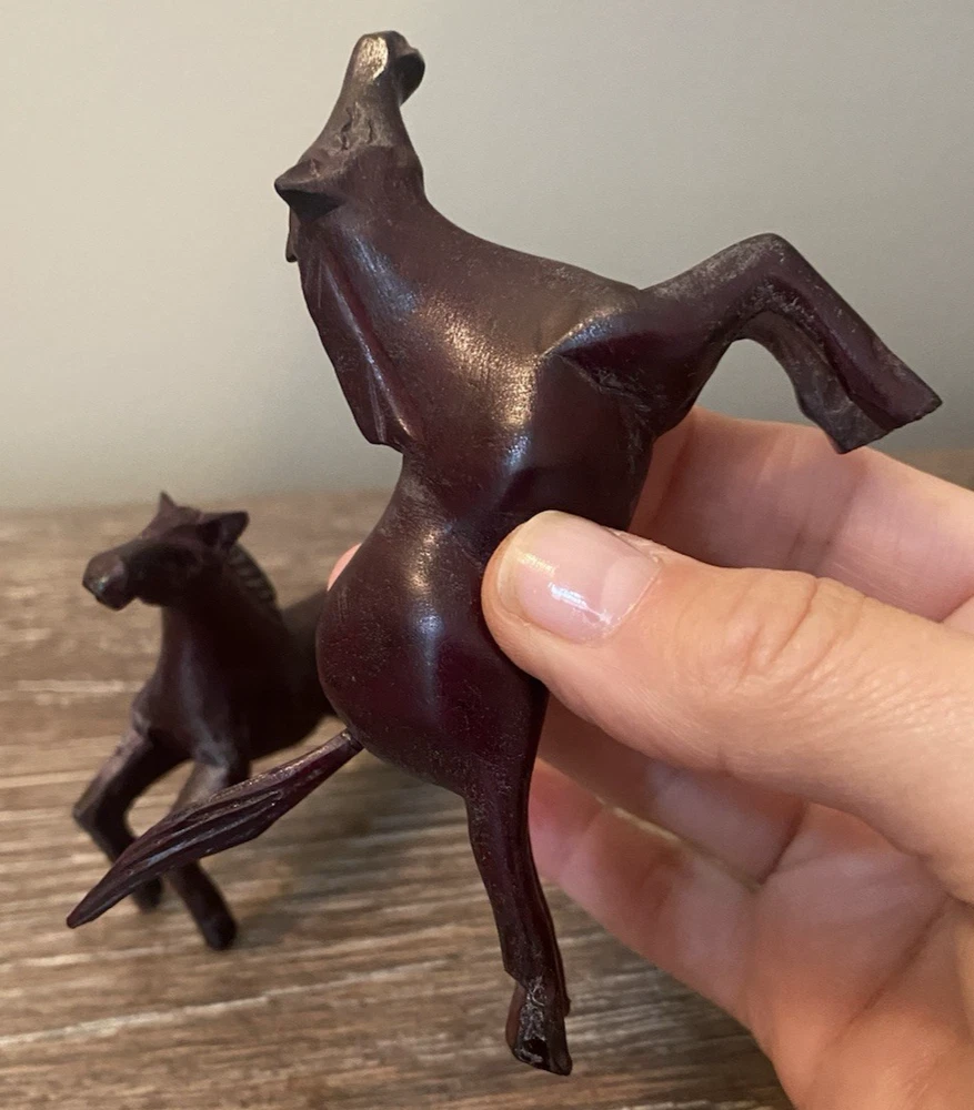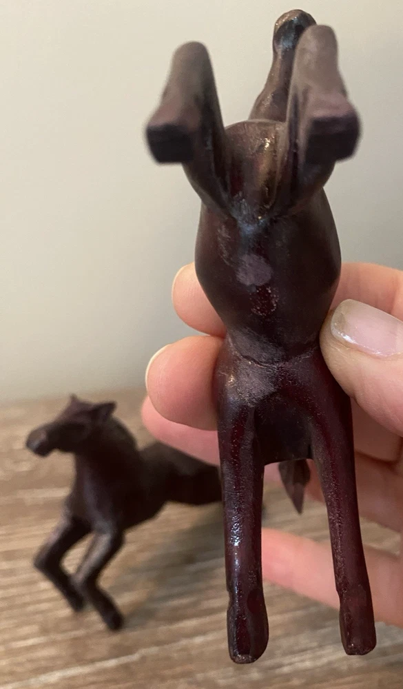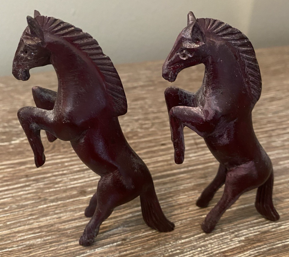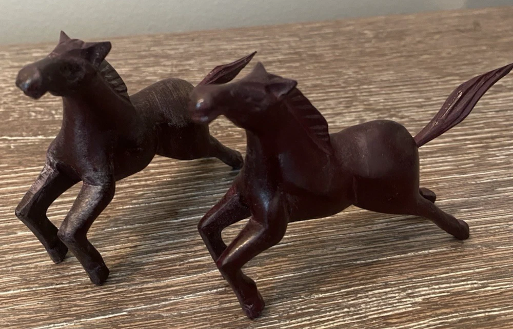 Two pairs of vintage toy horses made of hard plastic or resin. These realistic and detailed figurines are perfect for fans of cowboy and western themes, as well as vintage and antique toy collectors. With their nostalgic appeal and unique design, these vintage toy horses are sure to bring joy to any collection.