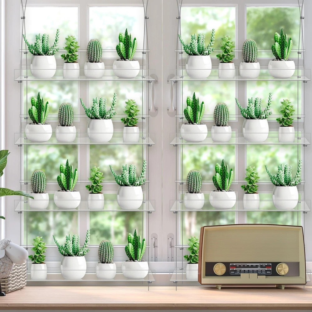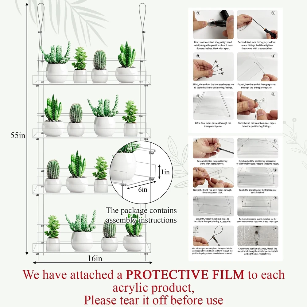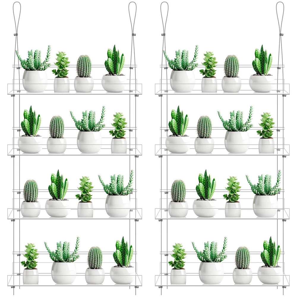 2 Pcs 4 Tier Clear Hanging Window Plant Shelves Acrylic Shelves Hanging Plant Stand Window Plant Hanger Flower Pot Organizer Storage for Indoor Windows Wall Garden Kitchen Grow Herb Succulent(Fresh Style) Product Details Color: clear Material: Acrylic Brand: Ziliny Shape: Rectangular prism Base Type: Pedestal Assembly Required: Yes Number of Levels: 4 Manufacturer: Ziliny Package Dimensions: 16.69 x 7.2 x 5.83 inches Item Weight: 6.95 pounds Country of Origin: China Item model number: JNE-Ziliny-0442 Maximum recommended load: 4.54 Kilograms Number of pieces: 2 Batteries required: No Note: we have attached a protective film to each acrylic product, please tear it off before use; we provide convenient installation instructions, all the parts, and hardware were included except for the screwdriver, please assemble according to the manual Aesthetic Transparency: add elegance to your plant display with this window plant holder; Its transparent design allows enough sunlight for your plants while giving you an unobstructed view; The clear color further adds a touch of sophistication, making it a proper match for most indoor decor theme Functional and Decorative: aside from serving as storage for your plants, our windowsill plant shelf can also be a decorative piece; The clear material, combined with the beauty of your plants, can bring life to most space; It's suitable for living rooms, bedrooms, offices, or many spots that could need some plant life; They are also thoughtful gifts for your friends who like planting or home decorating Features: These indoor plant shelves are not just designed for decor purposes. You can foster an array of plants and nurture them into healthy, photogenic greenery. From herbs, succulents to flowering plants, you can grow it, letting their beauty adorn your room. The package includes 2 sets of 4 tier clear hanging window planter, enjoying the advantage of an aesthetically appealing plant display accessory. The satisfaction of seeing your plants thrive on these shelves is an invaluable treat. Specifications: Material: acrylic Color: clear Size: about 16 x 6 x 1 inches each tier Package includes: 2 x Clear hanging window plant shelves 4 tier Notes: Manual measurement, please allow slight errors on size. The color may exist a slight difference due to different screen displays.