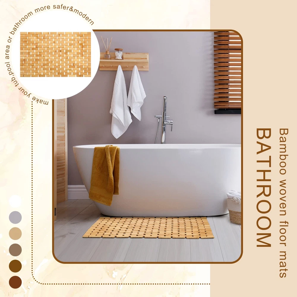 Features: You will be provided with 2 pieces of non skid bamboo bathroom mats in the package, sufficient in quantities and distinctive in design, which are enough for your daily use and replacement needs in daily life. Bamboo bath tub mat can be a practical and decorative addition to your home and suitable for indoor and outdoor use, it will be a suitable gift option for most occasions for your friends, family, neighbors, coworkers and so on. Specifications: Material: bamboo and silicone Color: carbonized color Size: about 24 x 16 inches/ 60 x 40 cm Package includes: 2 x Shower mats for bathroom Notes: Manual measurement, please allow slight errors on size. The color may exist a slight difference due to different screen displays. Foldable Design: our bamboo bathtub mat is measured about 24 x 16 inches/ 60 x 40 cm, which is proper in size and light in weight, and can be folded to carry and store, so you can put it in a bag or car, without taking up too much space Long Time Service: our non slip bath mats for bathroom are mainly made of quality bamboo material, which is safe and reliable, strong in hardness and sturdy, not easy to break, deform, fade or wear, can be applied for a long time Nice Accessories for Fabric Rugs: you can place a fabric rug on top of our bamboo floor mat to keep your rug dry and prevent bad odors from developing due to its multiple lattice openings allowing airflow and water to escape Non Slip Silicone Mat: waterproof bathroom floor mat has a quality silicone material on the bottom, which can grip various floors, including tile and wood, etc., preventing the bath mat from shifting and slipping, protecting you and your family from safety and comfort Wide Range of Uses: wooden bath mats are suitable for placing on bathroom, kitchen, living room, bedroom, doorway, deck, poolside, outdoor camping, beach, under the grill, patio, deck, garages, entryways, office and so on, will easy to draw people's attention
