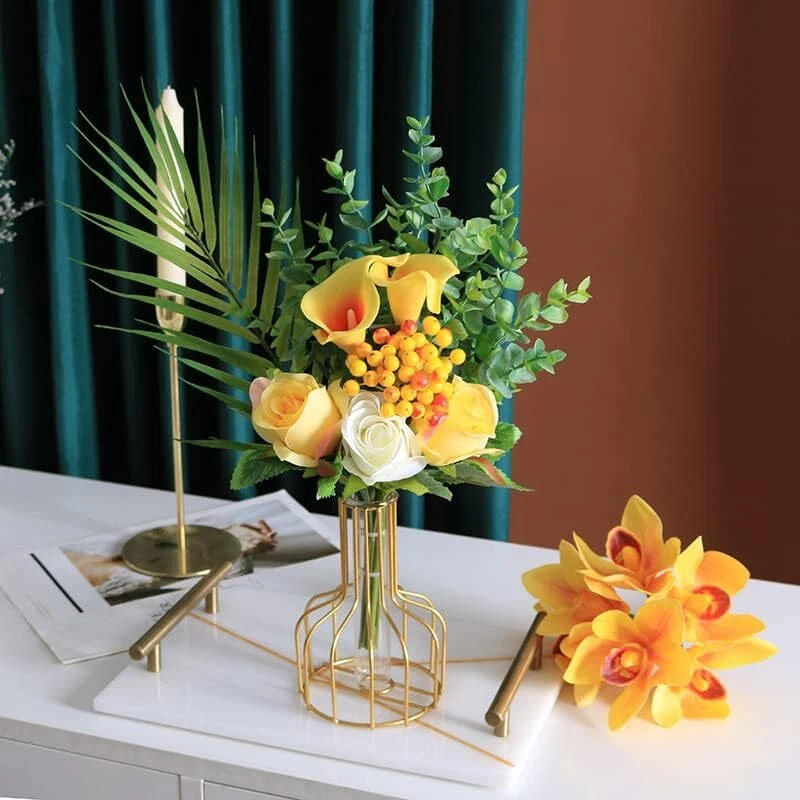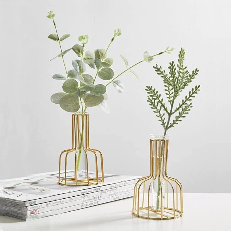 【Material】 The small gold vase is composed of a golden metal frame and a hanging glass tube, the material is hard, not easily deformed, and the lines are clear, adding a new color to you. 【Size】The size of high quality clear glass vase container is about: 3.9 * 5.9 inches, the shape presents a geometric frame, the center is hollow, light weight, detachable design, easy to take out and put in, unique shape. 【Features】 Simple gold metal small vases made of the combination of iron art and test tube vase is smooth and rounded surface, suitable for a variety of styles of placement scenes. Metal appearance, transparent glass container, looks simple and warm. 【Modern Geometric Hydroponic Vase】Exquisite workmanship and beautiful appearance guarantee its popularity and practicality. Gifts Vase can be filled with water, suitable for live flowers and grasses, and can also be used for dried flower decoration. 【Flower Vases for Centerpieces】These decorative small vase is suitable for living room, desk, dining table, party, wedding decoration, bathroom, porch, it can be placed anywhere you want to decorate. The product you received does not include these botanical decorations on the pictures.