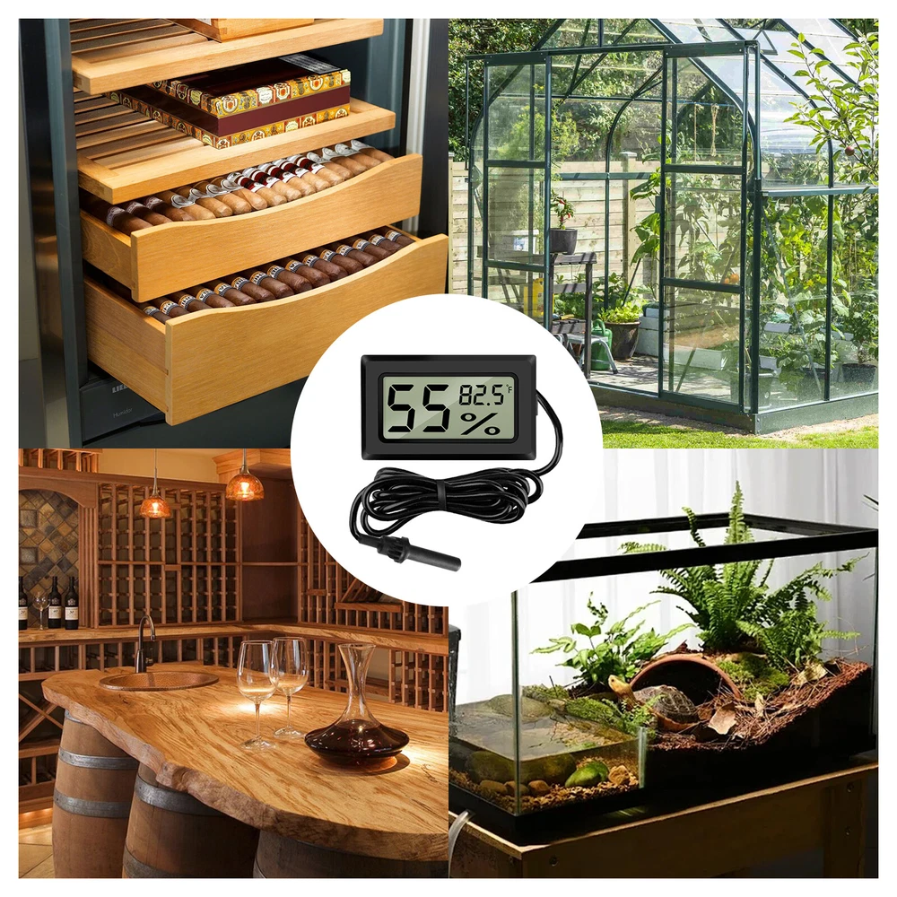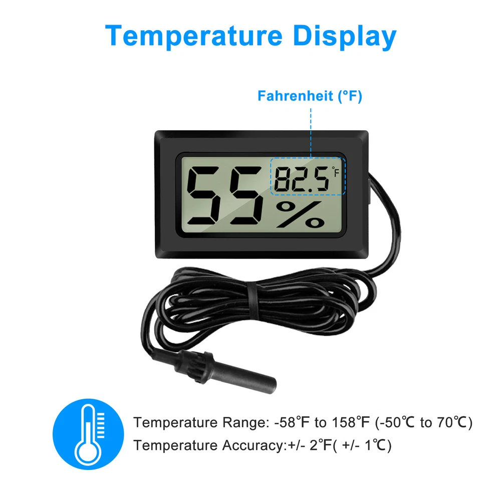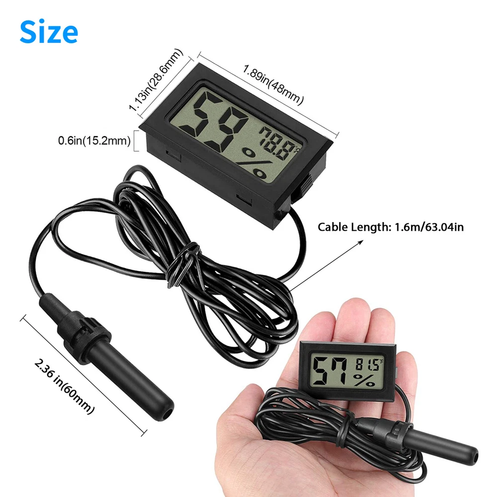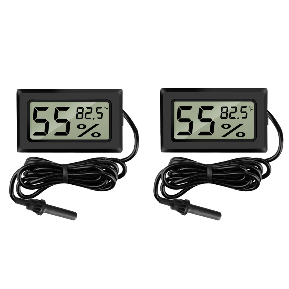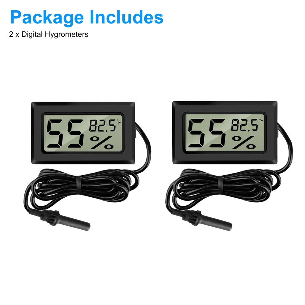 Product Feature π Healthier Homelife: Digital probe thermometer ensures proper indoor humidity control and has important skin, allergen, and other health benefits. π Wide Application: Durable and portable, this temperature and humidity gauge can be used as a refrigerator thermometer, freezer thermometer, reptile thermometer, soil thermometer, humidor hygrometer, cigar hygrometer, and more! π Large Display: Indoor room thermometer features a 1.6inch LCD screen, this thermometer displays temperature in Fahrenheit (β). π High Reliability & Accuracy: Temperature Range -58β to 158β; Temperature measurement accuracy: Β±2β; Measures humidity from 10% to 99% RH. π Long Battery Life: Hydrometer with probe is powered by Two LR44 Button Cell (Included), Battery Working Time up to 8 Months. No more hesitation! Try it now! π Note: Thermometer can not directly be placed on heat source or humidification source. Product Specification Type Hygrometer Thermometer Color Black Material ABS Qunatity 2 Pieces Screen LCD Display LCD Dimension 1.41*0.67 inch(36*17mm) Temperature range -58 β -158 β (-50β-70β) Temperature Accuracy Β±2 β οΌΒ±1βοΌ Measuring Humidity Range 10% RH ~ 99% RH Humidity Accuracy Β±5% RH Humidity Sampling Period 10 seconds Power Source Battery Powered Package Included π 2 x Digital Hygrometers Location Descriptions To improve your buying experience and ensure fast delivery, Your order will be shipped from the warehouse located in either new jersey or california that is closest to your address. If you have any questions, Please contact us. Thank you for your support !
