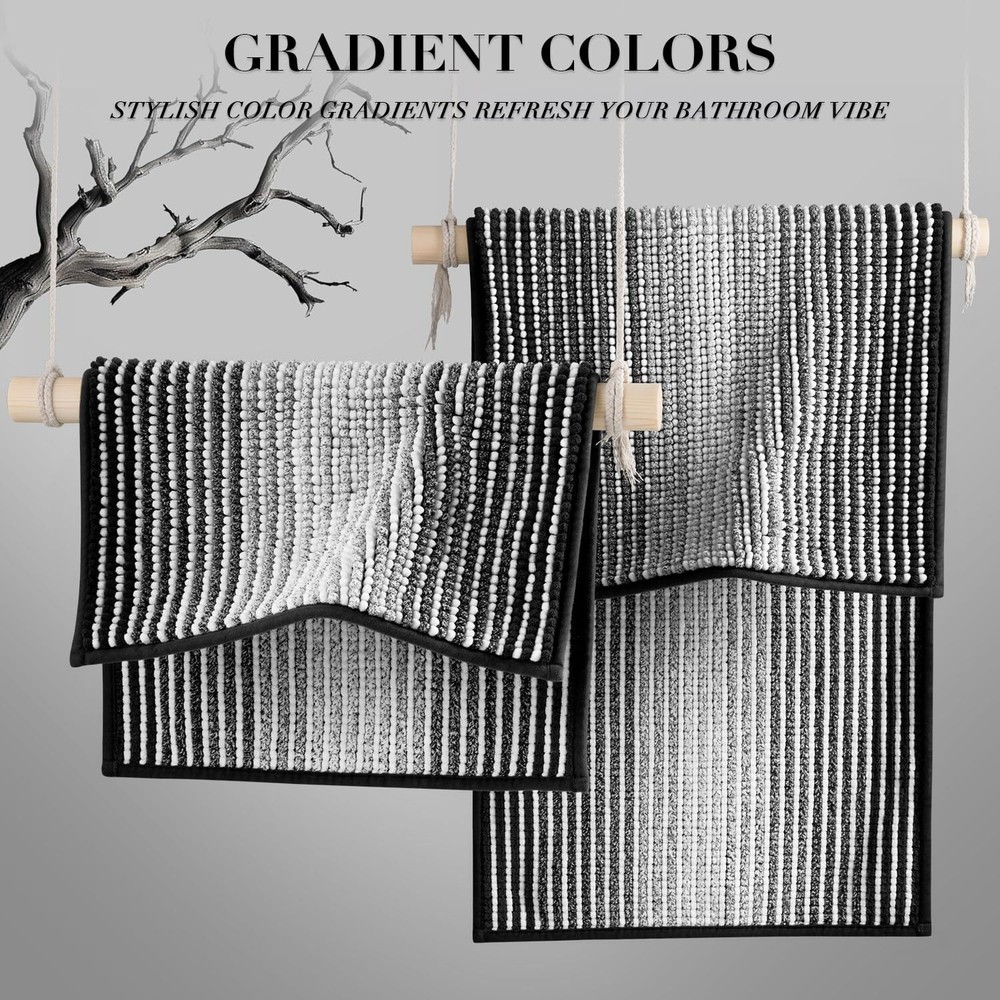 HOME DESIGN WELCOME TO YOUR PERFECT HOME DETAILS PRODUCT DESCRIPTION Paquage Include:(2x Bath Mat Rug ) 1x (20"x 47") and 1x (16"x24") 【PREMIUM CHEILLE BATH MAT SET】: You will get 20"x 47" & 16"x24" bathroom rug sets, which are made of high quality fluffy plush chenille microfibers. The soft fibers are very dense and not easily turn deflated after use, soothing your tired feet and shielding your toes from the cold floor. The density and plushness of our pile surpass that of most other brands. 【EXTRA ABSORBENT BATHROOM RUG】: The luxury performance chenille microfibers can quickly absorb moisture from your feet when you step out of the bath or shower, and save your floors from dripping water, and dries quickly, making your feet feel the ultimate luxury enjoyment 【NON-SLIP/BREATHABLE】: High quality hot melt adhesive backing to keep the carpet firmly in place and prevent shifting and skidding. Provide better security for families with children or the elder. Attention: The bath rug underlay should be clean, flat, and dry before placing the mat on the floor. Water or dust under mat may cause slippage. 【MULTI-PURPOSE USE】: The gradient color design for this shaggy bathroom rug set is beautiful, make it easy to go with any bathroom home decor, bring charming and fantastic feeling for your family, multiple sizes are essential for any style spaces, it can be applied in bathroom, kitchen, bedroom, living room, door entrances, stairs, balcony, laundry room, pet house, pet rug, and more. 【MACHINE WASHABLE BATH RUGS】: Durable material, machine washable, With premium fiber locking technology, every fiber is firmly attached onto the backing so that the bathroom mat will not shed during using or washing, color will stay nice and vibrant for years to come no matter how many times be washed and dried. Machine wash with cold water and mild detergent (no chlorine or bleach) tumble dry at low speed or hang dry. Item model number JYMT Style Boho, Contemporary, Modern Material chenille Weave Type Machine Made Pattern Striped Age Range (Description) Adult Country of Origin China Warranty Type Limited Is Stain Resistant No Theme bathroom decor Cartoon Character bathroom rugs Number of Pieces 2 Room Type Laundry Room, Bathroom, Kitchen, Bedroom, Living Room, Home Office Product Dimensions 47"L x 20"W Batteries required No Min Required Door Width 20 Inches Model Name JYMT Rug Form Type Bath Mat Item Thickness 0.6 Inches Indoor/Outdoor Usage Indoor Water Resistance Level Not Water Resistant Is Autographed No Item Weight 2.8 Pounds Pile Height Medium Pile Construction Type Machine Made Occasion kitchen, bathroom Special Feature Absorbent, Fluffy, Moisture Barrier, Durable, Non Slip, Washable Color Black Shape Rectangular Back Material Type others Included Components others Fabric Type Chenille Product Care Instructions Machine Wash Size 20" x 47" Plus 16" x 24" 20.0 "w x 47.0 "w. Weight: 2.8 lb Payment We accept all payments via Ebay using Credit Cards , PAYPAL , Apple Pay and many others Shipping We are always working hard to ensure your package arrives as soon as possible. Please understand that some factors like weather, high postal traffic, and the performance of shipping companies are outside of our control. DELIVERY & RETURN POLICY We offer a 30-Day Return Policy on items in which you are not completely satisfied with. You have the option of a full-refund or an exchange of the item. No returns are available on items shipped outside of the USA.