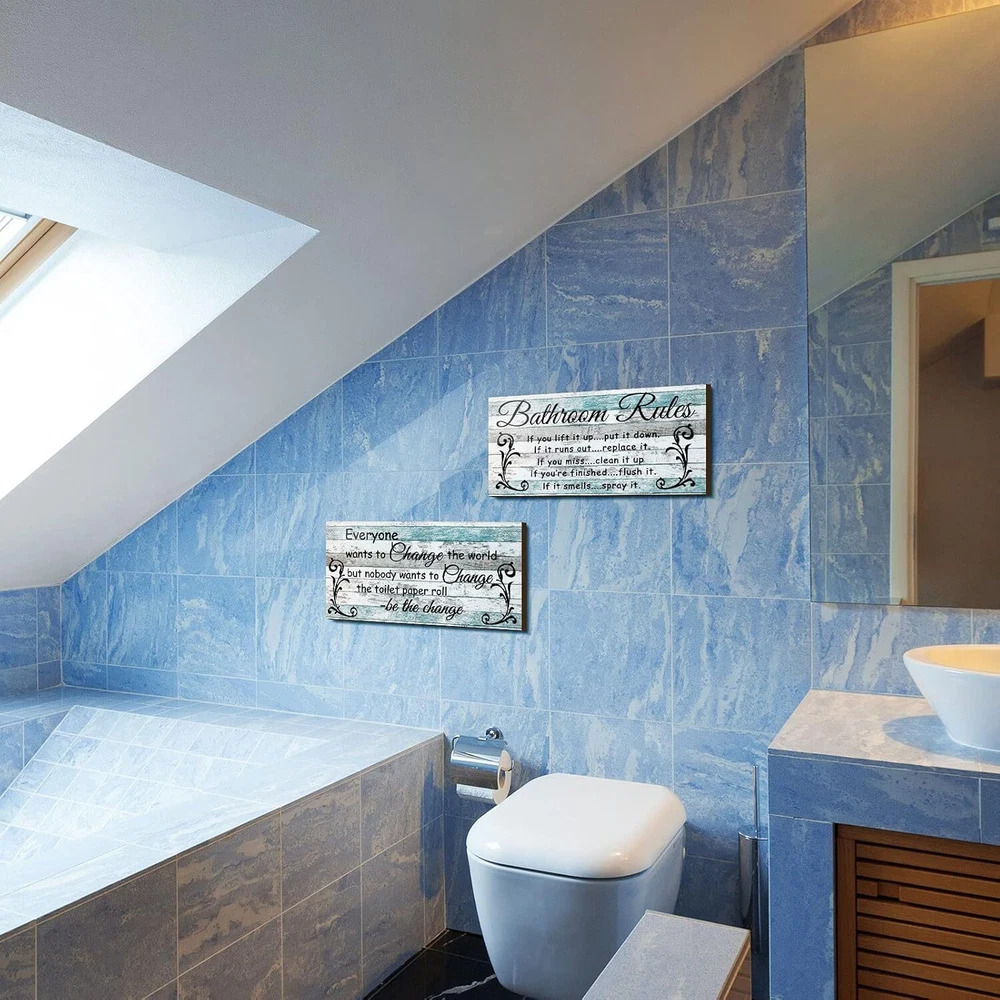 2 Pieces Funny Teal Bathroom Signs Beach Theme Wall Decor Chic Style Product Details Color: Chic Style Brand: Jetec Material: Wood Theme: Words & Quotes Recommended Uses For Product: Property What you will get: the package contains 2 pieces of funny bathroom signs and swivel loop hangers, each of them measures approx. 12 x 6 x 0.2 inches, a suitable size for you to decorate your home, and there are bathroom rules and to be change on it, all of them are bathroom themes, to make your visitors feel warm and comfortable Widespread applications: there are lots of places where you can hang your ocean theme beach bathroom decors: bathroom walls, furniture mantels, patio, front porch, living room, fences, and so on, it would be a nice home decoration for your relaxing bathroom, it depends on where you want to hang it, what's more, you can hang it single or set Reliable material and UV printing: the decors use reliable wooden construction, to make sure you can use it for years and years, also wooden decors have no bad smelling compared with PVC material, what's more, our UV printing technology makes the letters and color clear and stable, it won't change color or disappear under the sunshine Easy to use: there are 2 swivel loop hangers equipped on your package, it's the most convenient and widespread way to install it, the only thing you need to do is put it on where you want to hang, whether you hang or remove, there is no scratching to your home Nice gift idea: we always send presents to people around us to show our feelings about them, sending the bohemian decor wall tapestries to your family, neighbors or friends as daily gifts is a brilliant idea, and it also can fully express your appreciation and enthusiasm to them, what's more, when they look at the wall, they will remember you