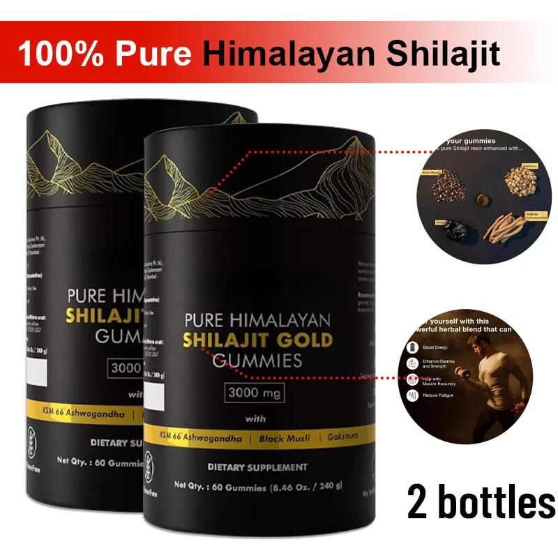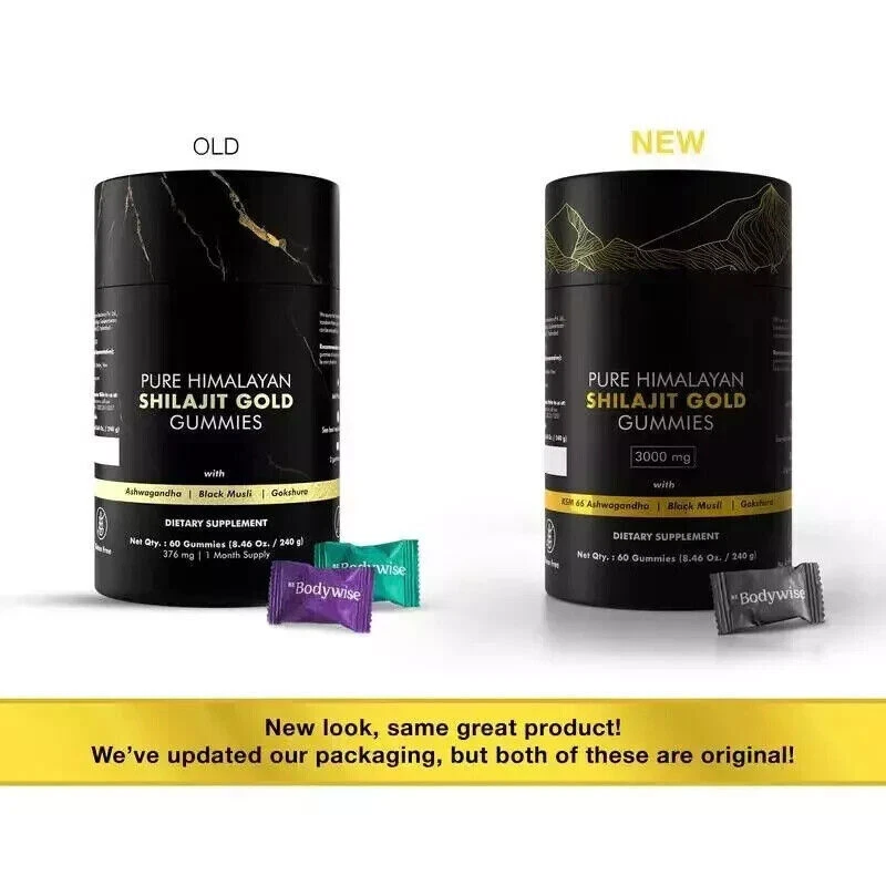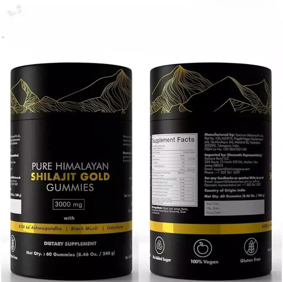 Package: 2 Pack = 120 Counts Pure Himalayan Shilajit Gummies Gold I Lab Tested I No Added Sugar I Ashwagandha, Gokshura| Fulvic Acid & 85+ Trace Minerals I for Men, Women I Non-GMO I 100% Natural & Organic I 60 Gummy SOURCED FROM HIMALAYAS: Harvested from pristine heights of Himalayan Mountain, our Pure Himalayan Shilajit Gold Gummy contains pure & organic gold grade shilajit, sourced from 18,000 ft above sea level. Especially prepared to aid transformational journey towards wellness by boosting energy and aiding enhanced workout routine & recovery. Our gummy is a modern way of consuming our trusted power packed supplement. LAB TESTED & PREMIUM QUALITY: Be Bodywise Pure Himalayan Shilajit Resin Gold Gummy is “Lab Tested” to be free from heavy metals, fillers, and harmful additives. Crafted in its most authentic form, it has no added sugar, corn starch, glucose syrup, artificial colours, or gum. It's completely vegan, natural, and non-GMO. NATURE’S POWERHOUSE: With "3000 mg Pure Shilajit" , “ No Added Sugar” and infusion of potent ingredients including Ashwagandha, Black Musli & Gokshura; our Shilajit Gold Gummies pack a powerful punch of essential nutrients that are 100% natural and organic. Our Shilajit Gold Gummy comes free of heavy metal and chemical contaminants. STRENGHTEN & REVITALISE: Our Power packed, all-in-one supplement combines potent action herbs like Himalayan Shilajit Resin, Ashwagandha, Saffron, Gokshura and Safed Musli. Every gummy delivers a powerful dose of Shilajit and Ashwagandha. These ingredients help enhance strength, aid post workout muscle recovery and reduce fatigue, giving you a boost to your overall wellbeing. TRAVEL FRIENDLY & INDIVDUALLY WRAPPED: Goodness of traditional ayurveda in a modern avatar; our travel friendly, “individually wrapped” gummies are a delicious way to add natural shilajit to energise your active daily lifestyle & enhanced workout routine. Have 2 Gummies a day for optimal result.