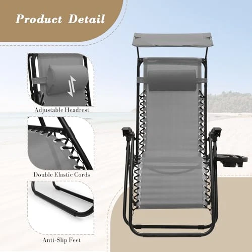 Going on an outdoor adventure? Discover the versatility of a folding chaise lounge chair! It the perfect seating companion for camping trips, picnics, sunbathing, or any other outdoor activity. Its compact design allows for easy storage and transport, making it a practical and space-saving option. Plus, with customizable features, durable construction, and a comfortable design, this chaise lounge chair delivers a convenient and relaxing seating experience for any occasion. Premium Materials: Composed of sturdy metal support and breathable mesh fabric with wear-resistant double bungee rope design enhances load-bearing and elasticity. The weight capacity of this outdoor chair set is 330 lbs. Flexible Adjustment: Featuring a lockable recline function, you can switch this beach chair’s recline to your liking when utilizing the flexible buttons. And this set of fabric lounge chairs can effectively relieve your fatigue Wide Range of Application: This foldable lawn chair can be placed in the trunk of a car and is easy to carry on outdoor trips. It can be used at the beach, poolside, courtyard, balcony, park, garden, etc. Premium Materials: Composed of sturdy metal support and breathable mesh fabric with wear-resistant double bungee rope design enhances load-bearing and elasticity. The weight capacity of this outdoor chair set is 330 lbs. Flexible Adjustment: Featuring a lockable recline function, you can switch this beach chair’s recline to your liking when utilizing the flexible buttons. And this set of fabric lounge chairs can effectively relieve your fatigue Removable Canopy and Tray: The reclining chair comes with a canopy sunshade to protect your face and eyes from the sun. And there is a headrest to relieve cervical spine pressure and a cup tray, which are all removable and can be adjusted according to your needs. Wide Range of Application: This foldable lawn chair can be placed in the trunk of a car and is easy to carry on outdoor trips. It can be used at the beach, poolside, courtyard, balcony, park, garden, etc. What You Get: 2*Lounge Chairs + 2*Canopy + 2*Tray + 2*Headrest. And the canopy can be adjusted according to different usage environments