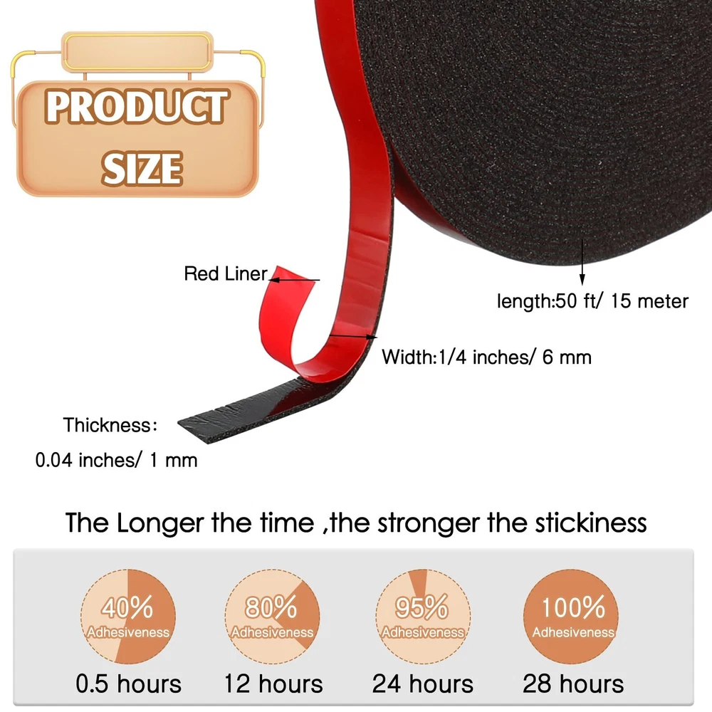 Features: A long time service: The double sided sticky tape is featured with waterproof design and applied for wide applications, which can accompany you for a long time. Nice performance: The adhesive strips can keep surfaces smooth, who can be applied to replace rivets, screws, spot welds and avoid drilling, grinding, refinishing, screwing, welding and associated clean up. Specifications: Material: foam Color: black, red Size: 1/4 inches/ 6 mm in width, about 50 ft/ 15 meter in length, 0.04 inches/ 1 mm in thickness Package includes: 2 Rolls of double stick tapes Notes: Manual measurement, please allow slight errors on size. The color may exist a slight difference due to different screen displays. What You Will Get: the package comes with 2 rolls of double stick tapes in black color with red release paper, useful helpers for your practical use and daily life, the quantity can meet your demand effectively Size Information: the foam waterproof tape is 1/4 inches/ 6 mm in width, about 50 ft/ 15 meter in length, 0.04 inches/ 1 mm in thickness, making it suitable for both indoor and outdoor use, such as kitchen and bathroom Easy Installation: this black double sided tape is easy to install, just peel off the tape and paste it to the surface of the objects, very flexible, which can also be very good to help you complete the task Versatile Use: the foam adhesive tape is an essential choice for mounting large and heavy tools, strip lights, car decorations, educational materials, posters and picture frames with durability and convenience Warm Tips: the double sided foam tape is suitable for most surfaces, including installations outdoors or in wet areas; Please keep the mounting surface dry, clean and oil free when using the tape to ensure that it is water and moisture resistant