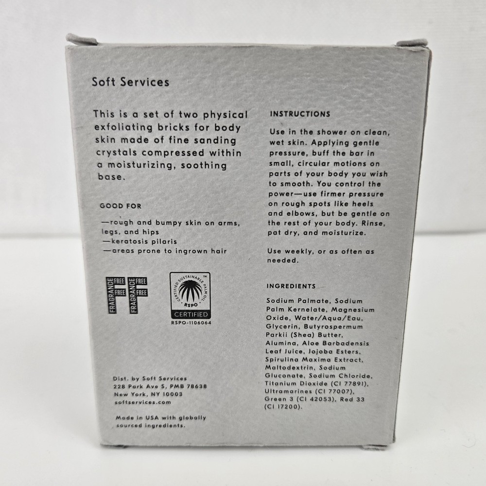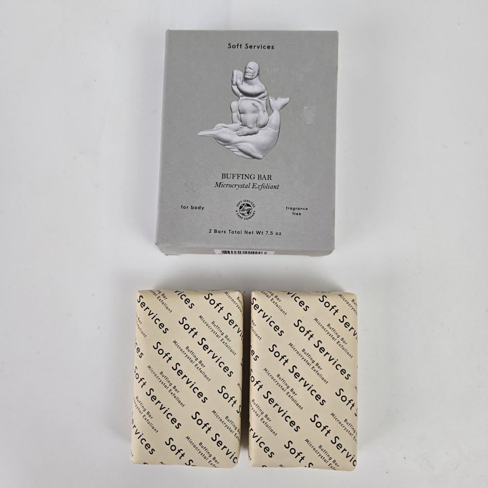 Soft Services Buffing Bar Microcrystal Exfoliant Original Fragrance Free. This set of 2 bars have a total net wt of 7.5 oz. New and sealed in an opened box.