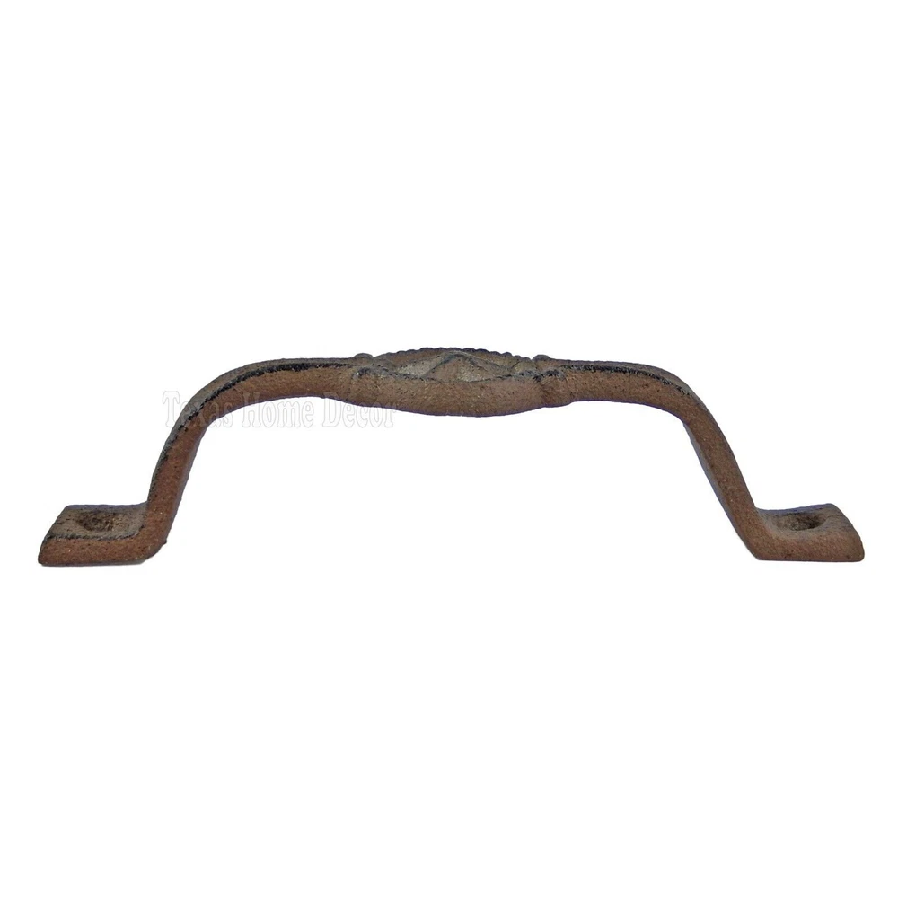 2 Star Door Handles #G071 Set of 2 new handles Made of cast iron with a rustic brown finish Measures 6 1/4 inches in total length by 1 inch wide at the base Each handle has 2 predrilled holes Mounting holes are 5 3/8 inches apart The space between the mounting surface and the handle is 1 1/4 inches Great for rustic furniture, coolers, shed doors, drawers or cabinets