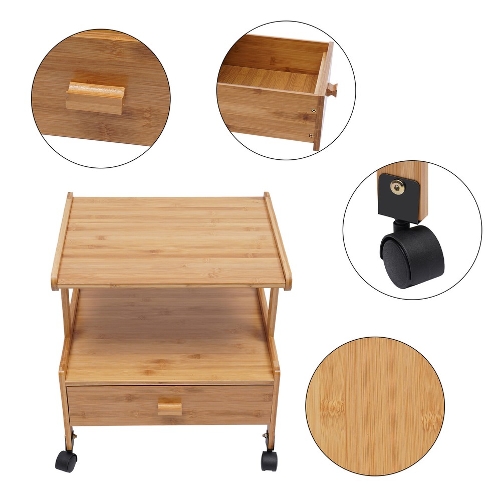 Wood Printer Stand With Lockable Wheels 2 Tiers Printer Cart Storage File Shelf 2 Tier Wood Storage Cart With Wheels Drawer Office Printer Stand Printer Cart Wood Printer Stand With Lockable Wheels 2 Tiers Printer Cart Storage File Shelf Description: 1. Strong And Durable The Bamboo Printer Stand Is Made Of High-Quality Bamboo, Strong Structure And Strong Bearing Capacity, Strong Enough To Put a Printer Or Monitor On Top Of It. No Sharp Materials, Safe To Use, And Bamboo Materials Are Very Environmentally Friendly, And They Are Healthy And Safe For Long-Term Use. 2. Save Your Space Perfect Size For Desktop To Put Your Printers,Scanner Or Fax Machines On The Top And Storage Books, Files, Potted Plants, Cosmetics,Papers, Stapler And Other Office Supplies On The Shelves. 3. Easy To Move The Printer Stand Adopts a Wheel Design, Which Is Light To Push And Pull, And Can Be Easily Moved To Any Place. When Not In Use, It Can Be Pushed Directly Under The Table To Save Space. 4. Super Simple Assembly It Will Take You Short Time To Assemble This Multipurpose Shelf Without Complicated Tools. All Installation Tools And Hardware Are In The Package. 5. Multifunctional Stand The Shelves Can For Printer Stand, Book Shelf, Storage Shelf, Plant Pot Tray And So On. The Clean, Modern Look Is Ideal For Home And Office Use Specifications: Material: Bamboo Color: Wood Color Dimension: Two layers with drawers: 37.5x46x50cm/14.76x18.11x19.68in Weight: approx. 7kg Load Capacity: 30kg Package Included: 1*Printer Cart 1*Set of Hardware Note: 1.Please Allow 1-2cm Errors Due To Manual Measurement. 2.Due To The Difference Between Different Monitors, The Pictures May Not Reflect The Actual Color Of The Item. Payment Delivery details Terms of sales About us Contact us Payment We accept ebay payment 。 Fees such as import duties, taxes are not included in the item price or shipping costs. These charges are the buyer's responsibility. Delivery details Shipping: 2-9 working days to: USA Terms of sales We maintain high standards of excellence and strive for hundred percent customer satisfaction. Feedback is very important to us. We hope that you contact us immediately before you give neutral or negative feedback, so that we can address your concerns. It is impossible to address issues if we do not know about them! About us Your satis faction is our ultimate goal. We work hard to earn your trust and future business. Our certified technicians have tested each item before shipping. The unit comes with 1 year limited warranty on all manufacturing defects. a) If you receive a defective item, you may return it or ask for a discount. Please contact us within 14 days after you receive the package. b) What you returned must be intact and in its original packaging as re? u. Customer is responsible for shipping costs of the returned item. c) We will cover the cost of shipping back t with the shipping rate indicated in the registration page. We will send you a new unit or refund the full payment you paid. Thank you. Contact us Business Hour Business Hour: Monday To Friday: 8:30 AM to 5:00 PM (Beijing China time) Due to time zones, our reply to your questions may not be immediately. But within above working time, we will reply your email within 24 hours. If it's non-workdays, please kindly be patient and wait till Monday. Please contact us with ebay message. Please feel free to contact us if you have any questions. Monday To Friday: 8:30 AM to 5:00 PM (Beijing China time) Due to time zones, our reply to your questions may not be immediately. But within above working time, we will reply your email within 24 hours. If it's non-workdays, please kindly be patient and wait till Monday. Please contact us with ebay message. Please feel free to contact us if you have any questions. Brand Unbranded MPN Does not apply Type Printer Cart Stand Material Bamboo Color Wood Color Department Adults Compatible Brand Unbranded Compatible Model Does not apply Item Length 37.5cm/14.76in Item Width 46cm/18.11in Item Height 50cm/19.68in Item Weight approx. 7kg Shape Rectangular Features Easy To Move Model Printer Cart Stand Product Line No involved Suitable For Multifunctional Stand