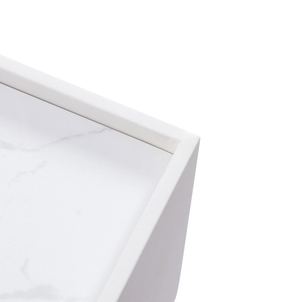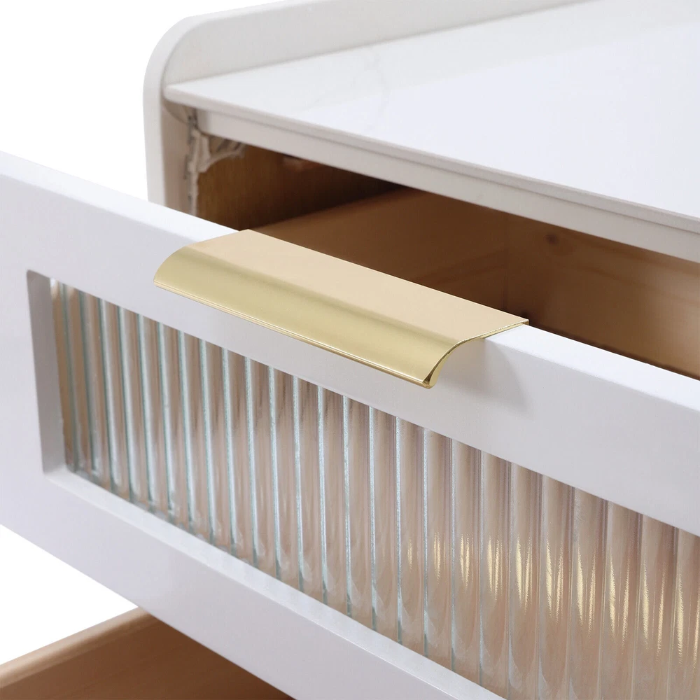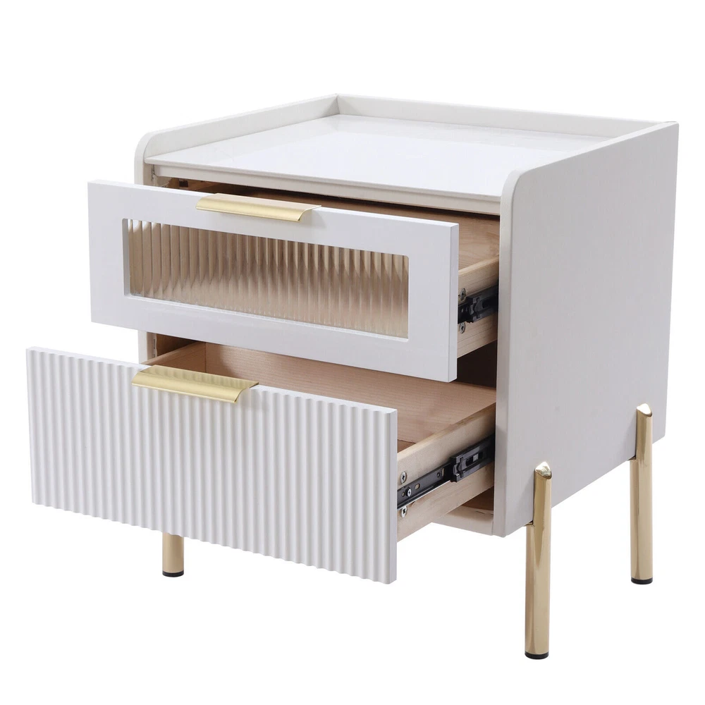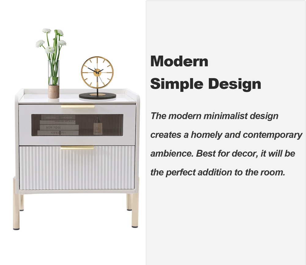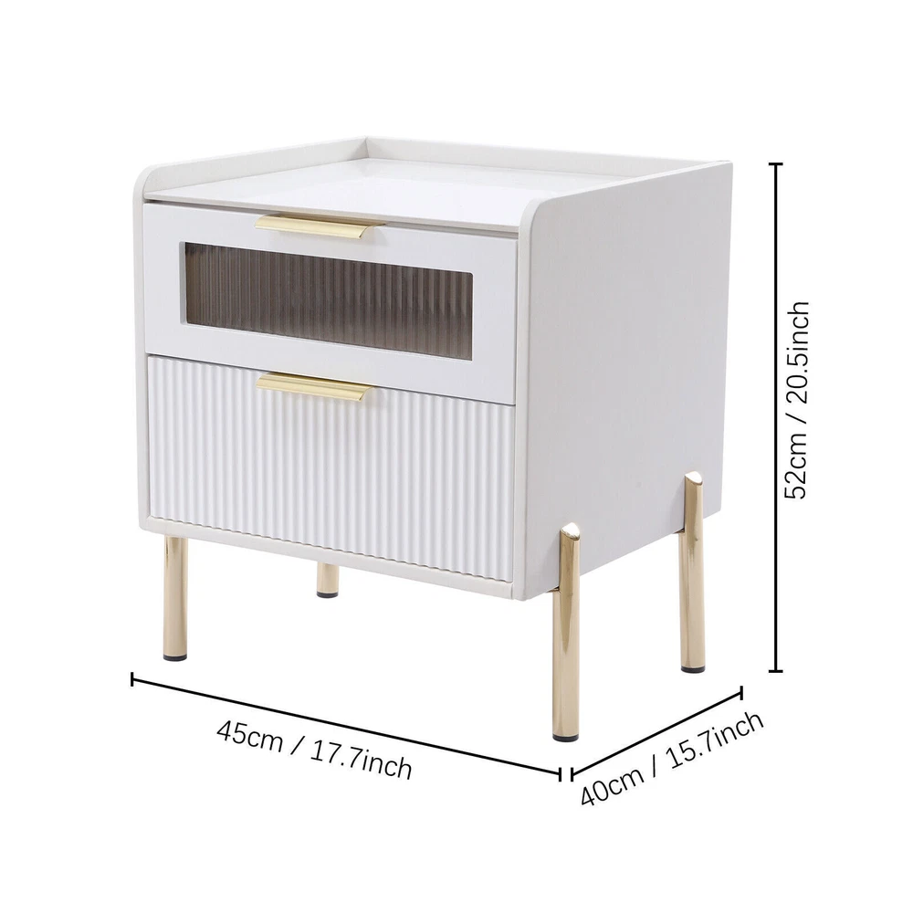 DESCRIPTION 【For rooms】Overall Dimensions of Table:17.7" L x 15.7" W x 20.5" H, It strikes a clean-lined rectangular silhouette.It offers you enough space for your various things. 【Versatile use】This bedside table is versatile. Whether as a coffee table, end table, beside table or console table, it is a space-saving storage table. In addition, its elegant style will give modern accents to beautify your room. 【Smart storage】This modern two-drawer nightstand provides a storage solution for remotes,your favorite books, keepsakes, glasses, and other necessaries at hand. The tabletop is perfect for displaying a lamp, clock, potted plant or photo frame to offer warmth and personalized decoration. 【No assembly required】You only need to simply install four table legs, saving you valuable time and effort. Enjoy a clean and tidy bedroom now. Describe: Product Dimensions: 17.7" L x 15.7" W x 20.5" H Material: Metal+MDF+glass+artificial leather Color: white + gold You only need to simply install four table legs, saving you valuable time and effort. Enjoy a clean and tidy bedroom now. Versatile and modern, leather, metal, glass are paired to create a modern, minimalist vibe. Smart storage, this two-drawer nightstand provides a storage solution for remotes, your favorite books, keepsakes, glasses and other necessaries at hand. Best for decorating,the tabletop is perfect for displaying a lamp, clock, potted plant or photo frame to offer warmth and personalized decoration. On Mar 2, 2025 at 21:29:37 PST, seller added the following information: