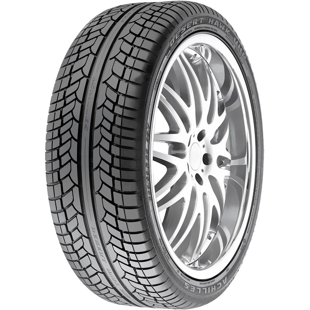 Achilles Desert Hawk UHP FEATURES AND BENEFITS Summer weather traction Hydroplaning resistance Fuel efficient tire Longer lasting tread life Precise steering responsiveness Rim protector OVERVIEW The Achilles Desert Hawk UHP is a high performance summer tire made for passenger vehicles and SUVs. Shop Deals Feedback Contact Us Achilles Desert Hawk UHP *Tread pattern & sidewall design may vary from pictures Specifications Brand Achilles Performance Performance Model Desert Hawk UHP Season Summer Run Flat No Section Width 275 Size 275/40R20 Season Summer Sidewall BSW: Black Side Wall Aspect Ratio 40 Rim Diameter 20 Load Index 106 Tread Depth 10/32 Speed Rating V Rebate Available No Load Range XL Seller Notes New UTQG 400AA Overall Diameter 28.7 Car Type Truck/SUV SKU N898602-99-2 Product Description Attention! Due to the size of the tires, Packages might be SEPARATED in the courier facility and not be DELIVERED on the SAME DAY, even though we do ship them together. Tracking information can be checked by logging on to the courier website with the master tracking number you will receive via email. For example, you can receive 3 tires in one day and the 4th one the next day or the day after, or one tire in one day and the second one day after. We understand that this is a big inconvenience for our buyers, however, this is ABSOLUTELY out of our control. Achilles Desert Hawk UHP FEATURES AND BENEFITS Summer weather traction Hydroplaning resistance Fuel efficient tire Longer lasting tread life Precise steering responsiveness Rim protector OVERVIEW The Achilles Desert Hawk UHP is a high performance summer tire made for passenger vehicles and SUVs. The tire provides superb summer weather traction and it will grip the road excellently in dry and wet weather conditions. The model will, however, not perform well in winter, as the tire compound loses its good traction in colder temperatures. The circumferential grooves in the tread pattern prevent dangerous hydroplaning by eliminating water from below the tire footprint, improving the model's safety in wet weather conditions. The tire compound was manufactured with high levels of silica in it. This further improves the summer weather traction, especially the wet traction, of the tire, while also enhancing other aspects. The tire's rolling resistance is lowered with the higher silica levels, which, in turn, decrease the fuel usage and CO2 emissions of the vehicle. The tire is more environmentally friendly, while also allowing a lower energy usage to achieve the same mileage. The longer lasting tread life is also enabled by the high silica levels. The tread compound equally distributes the driving pressure across the tread area. As a result the tire wears out evenly, because irregular wear is prevented by the tire. The tire is usable for a long period of time, making it more cost efficient. The tread design's solid center rib increases the linear driving stability of the model and its steering responsiveness and accuracy. The tire is swift and precise in its response to the driver's commands, making it effortless to handle. The better controllability ensures that the tire performs the way the driver wants it to, even at high speeds, without issue. The Desert Hawk UHP was manufactured with a specially designed sidewall. The special sidewall design protects the rims from any accidental curb damage, further enhancing the tire's safety levels. Manufacturers recommend changing tires every 10 years. As long as tires are properly stored before they are sold, the year of their manufacture will not shorten their service life. RIM NOT INCLUDED Shipping FAST AND FREE SHIPPING FREE SHIPPING within the lower 48 contiguous States. All orders are shipped with FedEx Ground/Home Delivery. FedEx requires a physical address. We cannot ship to PO BOX, APO, FPO, HI, AK, PR, GU or VI addresses. All Orders placed before 12PM EST (Eastern Standard Time) will be shipped out the SAME DAY. FedEx does not pick up orders on weekends and national holidays. The average delivery time ranges between 1-6 business days. Signature Required delivery will not be processed automatically. Please contact us directly to request Signature Required delivery. Special delivery instructions cannot be provided as FedEx is not able to process them. For Buyers from Missouri or if the order is shipped to Missouri a 4.225% MO sales tax will apply. Sales tax for products that are being shipped to other states is collected and remitted by eBay. For more information see article "Taxes and import charges" Tracking information is made available to the Buyer after an Order is shipped. As the supply chain network is still disrupted due to the current worldwide situation, we're doing everything within our power to ensure orders are shipped as quickly as possible. However, despite our best efforts, shipping and delivery times may change unexpectedly. Please check your Order Status for the most current estimate of the shipping time. Thank you for your patience and understanding. RETURNS EASY NO HASSLE NINETY (90) DAY CUSTOMER SATISFACTION 90 DAYS: We accept Returns within a 90-day period! FULL REFUND: No Restocking Fee will be applied and a Full Refund will be provided if the Item is returned in unused condition. FREE RETURN: Unsatisfied for any reason or just changed your mind? Contact us for help and a hassle-free formal Free Return! FULL ASSISTANCE: If the Item is incorrect, damaged or in any other way not as described, contact us for help! We always work with our Buyers to resolve any issue. By making a purchase, the Buyer agrees to the Production Year (if any) listed in the Item specifics. Prior to submitting the Order, the Buyer must verify that Item specifics are appropriate for their vehicle. Please make sure you are buying the correct Item by double-checking prior to placing an Order; if you need any help please contact our customer service team! By submitting the Order, the Buyer understands that Priority