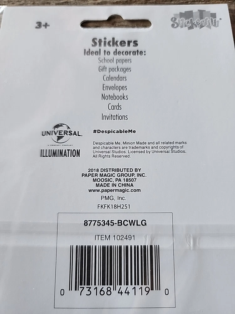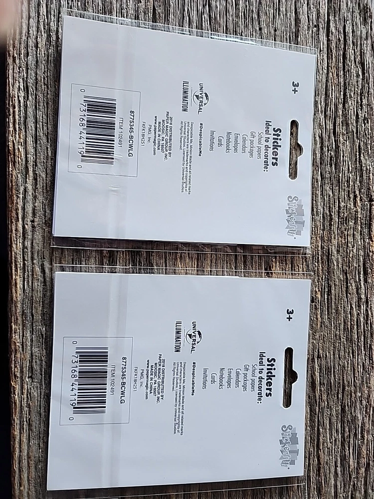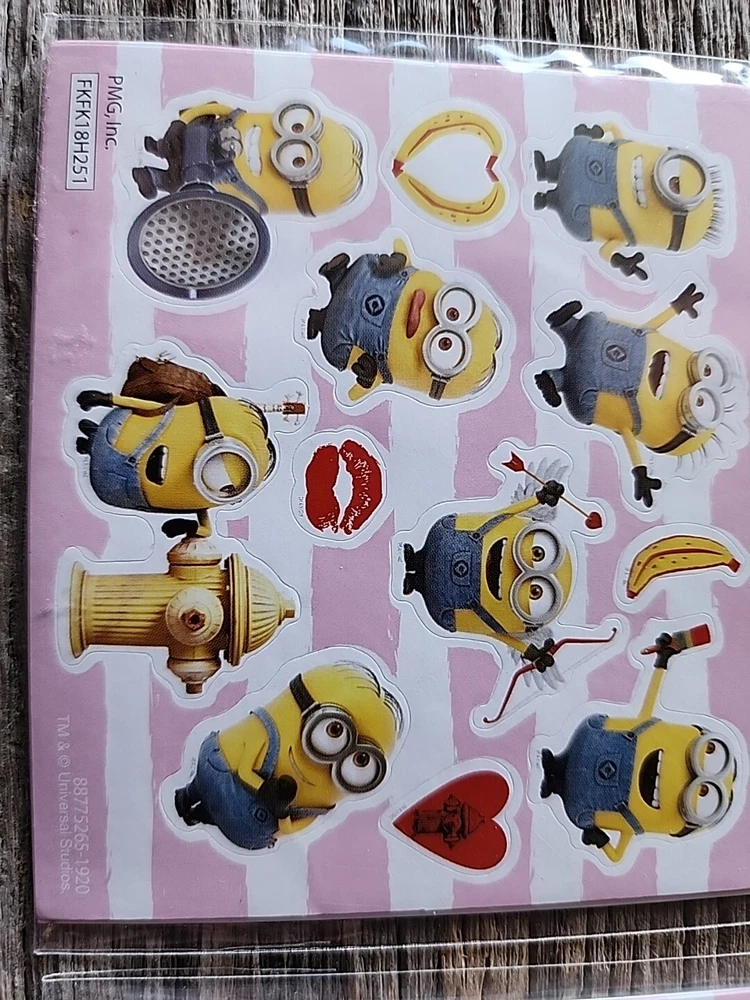 The product is two unopened sticker packs featuring Minions from Universal's Despicable Me franchise. Each pack contains 3 sheets of stickers, totaling to 6 sheets across both packs. These stickers are themed around the popular animated characters and can be used for scrapbooking, crafting, or decorating various items. The stickers are from 2018, making them a collectible item for fans of the Minions and Despicable Me movies. Unopened original packaging excellent condition