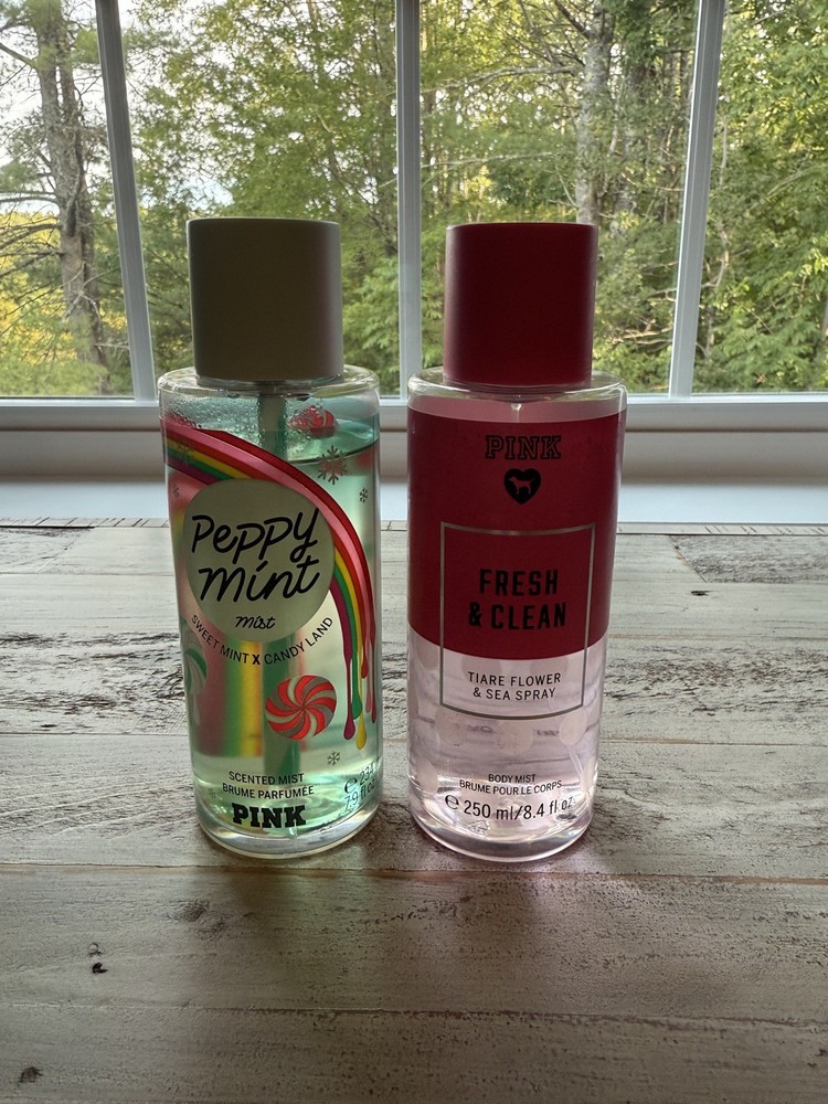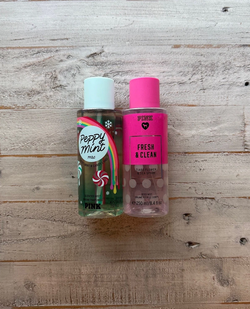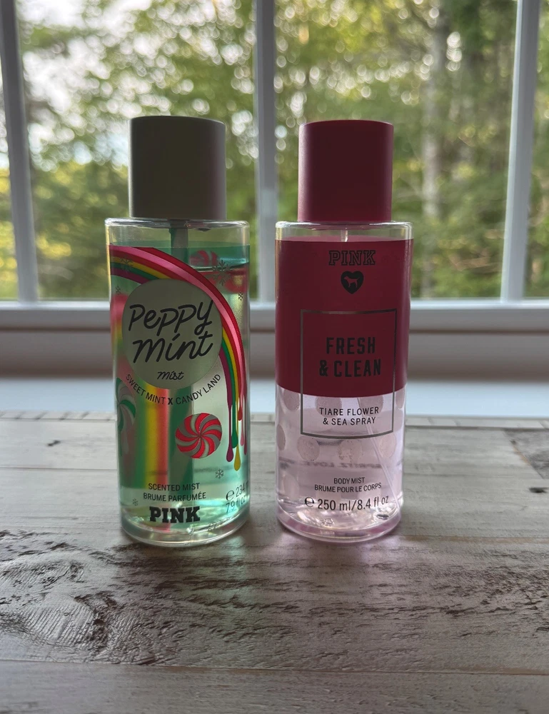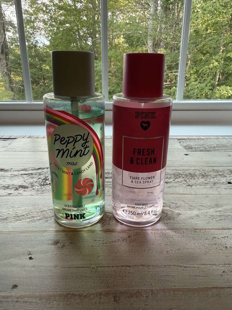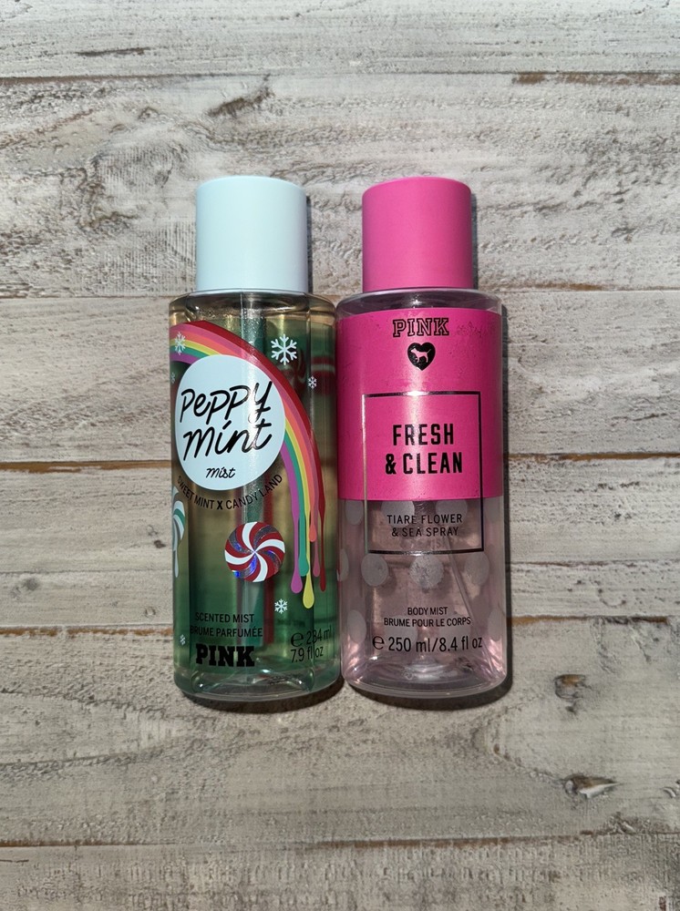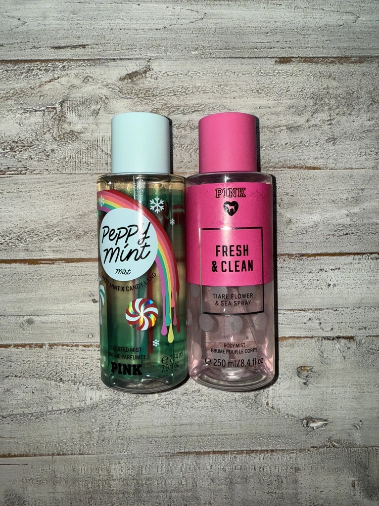 Experience the refreshing essence of sweet mint with Victoria's Secret Pink Peppy Mint Fragrance Mist. This 7.9 oz spray brings to mind the delightful taste of candyland, leaving a trail of cool, sweet scent behind. Its regular size makes it a perfect addition to your perfume collection or a thoughtful gift for someone special. Crafted for those who appreciate a hint of playfulness in their fragrances, this mist boasts a unique formulation that evaporates slowly, ensuring your senses are tantalized by its cool, minty aroma for longer. The iconic Victoria's Secret Pink brand promises a quality scent that's both exotic and alluring. Fresh and clean is more than 2/3 full and mint peppy it’s easier to tell how full it is from the photos but it’s almost full! Both great scents!