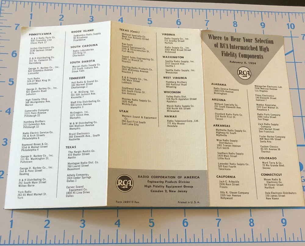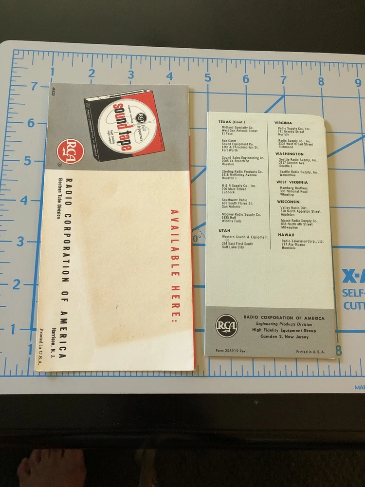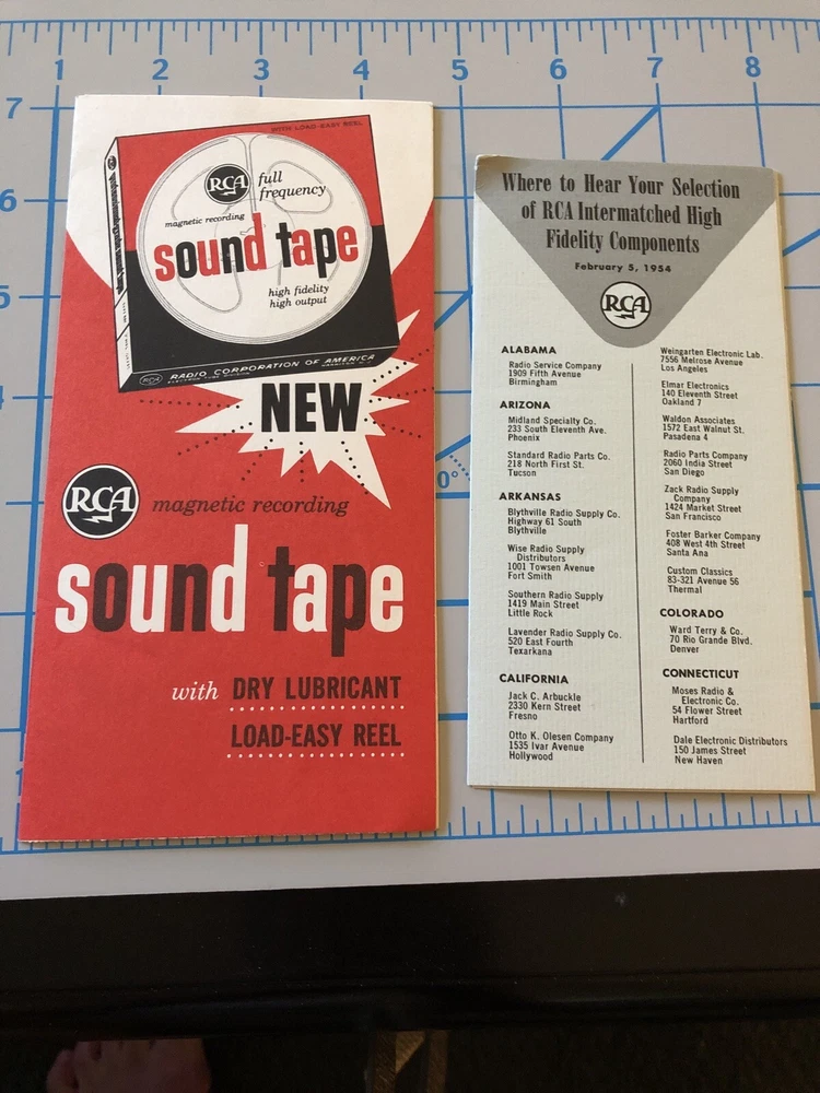 2 Vintage RCA VICTOR Brochure Pamphlets 1 - RCA SOUND TAPE for reel recorders 2 - dated 1954 RCA DEALERS LOCATION LIST Condition is Good. Was Protected in plastic All these years. MAKE OFFER