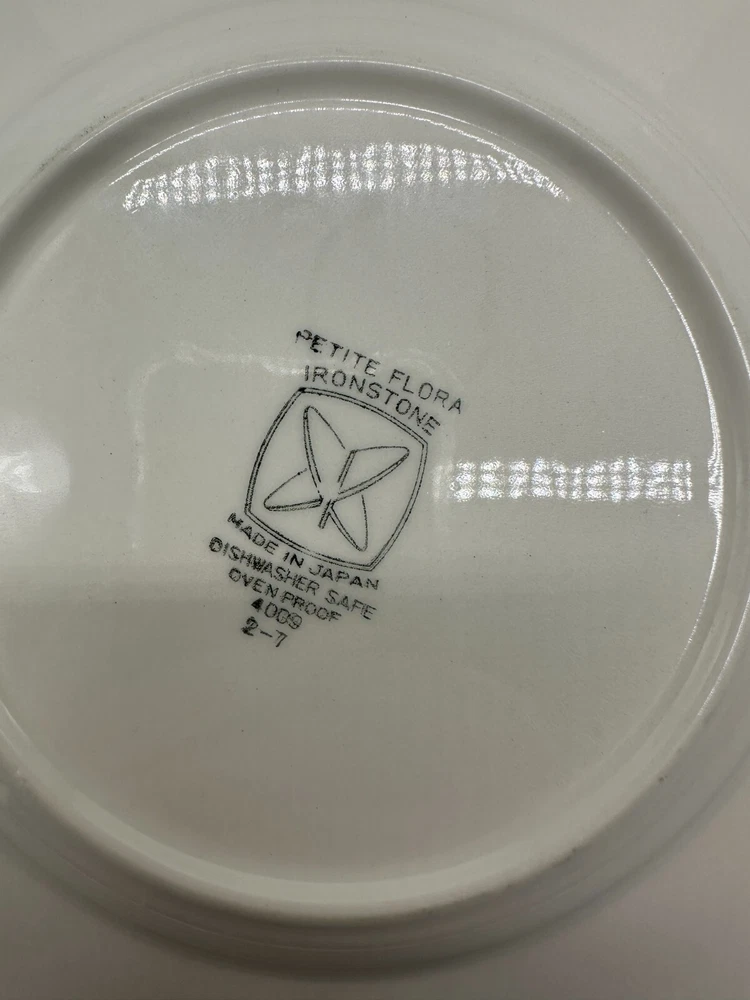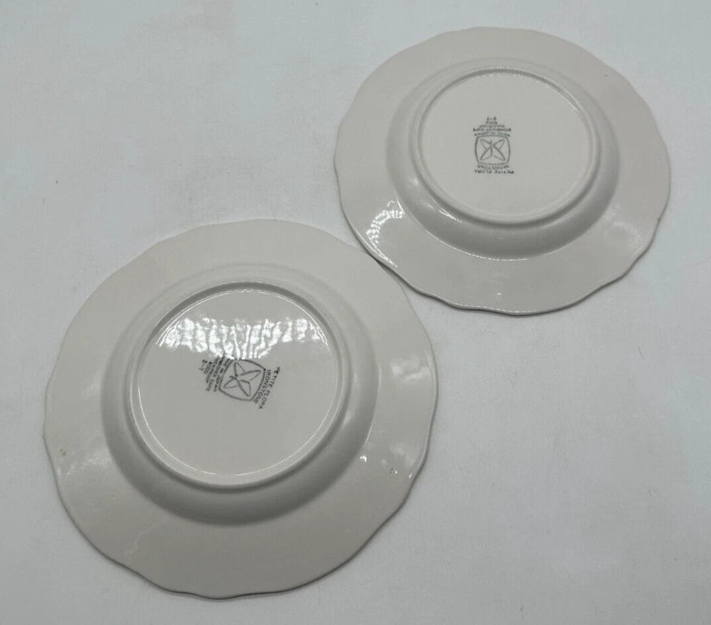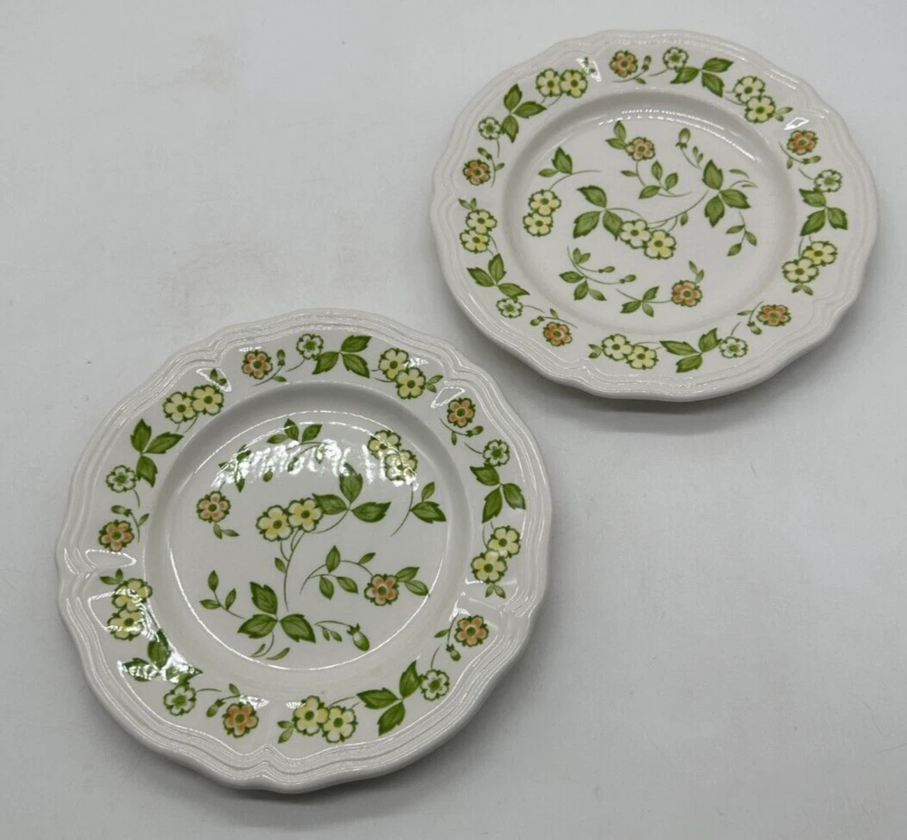 This listing is for a set of 2 vintage Sears Petite Flora Ironstone salad plates, measuring 7 5/8 inches in diameter. The plates feature a floral pattern with white, yellow, and green colors, suitable for all occasions. Made in Japan, they are dishwasher and oven-safe. This French Country-inspired design is perfect for adding a touch of countryside charm to your table setting.