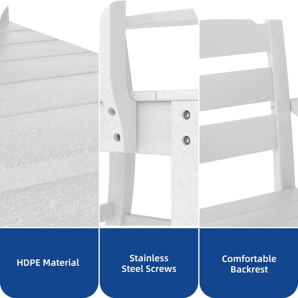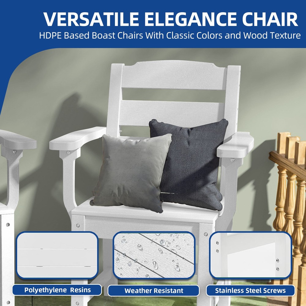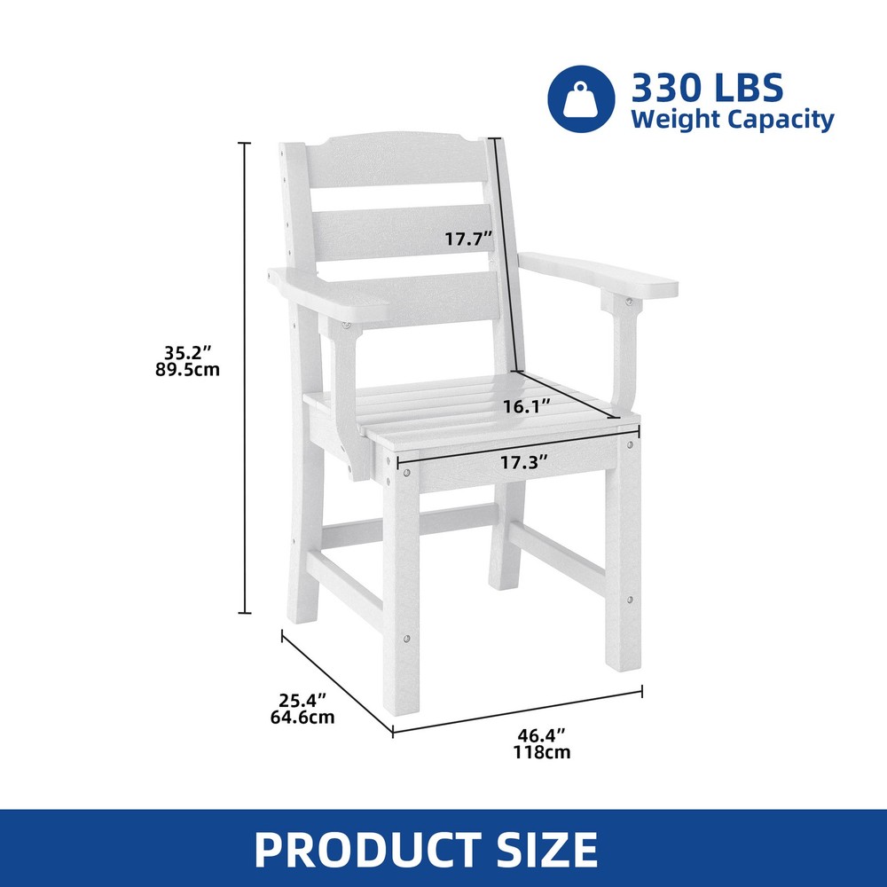 Set of 2 Patio Chairs Outdoor White Bench Garden with Armrest & High Backrest Product Description NOTE: Professional Installation would be Highly Recommended. Description: 1. Color: White 2. Material: HDPE (High Density Polyethylene) 3. Ideal for: Patio Chair, Garden Chair, Balcony Chair, Backyard Chair 4. Room Type: Garden, Outdoor, Indoor, Balcony, Backyard, Greenhouse, Side Pool, Sunroom, Patio, Porch 5. Special Features: High Backrest, Armrest, Wheather Resistant, Stainless Steel Screw, Anti Rust Features: 1. Enhanced HDPE for Lasting Outdoor Use Our outdoor dining chairs are built for endurance! Constructed from enhanced HDPE material, they offer superior durability and strength over traditional rattan. They're highly resistant to rust, peeling, and fading, making them ideal for outdoor use in any strong weather conditions. 2. Spacious Seating for All Body Types Experience ultimate comfort with our patio dining chairs! They feature a sturdy backrest and wide armrests for a comfortable seating experience. With a generous seat depth of 16.15 inches and width of 17.32 inches, the spacious design is friendly for larger individuals, ensuring everyone relaxes with ease. 3. Easy-Clean Resin Surface Keep your outdoor space looking great with minimal effort! These resin outdoor chairs feature smooth surfaces that clean easily with just soapy water, requiring no special maintenance. Plus, recessed stainless steel screws effectively prevent snagging, ensuring both convenience and safety. 4. Timeless Style for Any Outdoor Space Elevate your patio with these HDPE chairs! They boast a minimalist design with classic colors and a wood-like grain texture that exudes natural sophistication. They effortlessly match with the same table or your existing setup, perfectly complementing your patio, courtyard, garden, backyard, and porch for versatile elegance. 5. Quick Setup for 2 Chairs Get ready to relax fast! Measuring 21.46"L x 23.23"W x 35.24"H, this outdoor chairs set of 2 comes in 1 package with comprehensive instructions. You can follow the steps for a quick 20-minute assembly per chair. Dimensions: 1. Product Dimensions: 23.2 " (L) x 21.5" (W) x 35.2"(H) 2. Backrest Height: 17.7" (H) 3. Seat Depth: 16.1" (W) 4. Seat Length: 17.3" (L) 5. Weight Capacity: 330 lbs. 6. Item Weight: 52.9 lb Package Included: 2 x Patio Chair 1 x Accessory Kit 1 x Manual Book Shipping 1. Normally the item will be dispatched within 1 business day if payment is cleared before 12pm PST. 2. Please verify the correct shipping address in your PayPal account before making the payment. 3. We only dispatch the item to the address that is sent to us at the time of checkout. 4. We don't ship to Hawaii, Alaska, Puerto Rico, APO/FPO/PO Boxes. 5. We don't provide local pick-up service. 6. Normally we will use USPS, UPS, FedEx & LTL to dispatch items. Payment 1. We accept PayPal and credit card. 2. We will ship to the confirmed Paypal shipping address that is provided with the payment only. Return 1. 30 days Money Back Guarantee. 2. Please contact our customer service to receive a RMA form first if want to return the item. 3. All returned items MUST in new condition with the original package. Contact If has any problem, please contact us by sending an ebay message. Our customer service will resolve the problem as soon as possible. On Dec 11, 2024 at 01:01:10 PST, seller added the following information: On Jul 24, 2025 at 08:28:11 PDT, seller added the following information: