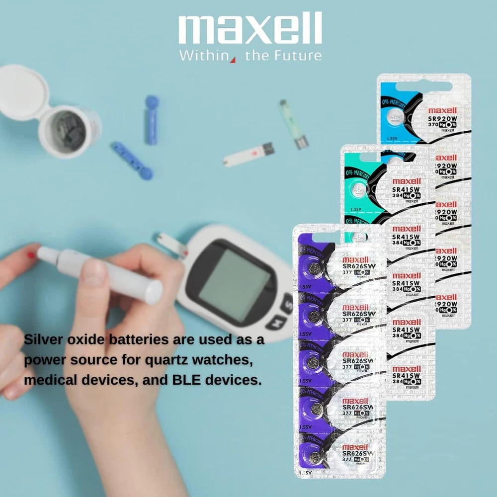 Maxell 377 SR626SW 0% Mercury 1.55 Nominal Voltage, Silver Oxide Watch Battery Lightweight, high-energy density, and stable discharge battery Leakage Resistance Design Blister Package: Original Hologram Packaging Used as a power source for quartz watches, medical devices, keyless remote entry systems, and more Maxell 377 SR626W 0% Mercury 1.55V Silver Oxide Watch Battery (Pack of 2) - Maxell is the first company in Japan to successfully market button-type silver oxide batteries and has many years of experience and know-how. Also, in consideration of the environment, all products are designed to use zero mercury.
