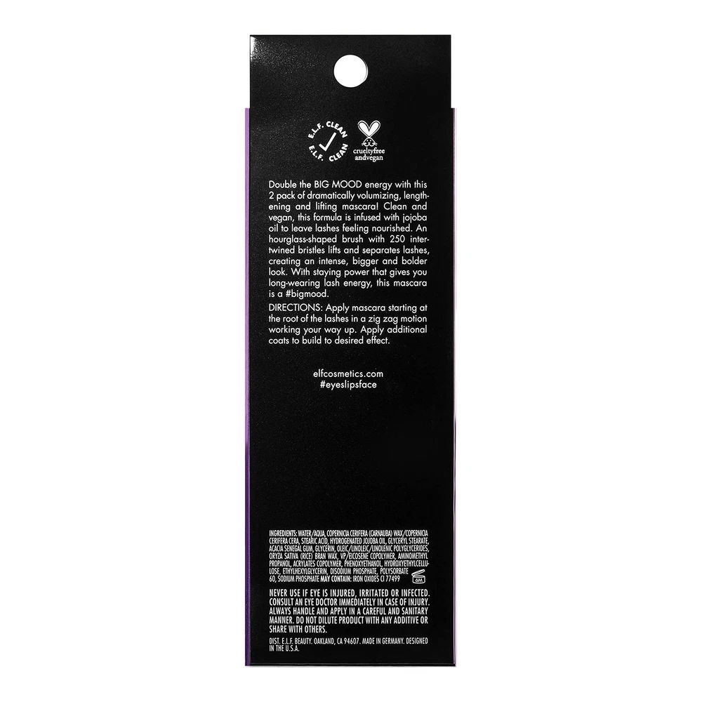 CREATES BOLD & LIFTED LASHES; e.l.f. Big Mood Mega Volume & Lifting Mascara is a volumizing mascara that takes your lashes to the next level with bold volume and chart-topping lift SEPARATES LASHES WITHOUT CLUMPING; Featuring an hourglass shaped brush with intertwined bristles, this mascara is incredible for distributing the right amount of mascara, building volume, and separating lashes for an extra bold look. RICH, SMUDGE-PROOF FORMULA; The richly pigmented formula creates lashes that won't flake or smudge. LONG-LASTING CURL; Infused with Jojoba Wax to hold the curl of your eyelashes for long-lasting, curled and voluminous lashes. SKIN-LOVING INGREDIENTS; All e.l.f. products are made from skin-loving ingredients you want, minus the toxins you don’t—all at good-for-you prices. All e.l.f. products are 100% cruelty-free and Vegan.
