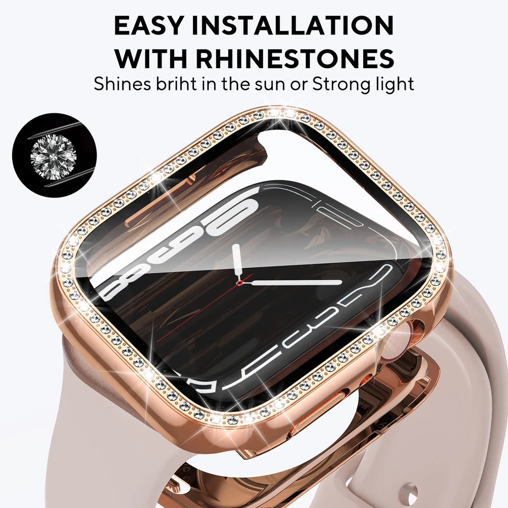 【For 41mm】This bling waterproof apple watch case with back cover is designed for Apple Watch Series 8 / 7 41mm. (Please confirm the size by checking the size mark on the back of the watch.) 【2 in 1 Full Protection】The design of the back cover makes the touch more sensitive. This new case make of hard PC material, built-in 9H tempered glass screen protector and back cover, protects your apple watch from dust, bumps, shatter, scratches and accidental drops in 360 degrees, protect the iwatch from everyday life. 【BEST GIFT】The bling apple watch cover set with sparkling rhinestones, turns sport watch into an elegant and stylish eye-catcher, shines bright in the sun or strong light, sparkle you all angle in any occasions and help you get many compliments. A best Birthday / Christmas / Anniversary / Thanksgiving Day / Mother's Day etc. gift for your friends, wife, mother, or even as a gift reward yourself to show on the party. 【Daily waterproof 】The built-in seal ring keeps water away from screen, the water will not seeps through the screen protector, which means you no longer need to remove case repeatedly and wipe water. (The old design case of others may cause the touch sensitivity to decrease disk when you wash your hands or take a bath etc.) 【Easy to Install and Charging】 Charge directly, don't need to take off the appe watch case and band. The back cover case is easy to install and remove, the instruction and a tool is included in package. We offer a two-year warranty with unconditionally refund or free replace if defective or any quality problems. Via "Login Amazon" → "Your Account" → "Your orders" → "Ask Product Question".