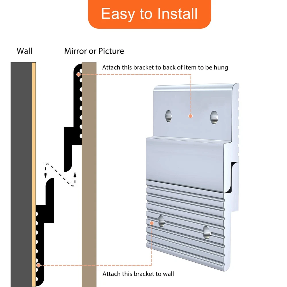 【Wall Hangers Heavy Duty】: Our french cleat hanger is made of 6mm thickness aluminum, sturdy and durable to support max 30 lbs. No worry for hanging safety 【Invisible Mirror Hanging Hardware】: These mirror hanging hardware can be completely invisible after settled, great for hanging photos, mirror and other arts. Give you a clean and beautiful decoration 【Easy to Install】: you can use your screws and 4 * M5 holes for installing. Another interlocking design help to remove your design easily, just need to lift the picture or mirror, then remove hangers directly 【Wide Application】: Z bracket is an ideal tool for hanging Hanging Panel, Whiteboard, Cabinet, Shelf, Headboard, Art, Frames,Pallet, Pictures, Mirrors, Photo and more. You can change your design easily, create a new look wall art at home from time to time 【Packing List】: We provide 10 pairs 2 inch headboard mounting brackets, with NO Screws. NOTE: You will need to purchase your own screws to install.