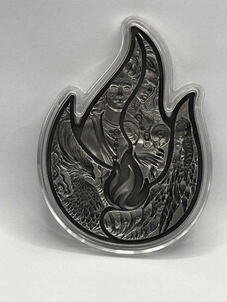 The product is a 2 oz silver Stacker Eternal Flame coin with a fineness of 999. It is minted by Today LTD and comes with certification. The item has dimensions of 7" in height, 7" in length, and 5" in width, with a weight of 1 oz. The design features an eternal flame motif.