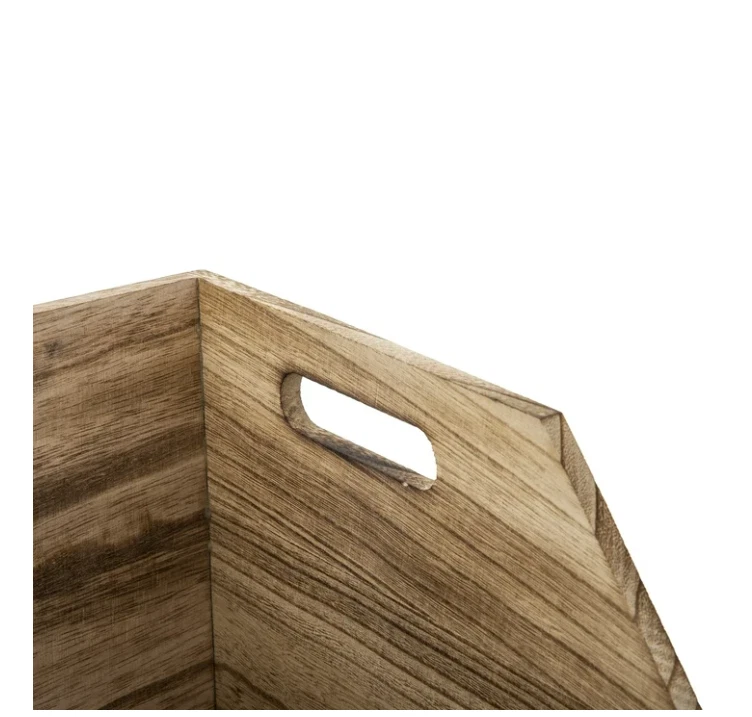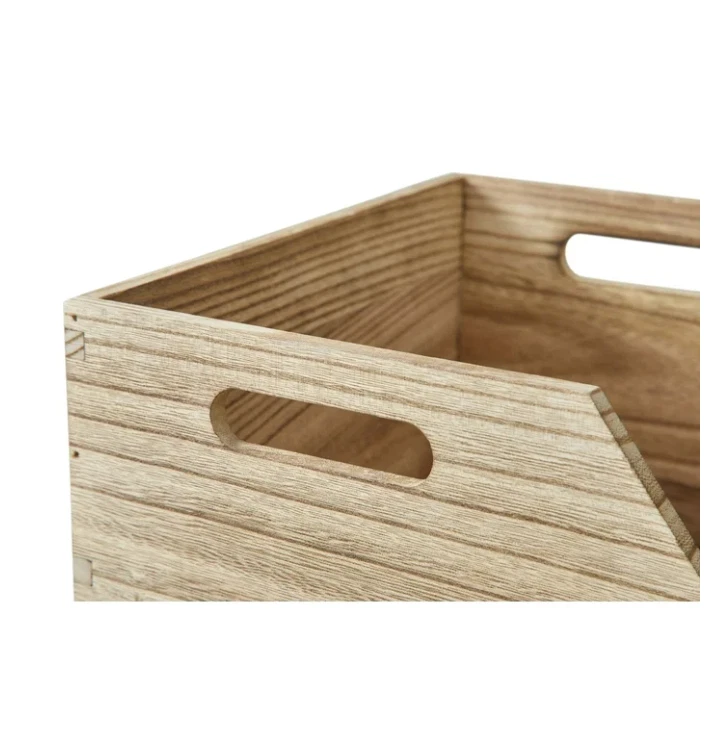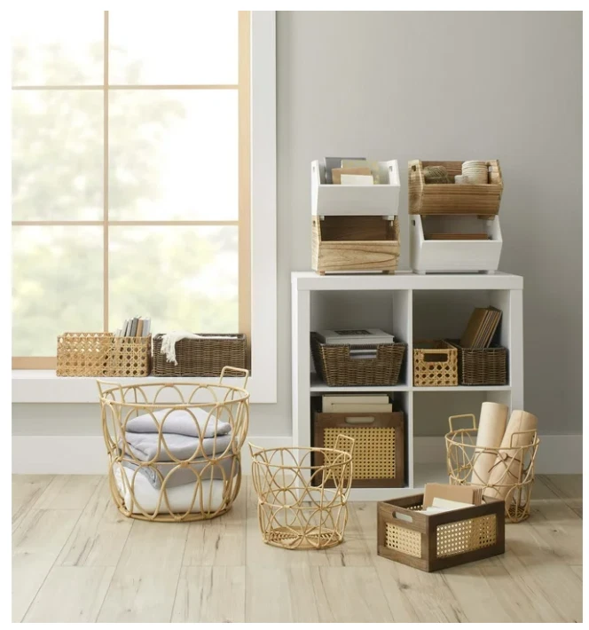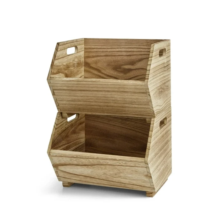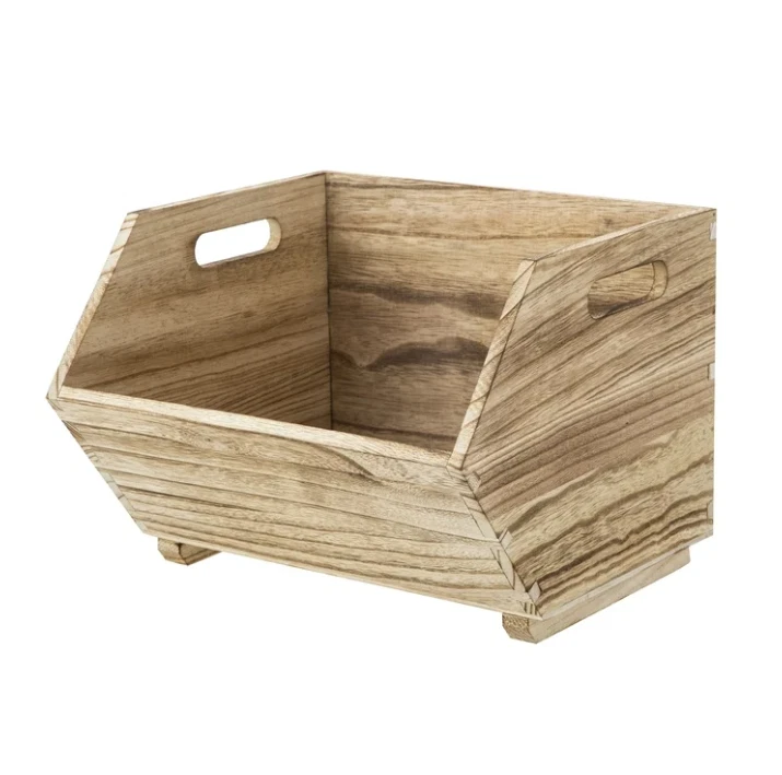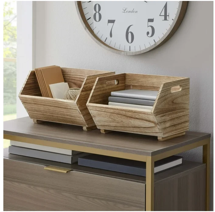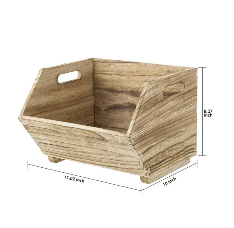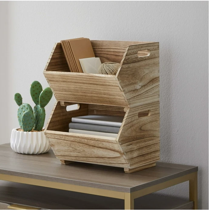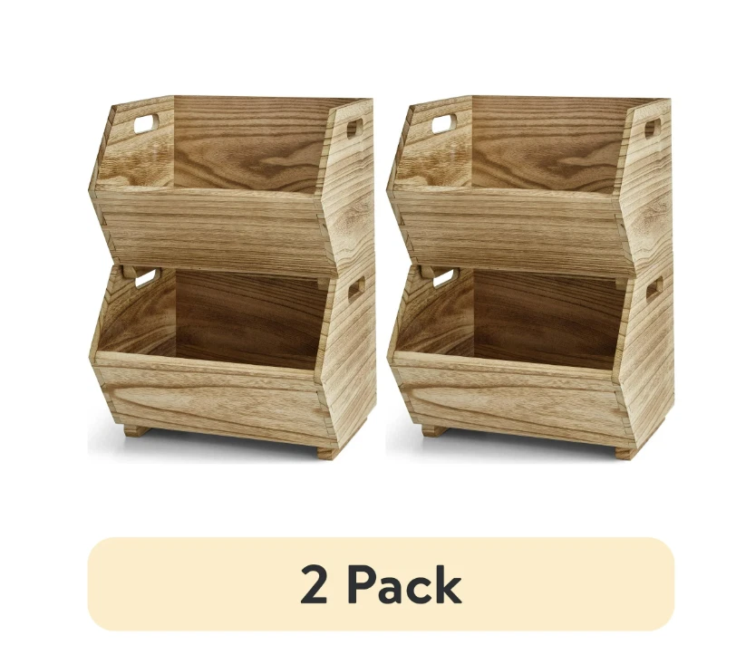 (2 pack) Better Homes & Gardens Adult Natural Wood Stacking Storage Bin Set About this item Product details The Better Homes & Gardens Natural Wood Stacking Bin Set, 2-Piece allows you to tidy up your space in an attractive manner. These bins measure 11.02" L x 10" W x 8.27" H, and are sized to ideally be placed on a shelf, tabletop, or even the floor. You can stack them on top of one another to help conserve space or display them individually. Crafted of sturdy wood materials, these baskets are a great option for storing toiletries, cleaning supplies, remotes, small electronics, books, and much more. These lovely baskets are designed with two reliable cut-out handles to easily carry and move your stored items. The Better Homes & Gardens Natural Wood Stacking Bin Set, 2-Piece is perfect for bringing more organization and order to any space. The versatile natural tone beautifully complements a wide variety of home décor styles. This item can also be stained for a DIY project. Includes two stackable baskets Cut-out handles for easy transport Durable wood construction Versatile natural tone Can be stained for DIY projects