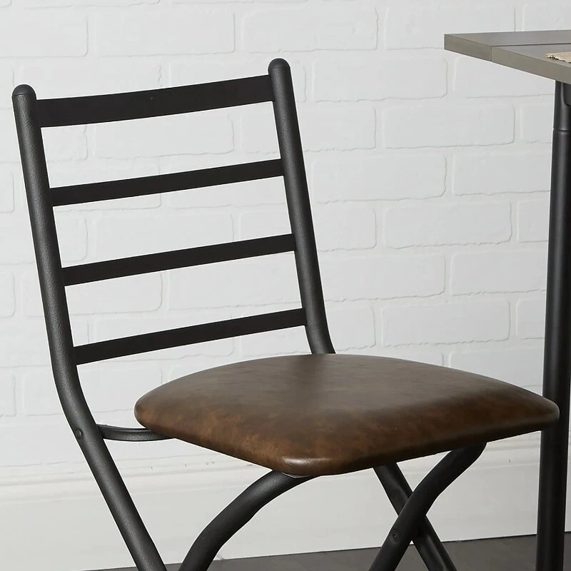 SLAT FOLD CHAIR Vegan Leather Cushion Sturdy Black Metal Frame Supports an Adult up to a 300 lbs. capacity Minimal Assembly Easy Fold Up For Easy Storage Foot Rest Accents Well With Most Décor Styles Package Dimensions:17.75″x13.75″X36.25″ Chair Dimensions:17″x18.63″x29.88″