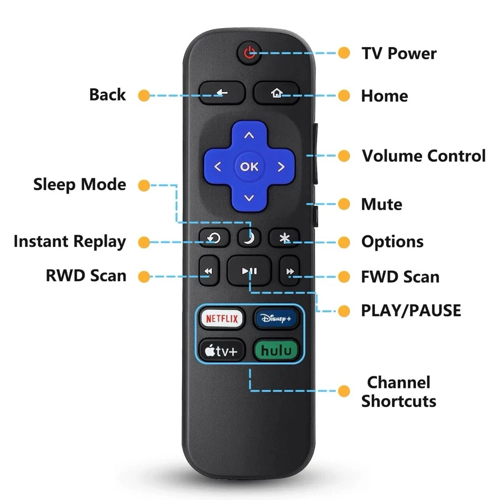 About this item: 2 pack Remote Control Replacement for All Roku TVs. These remotes work with ALL ROKU TVS. Thse will not work with roku stick or roku box. Two-pack remote control can solve your home backup remote control needs.Just Insert 2 Pcs*AAA batteries to get it work(Batteries and manual are not included) PREMIUM MATERIAL: it is made of premium ABS plastic and silicone. In addition to being comfortable and durable, the buttons are soft and respond sensitively.