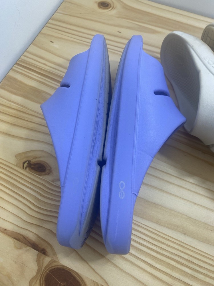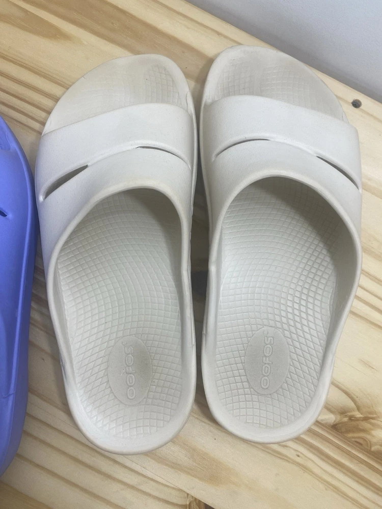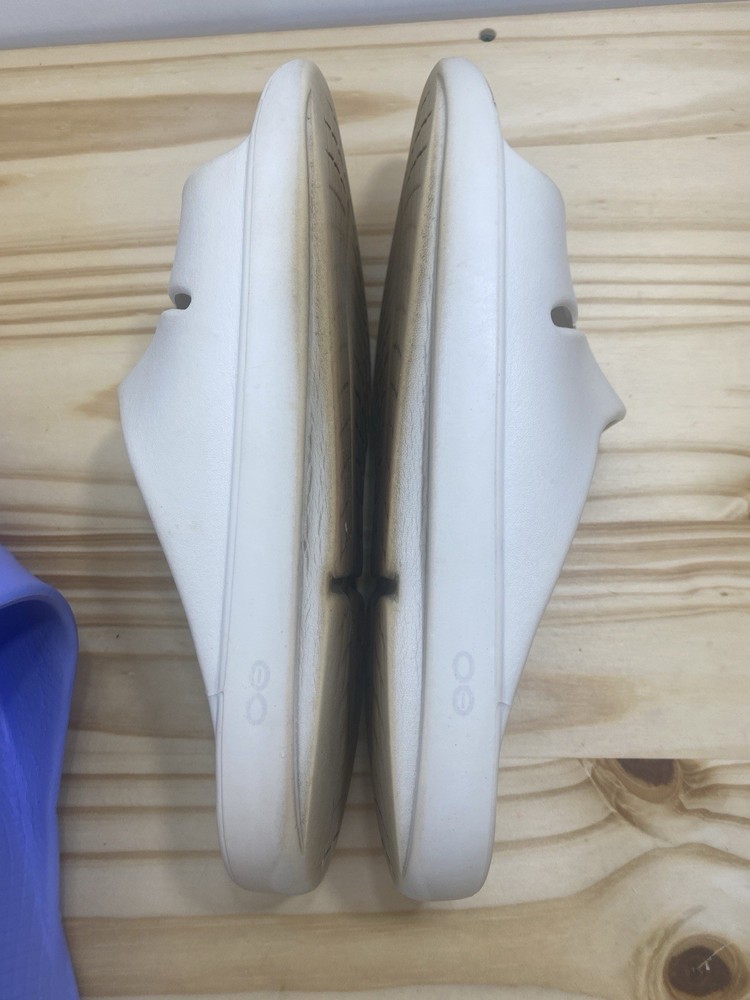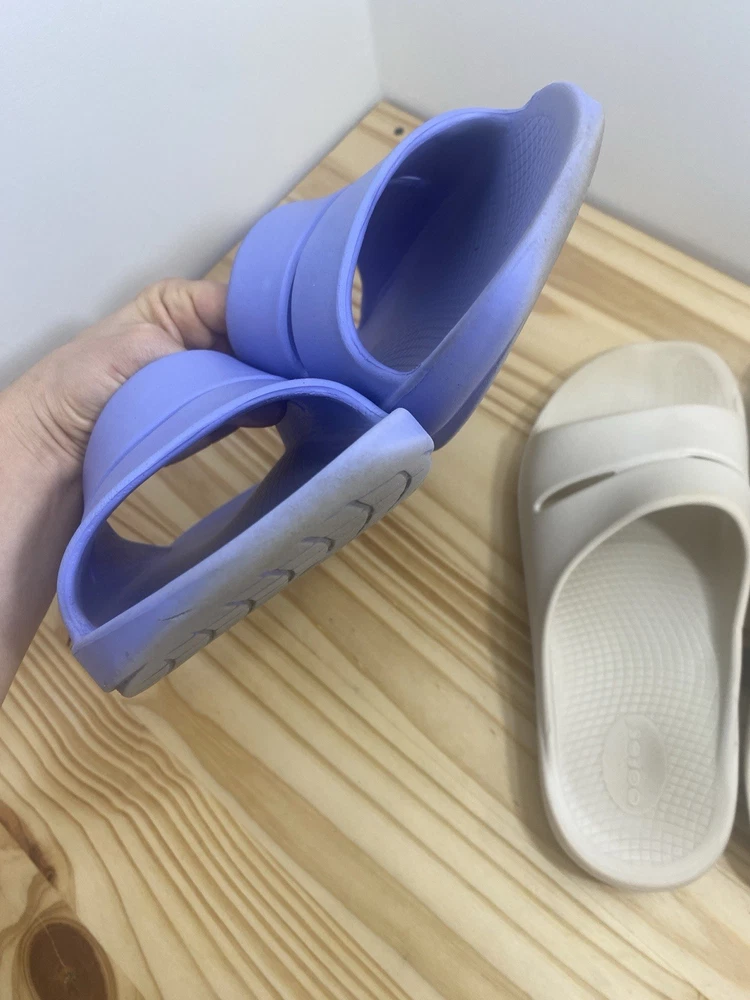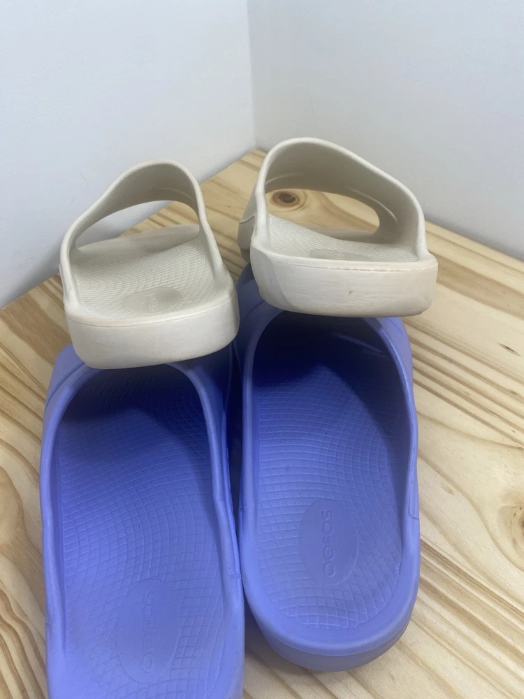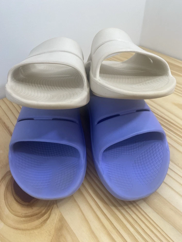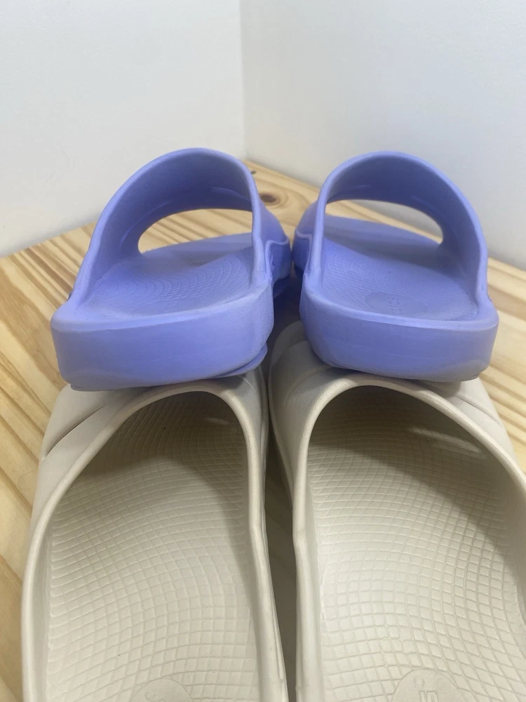You get both pairs! Both are preowned, size men’s 11 / women’s 13 One pair is beige/off white the other is light purple The purple pair has a spot where a thorn was removed from the bottom and they have small cuts and scratches from light use but it does not affect look, feel or function. They are VERY comfy slides!
