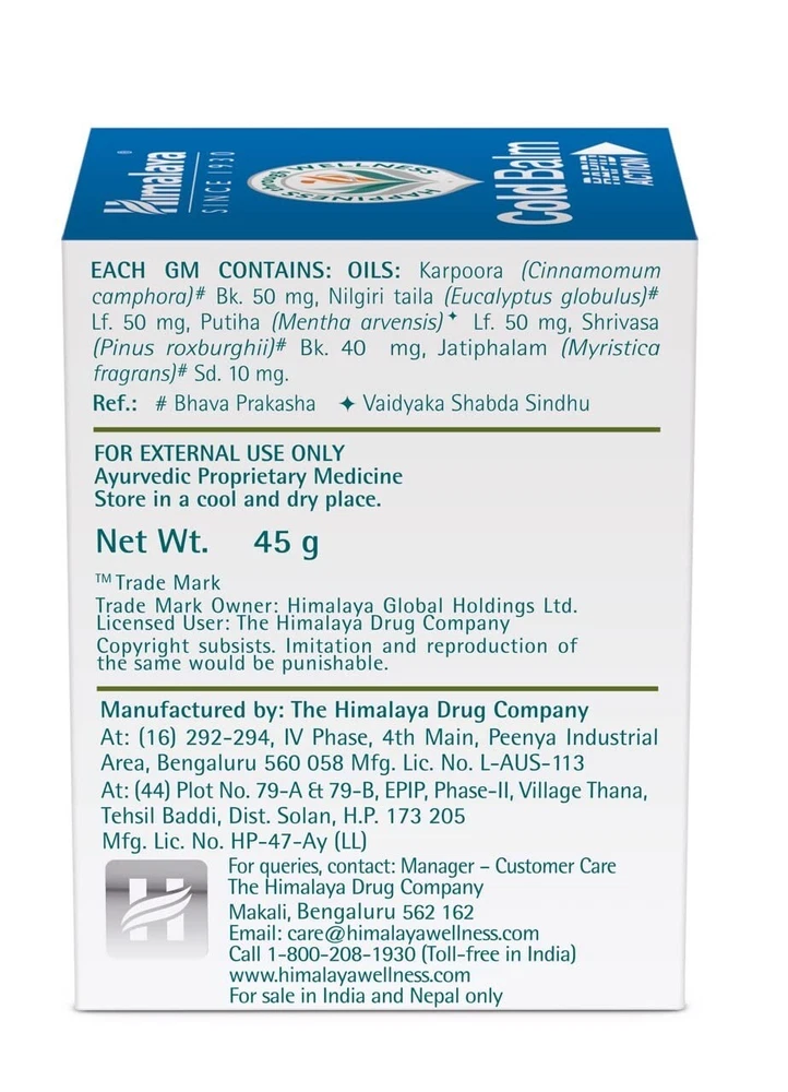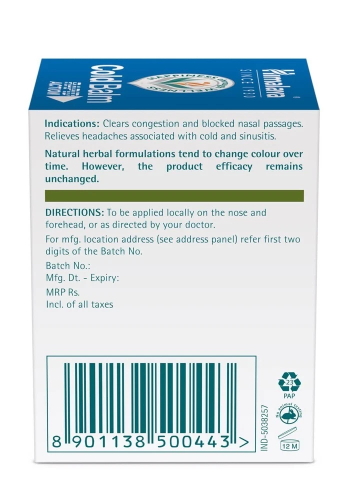 Himalaya Cold Balm | Relieves Blocked Nose & Congestion | Goodness of Herbs Pack of 2 ( 45g Each ) Description: The **Himalaya Rapid Action Eucalyptus Cold Balm** is a natural and effective solution for **nasal and chest congestion relief**. Formulated with **blue gum tree oil, camphor oil, and mint oil**, it helps clear **blocked nasal passages**, relieves **sinus headaches**, and provides a **cooling sensation** for enhanced comfort. It is an **Ayurvedic proprietary medicine** that works rapidly to provide relief from colds, flu, and congestion. Key Benefits: Provides **rapid relief from nasal and chest congestion**. Alleviates **headaches associated with colds and sinusitis**. Contains **blue gum tree oil** for a **cooling effect** that eases breathing. Nutmeg oil **stimulates blood flow**, accelerating relief from discomfort. Turpentine oil helps reduce **skin irritation and redness**. 100% Ayurvedic formulation with **no harmful chemicals**. Ingredients: Blue Gum Tree Oil, Camphor Oil, Mint Oil, Nutmeg Oil, Turpentine Oil How to Use: Apply **locally on the nose, chest, and forehead**, or as directed by a healthcare professional. Himalaya Cold Balm / Himalaya Rapid Action Cold Balm / Himalaya eucalyptus balm / Cold relief balm / Best balm for congestion / Herbal nasal congestion relief / Sinus relief balm / Natural balm for blocked nose / Ayurvedic remedy for congestion / Fast relief cold balm / Best balm for chest congestion / Himalaya congestion relief balm / Ayurvedic cold and flu remedy / Himalaya cold balm for blocked nose / Best balm for sinus headache / Herbal remedy for flu symptoms / balm for colds / Mint oil cold balm / Best natural decongestant balm / Himalaya Balm Payment We accept eBay Management worldwide for secure and hassle-free transactions. Important: All customs clearance, taxes, and other charges (if applicable) are the responsibility of the buyer. Shipping We ship via Shiprocket or DHL Worldwide, with dispatch within 2 business days upon payment confirmation. Delivery typically takes 11-25 days after dispatch, depending on location and serviceability. In rare cases where delivery to your area is not possible, a full refund will be provided. Important: Please provide your mobile number during payment as it is required for shipping services. Handling times do not include weekends or public holidays. Return Policy We stand by the quality of our products. Returns are accepted for items with a manufacturing defect. Buyers must contact us within 2 days of receiving the item to initiate the return. Refunds will be issued as money back, provided the item is returned in its original condition. Return shipping costs, including shipping, insurance, and any duties, must be borne by the buyer. Note: Please notify us prior to returning an item so we can assist and guide you through the process. Order Now at This Special Sale Price!