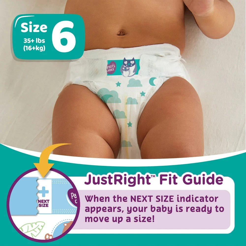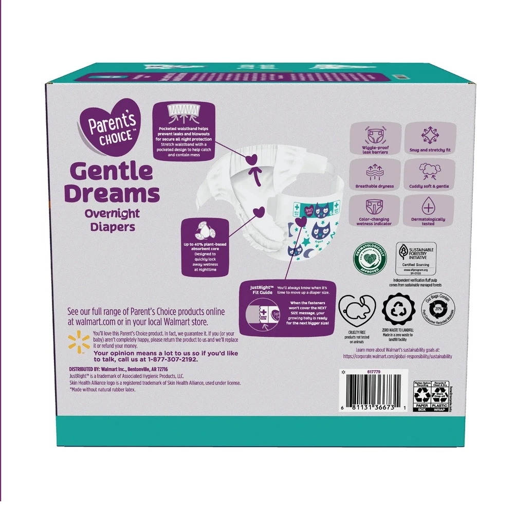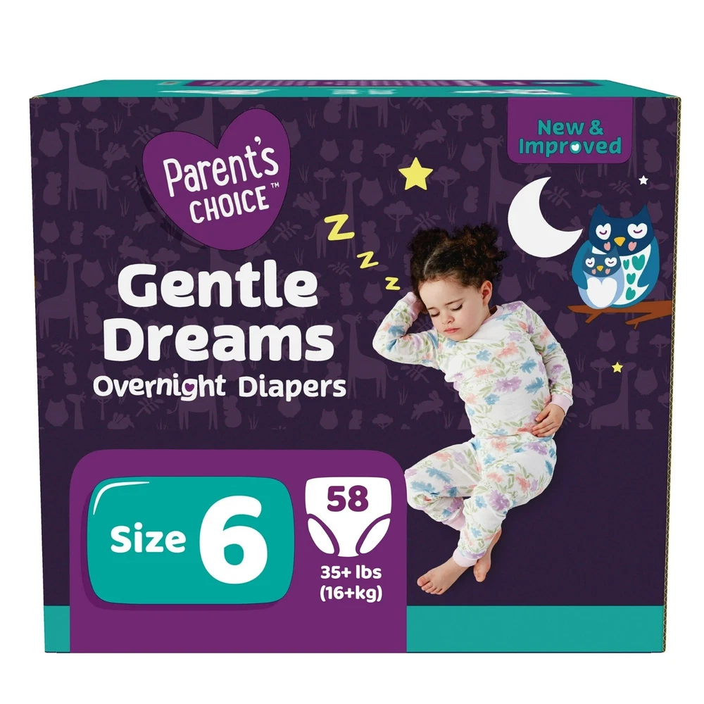 2 x Parent's Choice Gentle Dreams Overnight Diapers, Size 6, Total 116 Count Parent's Choice Gentle Dreams Overnight Diapers help keep your baby dry and comfortable. The diapers' wetness indicators will change from yellow to blue, letting you know when it's time to change your baby's diaper. Their gentle but snug fit helps protect from leaks at the back, waist, and legs. Each diaper is made without natural latex, lotions, and perfumes so you can trust they will be gentle on your baby's skin. Choose from two stylish, fun prints in multiple sizes and bring home our Parent's Choice Gentle Dreams Overnight Diapers today. At Parent's Choice, our mission is simple: we're committed to delivering quality diapers to help keep little ones dry, comfortable, and happy. Our diapers are dermatologically tested and made without latex, fragrance, and lotions to help maintain baby's naturally healthy skin throughout the day or night. Parent's Choice Gentle Dreams Overnight Diapers Size 6, 58 Count (Select for More Options) Enhanced absorbency for up to 12 hours of nighttime protection Wetness indicator changes from yellow to blue Made from extra-soft breathable materials for ultimate comfort Dermatologically tested Available in 2 stylish and fun prints Features Disposable, Absorbent Size Size 6 Diaper Size Size 6 Minimum Weight 35 lb Gender Unisex Count 58 Disposable Baby Diaper Type Overnight Diapers Material Not Available Model B0103756 Brand Parent's Choice Assembled Product Dimensions (L x W x H) 11.38 x 9.82 x 10.27 Inches