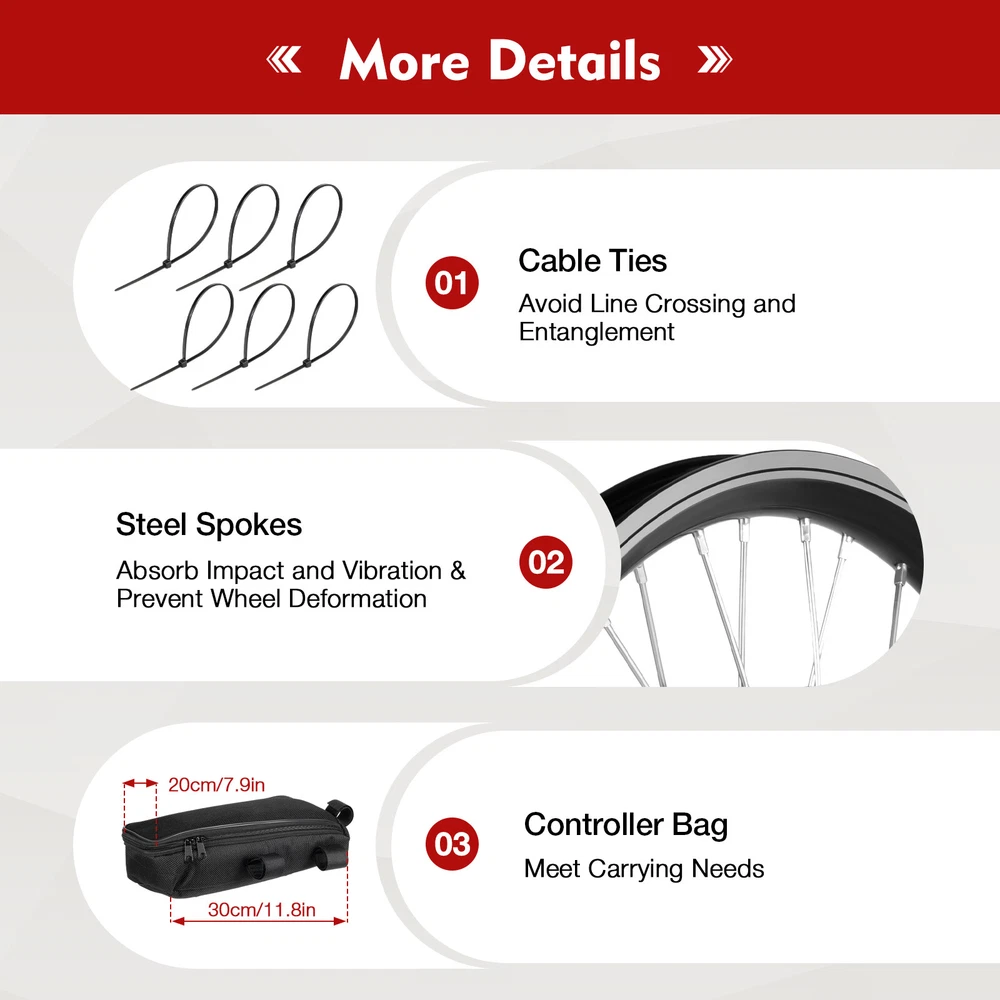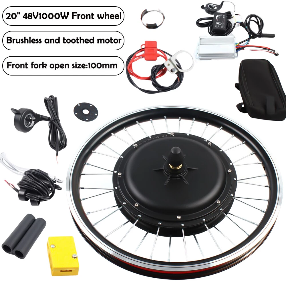 20" 48V 1000W Brushless Toothless Motor Front Wheel E-Bike Conversion Kit NOTE:This product does not have tires, the kit is suitable for installing 20-inch tires. Note : while connecting the controller to the wires, please make sure that you connect the right colors to the controller. Otherwise, the controller may be broken. About the battery: The power and voltage of the battery (not included) you buy should be consistent with our set. When installing, make sure that the wiring is not reversed.Otherwise, it may damage the product. Note: Not waterproof, please do not drive on rainy days Features: 1. 48V 1000W Brushless and toothless motor specification, strong and powerful. 2. Come with powerful controller guarantee big current supply. 3. Suitable for both V brake and Disc brake. 4. The maximum speed of the motor will be 50km/h. 5. The open size of the front fork is 100mm 6. Thumb Throttle 7. The size of the rim is 20"(Suitable for 20 inch bike). 8. Crank speed sensor for pedal assist. Specifications: Condition: 100% Brand New Optional Type: Front Motor Motor Specification: 48V 1000W Speed: 50KM/H Front fork open size: Approx. 100mm / 3.9in Brake: V brake/disc brake Controller: 48V 30A Assist: 5 magnetic point assist sensor Brake Lever: Power cut-off brake lever Throttle: Thumb Throttle Display: SW-810LED Display Wiring Mode: Waterproof wire for outgoing motor, common wiring for other Package List: 1 * Motor 1 * Controller 1 * Assist 1 * Electronic power brake 1 * Thumb Throttle 1 * LED Display 1 * Waterproof Wire 1*Controller carrying case Payment Delivery details Terms of sales About us Contact us Payment We accept ebay payment 。 Fees such as import duties, taxes are not included in the item price or shipping costs. These charges are the buyer's responsibility. Delivery details Shipping: 2-9 working days to: USA Terms of sales We maintain high standards of excellence and strive for hundred percent customer satisfaction. Feedback is very important to us. We hope that you contact us immediately before you give neutral or negative feedback, so that we can address your concerns. It is impossible to address issues if we do not know about them! About us Your satis faction is our ultimate goal. We work hard to earn your trust and future business. Our certified technicians have tested each item before shipping. The unit comes with 1 year limited warranty on all manufacturing defects. a) If you receive a defective item, you may return it or ask for a discount. Please contact us within 14 days after you receive the package. b) What you returned must be intact and in its original packaging as re? u. Customer is responsible for shipping costs of the returned item. c) We will cover the cost of shipping back t with the shipping rate indicated in the registration page. We will send you a new unit or refund the full payment you paid. Thank you. Contact us Business Hour Business Hour: Monday To Friday: 8:30 AM to 5:00 PM (Beijing China time) Due to time zones, our reply to your questions may not be immediately. But within above working time, we will reply your email within 24 hours. If it's non-workdays, please kindly be patient and wait till Monday. Please contact us with ebay message. Please feel free to contact us if you have any questions. Monday To Friday: 8:30 AM to 5:00 PM (Beijing China time) Due to time zones, our reply to your questions may not be immediately. But within above working time, we will reply your email within 24 hours. If it's non-workdays, please kindly be patient and wait till Monday. Please contact us with ebay message. Please feel free to contact us if you have any questions. * Feature * Creative Design,Durable Material,Beautiful Appearance Brand Unbranded Part Type Conversion Kit Voltage 48 V Optional Type Front Motor Motor Specification 48V 1000W Speed 50KM/H Front fork open size Approx. 100mm / 3.9in Brake V brake/disc brake Controller 48V 30A Assist 5 magnetic point assist sensor Brake Lever Power cut-off brake lever Throttle Thumb Throttle Display SW-810 LED Display Wiring Mode Waterproof wire for outgoing motor, common wiring for other On Feb 5, 2025 at 00:50:47 PST, seller added the following information: