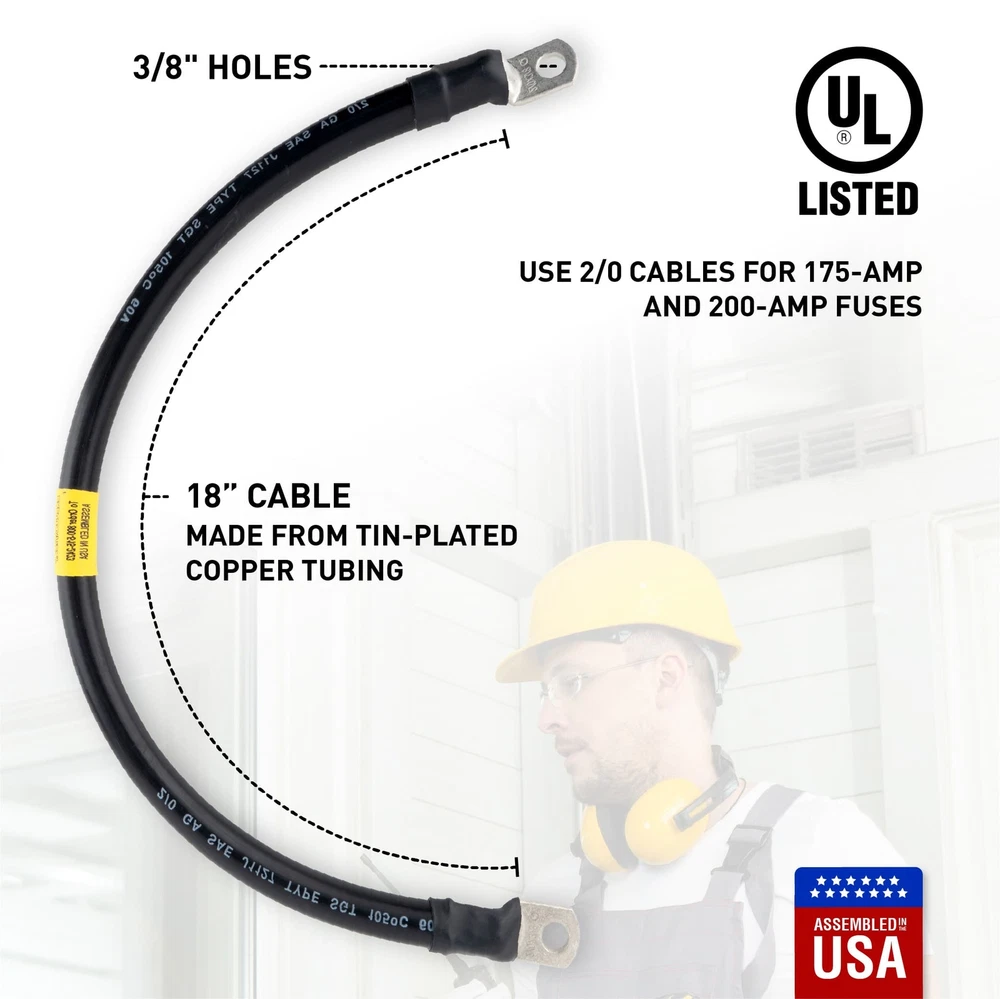 2/0 Black Battery Interconnect Cable - 18 InchesWhy use larger cable? Very high current flows in the cables that connect an inverter to the batteries, even in a Low-Voltage power system. Household appliances can draw over 100 amps, and motors may draw up to 500 amps. Larger cables allow the inverter to draw the current needed to support a large load.Use these cables between individual battery cells or between battery banks. Use 2/0 cables for 175-amp and 200-amp fuses. Circuits protected by 250-amp breakers or 400-amp fuses should use 4/0 cables. Cables are marked in red heat-shrink tubing for positive and white on black heat-shrink for negative.Features of the 18" CablePlated Copper Lugs: These UL-listed lugs are Powered by Frooition Store Home About Us Contact CLEARANCE Alkaline Batteries Assembly Cells Solar Light Batteries Baby Monitor Batteries Barcode Scanner Batteries Battery Chargers Cell Phone Batteries Coin Cells Components Dog Collar Batteries Electric Toothbrush Batteries Emergency Lighting / Exit Sign Flashlight Batteries Flooded Lead Acid FRS / 2-Way Radio Batteries Hearing Aid Batteries Hotel Door Lock Batteries Industrial / Communication Lithium Iron Phosphate LiFePO4 Lithium Thionyl Chloride Photo Lithium Batteries Photographic Batteries PLC / Computer Backup Razor Batteries Rechargeable Batteries Car Alarm / Key FOB Batteries Sealed Lead Acid Vacuum Batteries Watch / Button Cells Interconnecting Cables Outdoor Gear / Accessories FINAL CLEARANCE Battery Kits / Combos Medical Batteries Solar / Off-Grid Power Shop Categories CLEARANCE Alkaline Batteries Assembly Cells Solar Light Batteries Baby Monitor Batteries Barcode Scanner Batteries Battery Chargers Cell Phone Batteries Coin Cells Components Dog Collar Batteries Electric Toothbrush Batteries Emergency Lighting / Exit Sign Flashlight Batteries Flooded Lead Acid FRS / 2-Way Radio Batteries Hearing Aid Batteries Hotel Door Lock Batteries Industrial / Communication Lithium Iron Phosphate LiFePO4 Lithium Thionyl Chloride Photo Lithium Batteries Photographic Batteries PLC / Computer Backup Razor Batteries Rechargeable Batteries Car Alarm / Key FOB Batteries Sealed Lead Acid Vacuum Batteries Watch / Button Cells Interconnecting Cables Outdoor Gear / Accessories FINAL CLEARANCE Battery Kits / Combos Medical Batteries Solar / Off-Grid Power Helpful Links Add to Favorite Sellers Sign up to Newsletter View Feedback Contact Seller Visit seller's eBay Shop About Seller Page 2/0 Black Battery Interconnect Cable 18" with 3/8" Lugs Assembled in USA Item Description 2/0 Black Battery Interconnect Cable - 18 Inches Why use larger cable? Very high current flows in the cables that connect an inverter to the batteries, even in a Low-Voltage power system. Household appliances can draw over 100 amps, and motors may draw up to 500 amps. Larger cables allow the inverter to draw the current needed to support a large load. Use these cables between individual battery cells or between battery banks. Use 2/0 cables for 175-amp and 200-amp fuses. Circuits protected by 250-amp breakers or 400-amp fuses should use 4/0 cables. Cables are marked in red heat-shrink tubing for positive and white on black heat-shrink for negative. Features of the 18" Cable Plated Copper Lugs: These UL-listed lugs are made from tin-plated copper tubing with 3/8" holes, soldered or crimped to a stranded cable. Heat-Shrink Tubing: This tubing insulates the copper lugs and compression terminals. Tubing shrinks and glue inside melts when heated, sealing wires against corrosion and moisture. UL-Listed Battery Cable: This fine-stranded, very flexible cable is UL-listed for use as battery cable. It is rated MTW/THW/AWM, 600 Volt, sunlight resistant, direct burial, 105 degrees C. Available in red or black. Specifications Brand: BIAF Color: Black Length: 18" More Items! View more great items XS Power D Series 12 Volt 4000 Max Amp AGM Battery with M6 Terminal Bolt D4900 $653.95 2x Centennial CB12-105 12V 105A Group 27 AGM SLA Batteries For Wind Solar Power $589.00 XS Power 12V 3000 Watt 62 AH AGM Car Audio Battery 2900 Amps BCI Group 47 $457.95 XS Power D2400 12V 4000 Watt Battery Group 24 AGM 3500 Max Amps $595.95 VIEW ALL Exell Traditional SKUs SHOP NOW VIEW ALL NiMH/NICD Assembly Cells SHOP NOW VIEW ALL Lithium Thionyl Chloride SHOP NOW VIEW ALL Coincell Batteries SHOP NOW VIEW ALL Emergency Lighting SHOP NOW VIEW ALL Flooded Lead Acid SHOP NOW About Us About Us Payment Shipping Returns Contact Us About Us About BatteriesInAFlash BatteriesInAFlash with 20 years of trusted service, is your solution for batteries and power accessories. Our vast selection covers everything from watches to automotive batteries, including batteries for equipment like golf carts, RVs, marine, motorcycles, scissor lifts, floor machines, and solar systems. We also carry batteries for PLC, Door Locks, Emergency Lighting, Slot Machines, Hospitality, and more. Our range extends beyond batteries to include battery cables, solar panels, inverters, and charge controllers. We stock top brands including Trojan, U.S. Battery, Homegrid, Saft, Omnicel, Exell Battery, Antigravity, Fullriver, Interstate, K2 Energy, and more. We are committed to providing top-notch products and excellent customer service. We carry a complete line of batteries and serve all consumer electronic, commercial, industrial, military, and government needs. Payment Payment Payment Options Paypal is the preferred method of payment. We also offer the ability to pay with a credit card through Authorize.net during checkout. All orders must be paid in full before shipping. Any orders that are not will not be shipped until payment is made. Taxes Nevada sales tax of 8.375% will apply to orders shipped to an address in the State of Nevada. Shipping Shipping Shipping & Handling We make every effort to get your order to you in a flash. In-stock items are shipped if the order is received before 1 pm PST. Please note that orders made after 1:00 PM (Pacifi