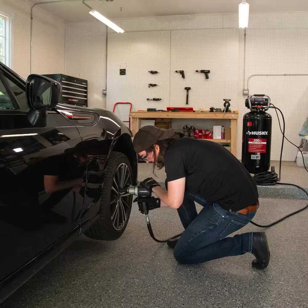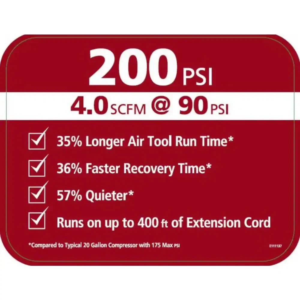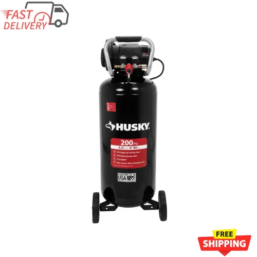 Item Description From Seller 20 Gal. 200 Psi Oil Free Portable Vertical Electric Air Compressor 35% Longer Air Tool Runtime vs. 20 gallon 175 PSI compressors 36% Faster Recovery Time vs. 20 gallon 175 PSI compressors 57% Quieter compared to 20 gallon 175 PSI compressors The Husky 20 Gal. oil free air compressor is industry leading with high performance technology. This Husky 20 Gal. portable vertical air compressor with 200 maximum psi provides 35% longer air tool run time compared to typical 20 Gal. compressors with 175 maximum psi . At 81 dBA, the oil free pump brings less noise to your work environment and has a 57% sound improvement versus typical 20 Gal. compressors with 175 maximum psi. The high efficiency motor allows for easier cold weather start as low as -20° F (-29° C) and extension cord application up to 400 ft. of extension cord. The Husky 20 Gal. 200 PSI air compressor is perfect for light automotive tasks, agricultural equipment repairs and intermittent use for metal working applications. 200 maximum psi for 35% longer air tool run times compared to typical 20 Gal. compressor with 175 maximum psi 200 maximum psi for 36% faster recovery time compared to typical 20 Gal. compressor with 175 maximum psi With a decibel rating of 81 dBA, this compressor brings less noise to your work environment with a 57% sound improvement versus typical 20 Gal. compressors with 175 maximum psi Cold weather start as low as -20° F (-29° C) allows for easier start in colder temperatures Able to operate up to 400 ft. of extension cord 7 in. wheels for shop or garage portability Slim vertical design has a smaller footprint and takes up less space in your shop or garage Perfect for all inflation, finish nailing/stapling, hobby painting, bolting/fastening, and cutting/drilling and surface prep Oil free pump allows for hobby spray painting without the need for oil separators in the air system
