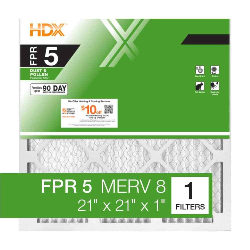HDX Pleated Air Filters - MERV 8, FPR 5, 3-Pack - Captures Dust, Pollen, Pet Dander Key Features: Efficient Particle Capture: Traps dust mites, pollen, lint, and pet dander to improve indoor air quality. Durable Construction: Wire-supported, moisture-resistant frame offers enhanced strength and rigidity. Electrostatically Charged Media: Attracts and captures particles that typically bypass filters, with a MERV 8 rating for effective filtration. Optimal for HVAC & Vents: Fits furnaces, HVAC systems, wall vents, and ceiling vents. Long-Lasting Use: Each filter lasts up to 90 days in a standard household environment. Subscription Available: Optional change-out reminders with convenient subscription service. Product Description: HDX Pleated Air Filters offer an effective and durable solution to improve your home’s air quality. Each filter features electrostatically charged media, a MERV 8 rating, and is designed to capture dust, pollen, lint, and pet dander, keeping your indoor air clean. The FPR 5 rating ensures optimal filter performance with lower energy usage, reducing the pressure on your HVAC system while providing long-lasting durability. This 3-pack provides a reliable supply of filters to keep your home fresh, with convenient replacement reminders available through our subscription service.