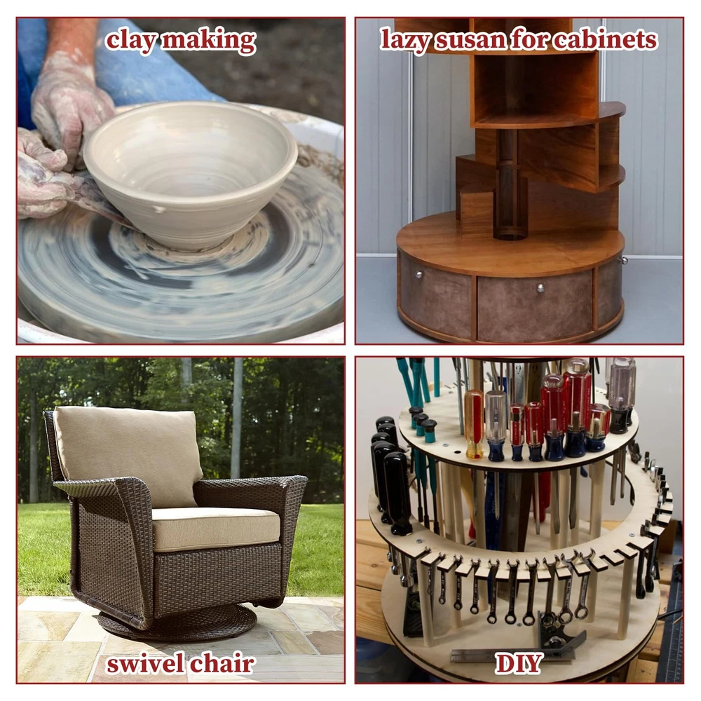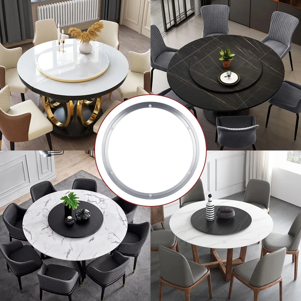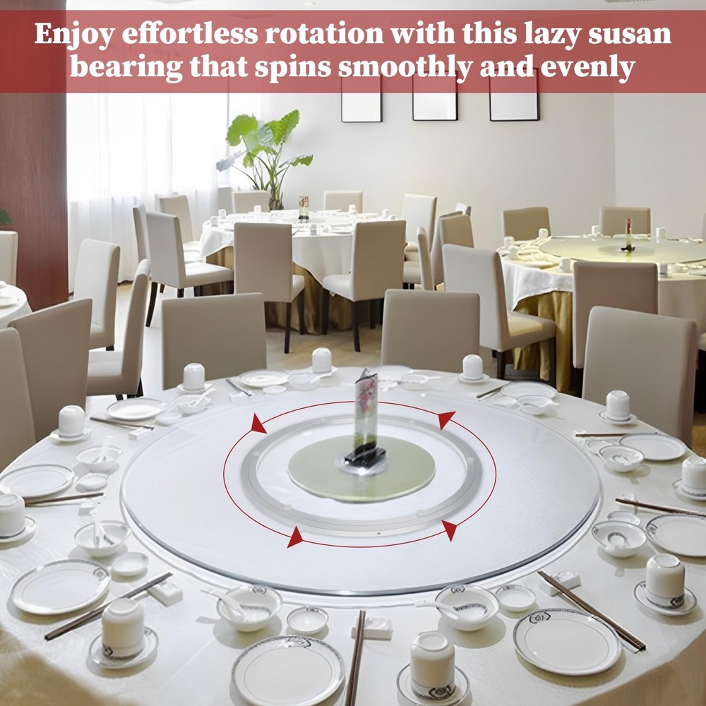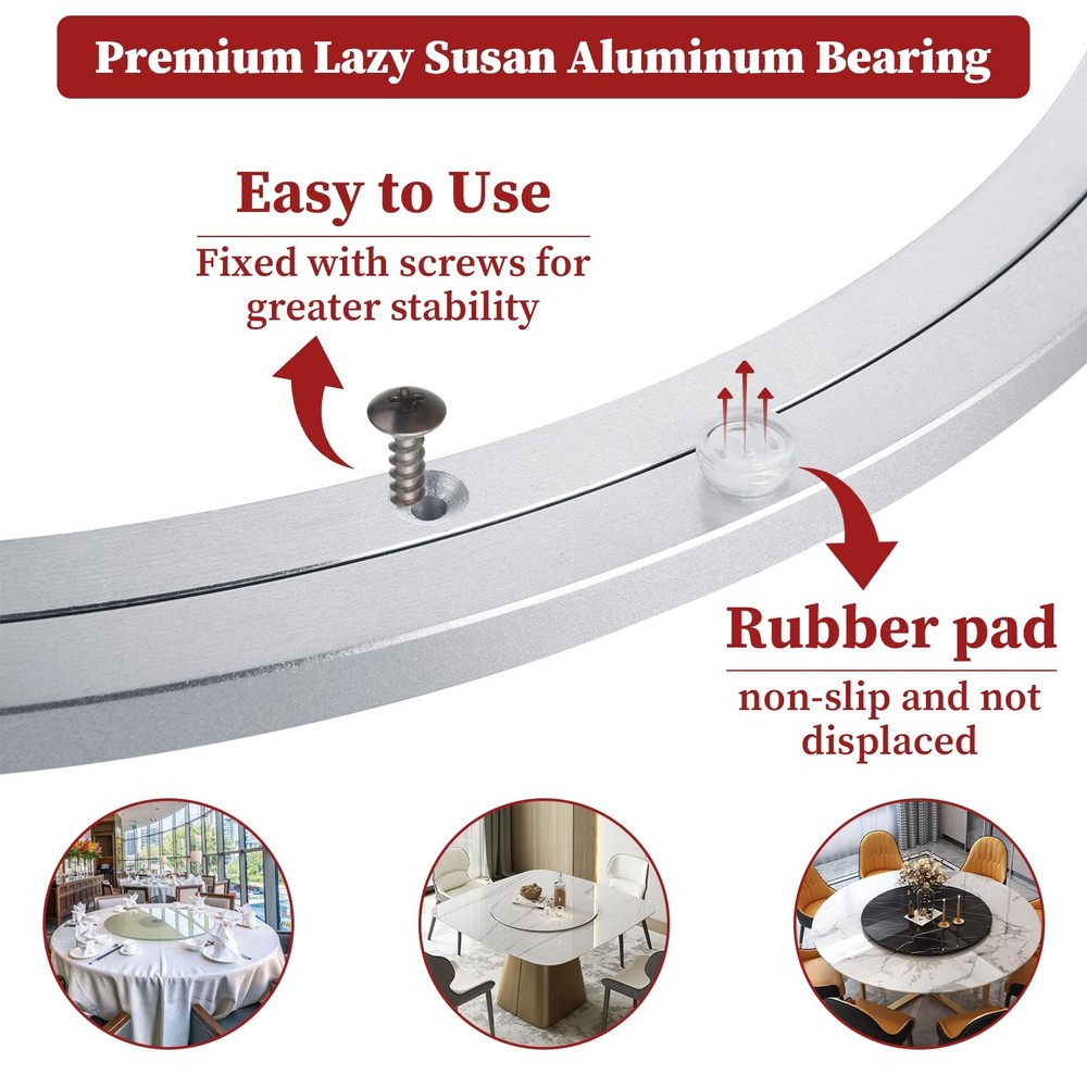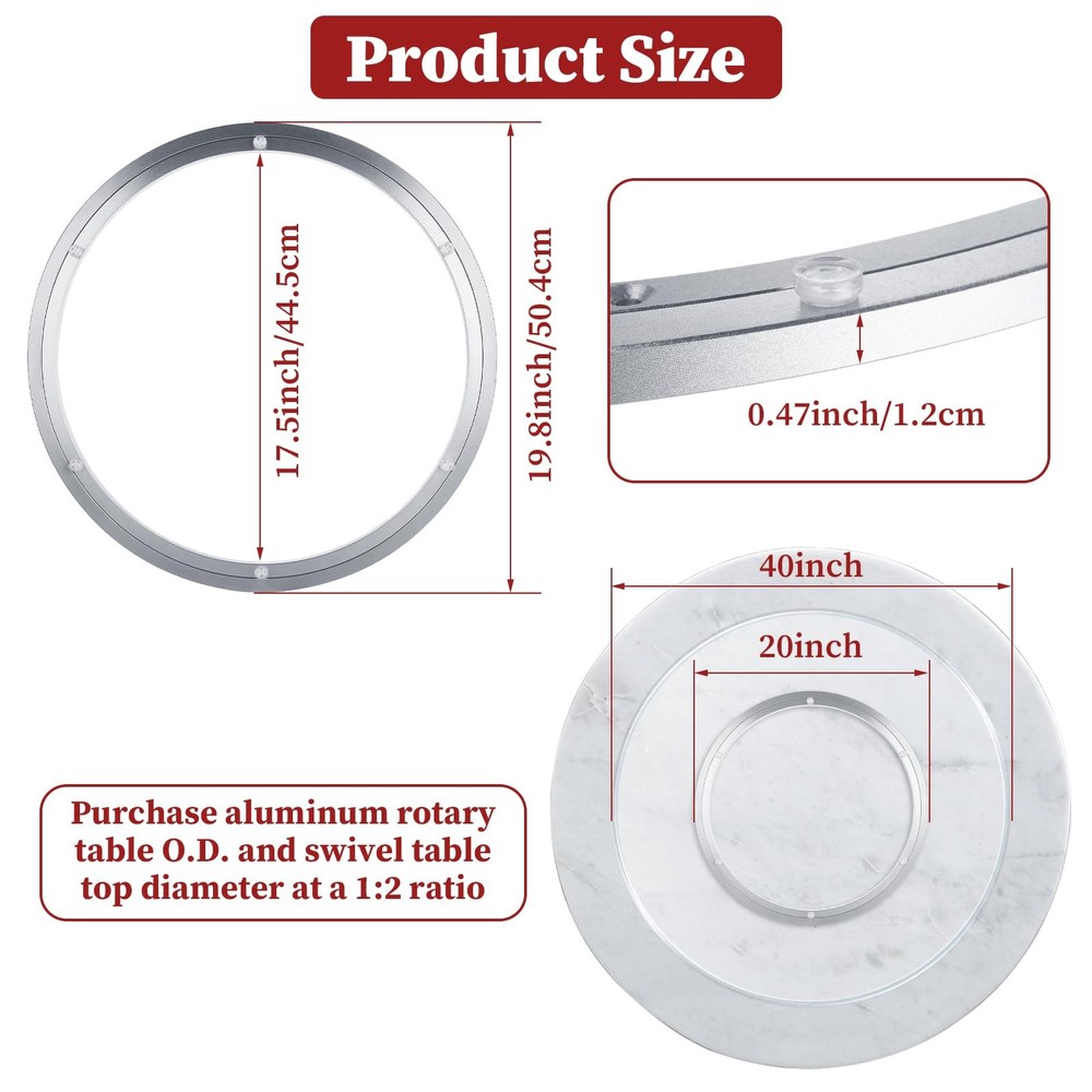 Feature: Perfect Size The lazy susan base outer diameter is 20inches/50.4cm and inner diameter is 17.5inches/44.5cm, thickness 0.47inches/12mm. The lazy susan hardware can hold up to 440lbs/200kg. High Quality Material -- Lazy Susan bearing is made from high-quality heavy duty aluminum alloy, corrosion-resistant, rust-proof, wear resistant and durable. 360 Degree Rotation The turntable can rotate 360 degrees freely, no boring noise, can meet your many diy projects. Smooth And Quiely Rotatig Plate The rotating bearing design has a deeper raceway groove, which effectively encapsulates the ball and makes the movement more stable. Even if you are resting in the living room or bedroom, the sound made by the lazy susan during use will not affect your rest. How do I choose a turntable base? --We recommend that users first confirm the diameter of the table top before purchasing a rotary base, and we recommend that the rotary dial size is one-half of the diameter size of the table top. --For example, the 16-inch rotary wheel slide needs to be paired with a 32-inch tabletop, and so on. This is a good choice suggestion. Wide Application Use them for revolving shelves in kitchen cabinets, planters, serving platters at the table, large tabletops or making rotating work station, rotating table, bookcase, serving tray, DVD tower, corner shelves, shoe rack, corner cabinets, storage solutions, chalk spinners, turntable kaleidoscopes, tabletop serving, pop displays, magazine racks, movie poster displays. Specifications: Material: Aluminum alloy Color: Silver Type: Round Lazy Susan Swivel Plate Diameter: 20 Inch Thickness: 0.47 Inch Load capacity: 440lbs/200kg Package Include: 1pcs 20”Heavy Duty Lazy Susan Turntable Hardware 【Size】The lazy susan base outer diameter is 20inches/50.4cm and inner diameter is 17.5inches/44.5cm, thickness 0.47inches/12mm. The lazy susan hardware can hold up to 440lbs/200kg 【Premium Lazy Susan Bearing】The lazy susan bearing is made of heavy duty aluminum alloy, which is strong, corrosion-resistant, and rust-resistant. The gap between the two rings is exceptionally tight, making our bearings excellent at preventing dust, debris and other foreign objects from entering the gap. You can choose from top quality materials such as wood, glass or marble to match your home decor 【Polished Ball Bearing & Anti-Slip Rubber Feet】A neat row of bearing balls of turntable bearing provides firm support and easy rotation for efficient operation and maximum stability. The lazy susan base equipped with non-slip rubber feet for non-slip and easy use 【Easy to Install】These bearings can be screwed or fixed as they have through holes and pre-drilled holes. Easy to set up, no installation required 【Wide Applications】The 20 inch lazy susan bearings are suitable for tables, corner cabinets, display racks, trays, magazine racks, TV monitor stands, electronics repair, cake decorating and trade show displays