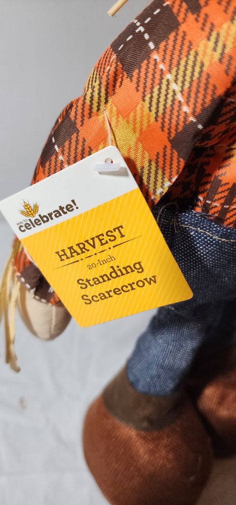 The 20-inch Standing Scarecrow is a colorful figurine designed for fall decorations, produced by Walmart. This free-standing scarecrow is a Seasonal themed piece that adds a touch of charm to any room. Made with a matte finish, this figurine is 20 inches tall and does not require any additional parts for display. Perfect for adults looking to enhance their home with a festive and unique decoration, this Walmart branded Scarecrow is a delightful addition to any seasonal decor collection.