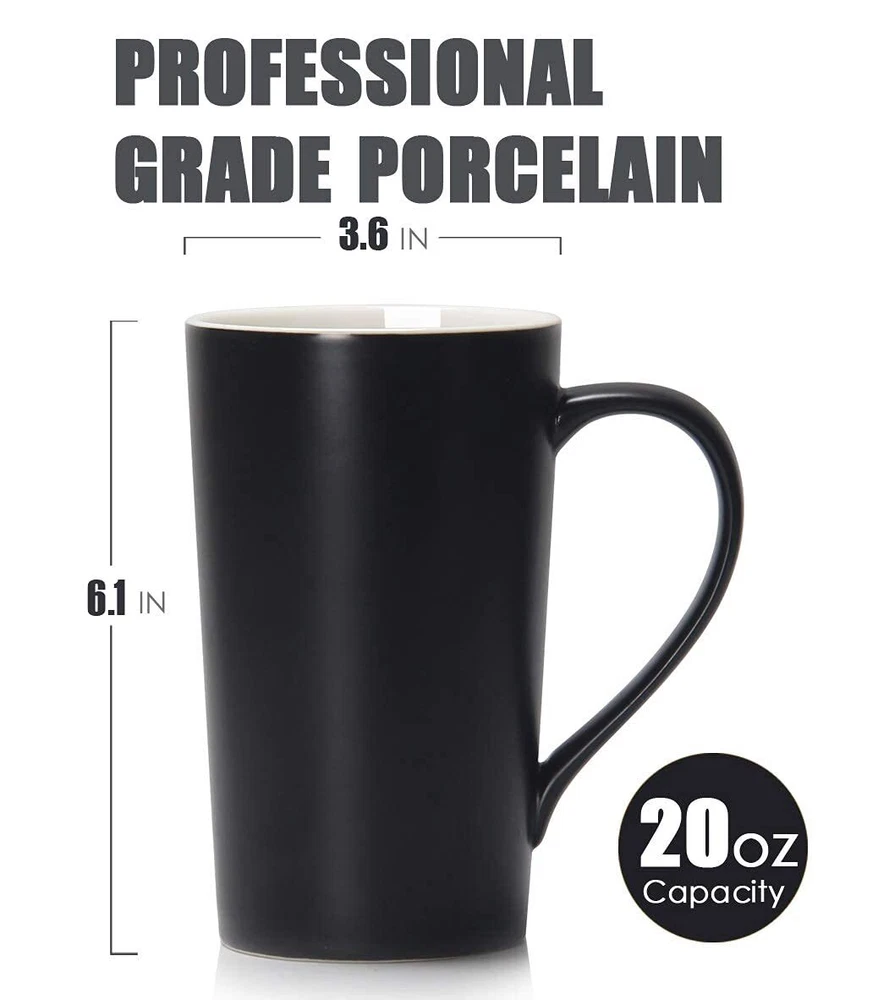3.6 inches in diameter and 6.1 inches high. pack of 2, each 20 oz. Made of high quality ceramic, Durable and easy to clean, lead-free and non-. Safe for dishwasher, microwave, oven and freezer. Perfect for coffee, tea, cocoa and cereal. you can just give it away as presents, make personalized gifts by filling them with candy, pens etc, for DIY projects, for decorating purposes. 30-day No-Chip - will offer a free or if anything goes wrong with the product.