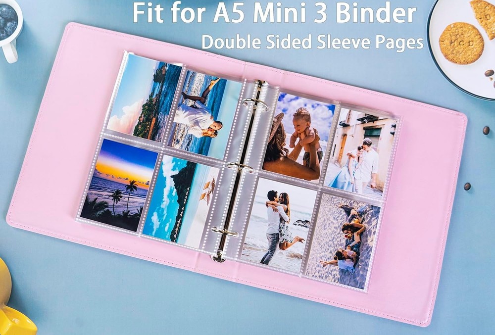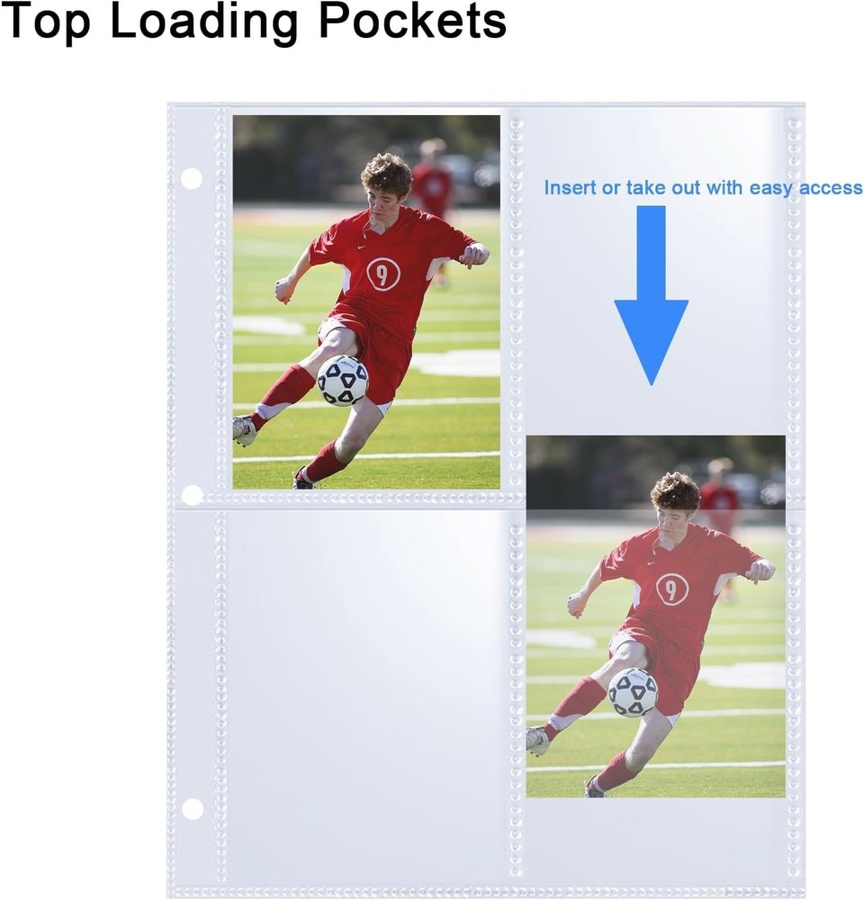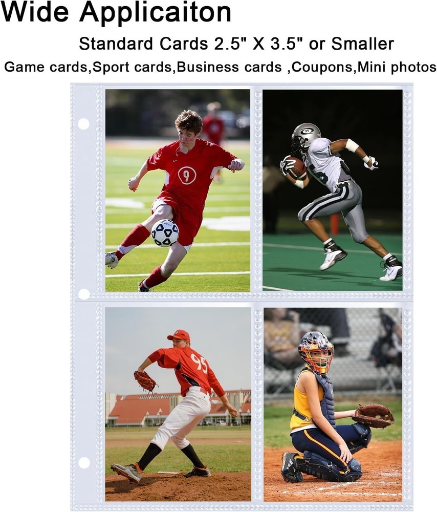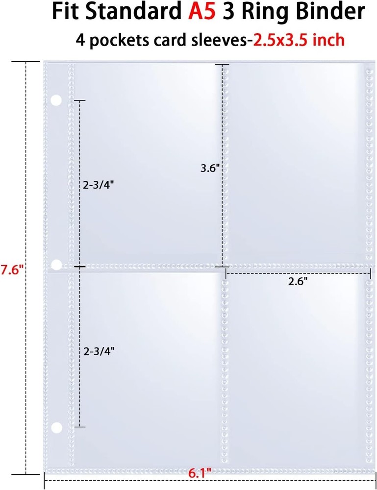 20 Pack 160 Pockets 2.5X3.5 Trading Card Sleeves,A5 Binder 4 Pocket Card Sleeves Description Item model number W-50 Sheet Size A5 Number of Items 20 Color 20 Pack Brand Material Plastic Material Type Plastic Manufacturer Part Number W-50 Style Baseball Item Weight 0.13 Kilograms Manufacturer Product Dimensions 6.16 x 7.64 x 0.2 inches Size 2.6x3.6 inch 1, Double-Sided 4 Pocket Page Protector: This trading card sleeves provide double capacity that you can put total 8 cards in both sides of the sheet. They are perfect refill pages for the 2-3/4 inch 3-ring binder. Compare with the 9 pocket page protectors, they are more portable and more convenient for kids to flip through(Not fit for A6 binder, Not fit for A4 binder, Not fit for 6 ring A5 binder) 2, Wide Application and Perfect Gift Choice: Our card sheets are perfect for holding standard cards with the size of 2.5" X 3.5" or smaller. It is suitable for Yugioh/MTG cards, baseball cards, sport cards, business cards, coupons, mini photos. They are best present choice for your kids and friends who loves collecting trading cards 3, Premium Quality: The card sleeves are made of high quality polypropylene with ultrasonic welding technology which make them tear-resistant, non-toxic, no PVC, harmless for your cards 4, Ultra-Clear and Water/Dust Proof: The see-through page protector allows you see your cards clearly without taking them out. Your precious cards will always as new when you keep them in these waterproof and dustproof pockets 5, Top Loading: Top loading pockets for you inserting or taking out with easy access, and cards would not fall out as long as you keep card protector sheets flat or upright Product Description Wide Application Perfect for holding standard cards with the size of 2.5" X 3.5" or smaller 1) Game cards (Yugioh/MTG cards) 2) Sport cards (Basketball cards/ Baseball cards/ Football cards) 3) Coupons 4) Mini photos Product Details Fit for Mini 3 Ring Binder 3 ring sleeves are suitable for the small size 3-ring binder/A5 3 ring binder Size Information Pocket size: 2.6" x 3.6" Page size: 6.1" x 7.6" Space between the rings: 2-3/4 inch Top Loading Pockets Insert or take out with easy access, and cards would not fall out as long as the protector sheets keep flat or upright