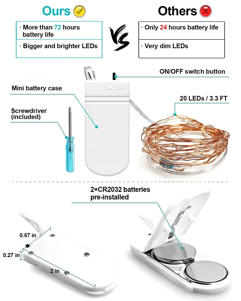 Newly Upgraded 3.3ft 20 LEDs Fairy lights: Our fairy lights battery operated consist 3.3 ft flexible copper wire and 20 super bright LEDs. As per market research, more customers prefer shorter wire length, so we kept the number of 20 LED lights but shorten the wire length to 3.3 ft, which makes it easier to DIY any shape you like without having to wrap many circles Long Life Battery and Continuous Illumination: The twinkle lights are pre-installed with long-life batteries that provide long endurance lighting for more than 72 hours. The high-quality batteries allow the fairy lamp to continuously emit warm light, making our daily life as wonderful as a fairy tale. Durable Material and Safe To Touch: We insist on using high-quality materials for each of our mini string lights, since providing high-quality products to customers is the principle of our brand. Our copper wire mini lights using high quality 3V low voltage insulated line, which makes it cool to touch and safe to use, the soft LED lights will not harm children’s eyes. Wide and Diverse Applicated Scenarios: Our LED fairy lights by battery operated can be used indoor and outdoor since the string lights are waterproof (Note: the battery case is not waterproof). The portable mini lights can be taken to anywhere you want to decorate. Moreover, our battery case is extremely mini in size(2*0.87 in), which makes it super easy to hide anywhere. Romantic Your Moments and Brighten Your Life: Our 20 pack fairy lights is perfect for decorations and creating romantic atmosphere on Valentine's Day, Christmas, Halloween, and any other important festivals. So just follow your heart to DIY your life, wherever bedroom, patio, table settings, parties, Wedding, mason jars. Hope our fairy lights surrounds all your important moments.
