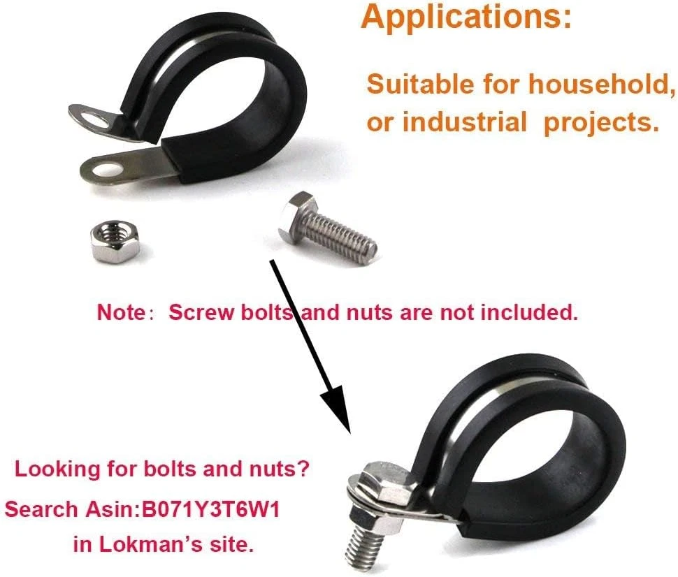 HIGH QUALITY- Premium 304 Stainless steel cable clamps which rubber cushioned. Salt resistant, anti rust, anti-corrosion, waterproof, oil-proof. These features make the clamps very sturdy and strong and can be worked lasted for years. The quality rubber insulation on the clamps held up flawlessly. It is pliable which protect the tube well and keeps the clamp securely in place. WIDELY USED- Clamps are marine grade. Perfect to apply in automotive, industrial, boat/marine, windshield, household etc. for wiring, cables, pipe, rack, line management and restoration. No matter in salt water/air environment. STYLISH DESIGN- The P-Style design makes the clamps stylish, flexible and innovative.Strong and reliable. Easy to twist, bend, manipulate when install. SIZE- Cable clamp screw hole diameter: 6.5mm, fit for 6M( 1/4 inch) screw bolt to through them. Cable clamp inside diameter 1/4 inch. Fit for 1/4 inch (outside diameter) wiring, lines,hoses or cables to a panel or frame application. ENVIRONMENTAL FRIENDLY- It can be reused and recycle if you do not want them to stay on the original place thanks to the high quality material which makes them worked last for years. Product Description Premium! Safety! Friendly!Fulfilled Your Project Need! LOKMAN Cable Clamps, Gives You a 5 Stars Reliable Smart Tools Improvement! Automotive Industrial machinery Boat/marine windshield, bracket Any other indoor and outdoor projects. ----For hose, cable, pipe, tubing, wiring, fuel line etc fitting application. Wide range, various sizes from 3/16 inch to 3 inch individual size pack. Small, medium, Large sizes assortment kits for selection in LOKMAN SHOP. WIDE RANGE APPLICATION For hose, cable, pipe, tubing, wiring, fuel line etc fitting application. MARINE GRADE 304 STAINLESS STEEL Premium 304 Stainless steel material with quality rubber cushioned. Salt resistant, anti rust, anti-corrosion, waterproof, oil-proof. Sturdy, strong and reliable. Quality rubber insulation on the clamps holds up flawlessly. Protects the tube well and keeps the clamp securely in place. STYLISH APPEARANCE P-Style design makes the clamps stylish, flexible and innovative. Strong and reliable. Easy to twist, bend and manipulate when install. SPECIFICATION Clamp width (include the rubber cushioned): 15mm. Clamp hole Diameter: 1/4 inch. Clamp inside diameter: 1/4 inch. Fit for 1/4 inch (outside diameter) wiring, lines, pipes hoses or cables to a panel or frame application. Package Contents: 20 pack 1/4 inch LOKMAN cable clamps.