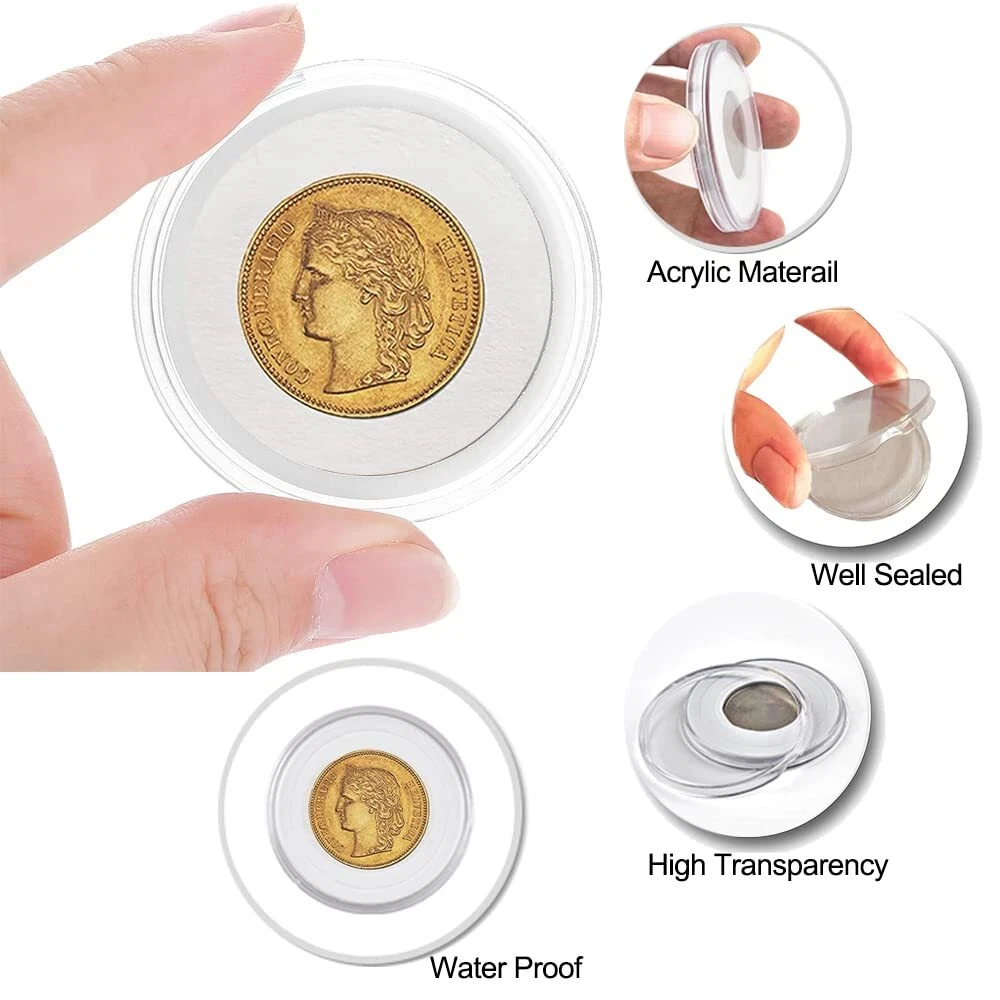 Universal Coins Collector Case: Coin storage organizer have 20 Pcs 46mm coin capsules and 7 Sizes(16/20/25/27/30/38/46 foam gaskets, Suitable for American Silver Eagle Liberty Coin , Half Dollar ,Bitcoin ,pennies, quarter dollar, golden dollars, tokens, medallions, badges, sliver eagles etc. (Case only not includes coins) Durable Coin Holders for Collectors: The coin capsules case is Made of high-transparent and thickened plastic material, dust-proof and oxidation-resisting, which is more Every compartment can hold coin capsules neatly and snugly. The fine and meticulous silver dollar coin holders box has the functions of splash-proof, dust-proof, and moisture-proof, providing the most comprehensive protection for your beloved silver coins. Coin Capsules Sizes for Protecting Tokens and Blinging Out Your Game . Usually Use Coin Collection : 46 * 3mm internal plastic coin holder with 6 sizes of foam gaskets allows you to store all collectible coins, and also Coin capsules are an attractive way to protect round cardboard tokens, especially those which are shuffled and used for random draws. Using coin capsules also adds heft and makes the tokens easier to shuffle within a draw bag, since the tokens no longer clump together. Unique Design Coin Protector: Crescent design for the coin capsule box is convenient to open and close. The strong and stable latch design combined with the small internal baffle makes it tightly closed and easy to use. The internal coins can be safely stored in one place, easy to find and not will lose. The standing design keeps your silver dollar coins sorted and organized. Easy Carrying Coin Case: The compact coin storage holder can be easily put into your backpack or suitcase for easy carrying to any place. The coin protectors plastic with portable design, which can be used easily and happily whether on a journey or party. Great gift for your families, friends and coin collector.