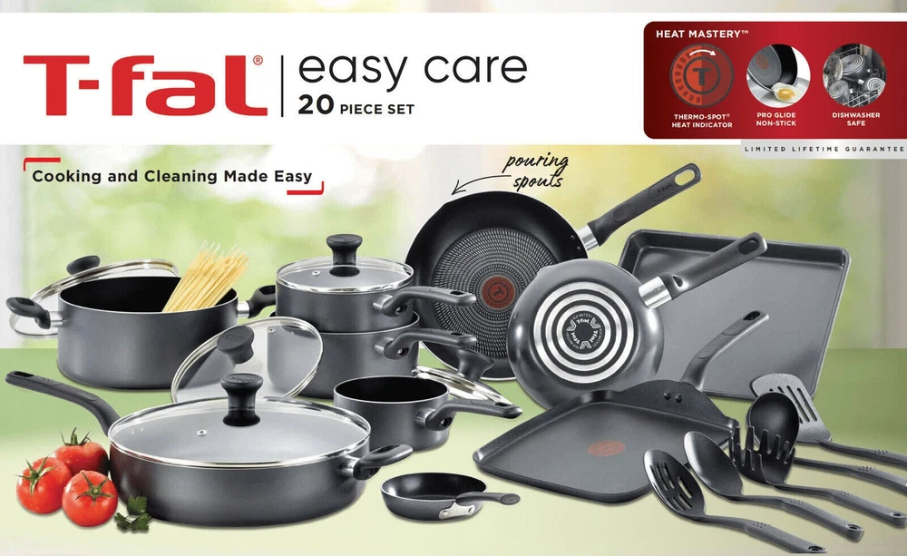 You may also like 12-Piece Pots Pans Cookware Set Nonstick Toxin-Free Ceramic Dishwasher Safe NEW 117.56 USD 123.75 USD Free shipping 5% off 12pcs Nonstick Aluminum Cookware Set Fry Pan Saucepan Dutch Oven Bakeware Green 93.72 USD 98.65 USD Free shipping 5% off Stainless Steel Cookware Set 14 Pc Induction Compatible Dishwasher Safe Kitchen 112.75 USD 118.68 USD Free shipping 5% off 10 Pcs Clean Ceramic Nonstick Cast Aluminum Cookware Set W/ Heart Knobs Durable 93.81 USD 98.75 USD Free shipping 5% off 12-Piece Toxin-Free Nonstick Cookware Set Dishwasher Safe Durable Easy Cleanup 135.28 USD 142.4 USD Free shipping 5% off 12 Pc Non Stick Cookware Set Pots Pans W/ Lids Handles Cooking Tools Kitchen New 94.92 USD 99.92 USD Free shipping 5% off 7 Piece Nonstick Cookware Set Carbon Steel W/ Glass Lids & Bakelite Handles New 47.5 USD 50.0 USD Free shipping 5% off 12 Piece Non-Stick Cookware Set Aluminum Ceramic Kitchen Cooking Essentials New 143.34 USD 150.88 USD Free shipping 5% off 10 Piece Nonstick Cookware Set Dishwasher Safe Riveted Cool Handles Glass Lids 75.0 USD Free shipping 18 Piece Nonstick Cookware Set Kitchen Essentials Dishwasher Safe Utensils Red 59.34 USD 62.46 USD Free shipping 5% off Nonstick Cookware Set 14 Piece Soft Grip Handles Straining Lids Even Heat Base 94.86 USD 99.85 USD Free shipping 5% off 10 Pcs Non Stick Ceramic Cookware Set Aluminum Pots & Pans Dishwasher Safe New 84.22 USD 88.65 USD Free shipping 5% off Cooking and cleaning made easy with T-fal easy care nonstick 20 piece set, ensuring reliable results when preparing meals for the whole family. Includes 4.5" one egg wonder, 8" fry pan with pouring spouts, 10.5" fry pan with pouring spouts, 10.25" griddle, 5 qt jumbo cooker with glass lid, 1 qt saucepan with glass lid, 2 qt saucepan with glass lid, 3 qt saucepan with glass lid, 5 qt stewpot with glass lid, baking tray, pasta spatula, spatula, ladle, spoon, and slotted spoon. Pro-glide non-stick interior ensures easy food release, and enables healthy cooking with little to no oil. Features comfortable handles and vented tempered glass lids. PROGLIDE NONSTICK COOKWARE INTERIOR: Easy release and cleanup every time THERMO-SPOT TECHNOLOGY: Unique heat indicator that turns solid red to show when pots and pans are properly preheated to start cooking EVEN HEAT BASE: No hot spots for reliable cooking results COMFORTABLE HANDLES: Sturdy and secure grip POURING SPOUTS: Extra convenience in the kitchen MEASURING MARKS: Helps save time VENTED TEMPERED GLASS LIDS: Maintain visibility while trapping heat and moisture DISHWASHER AND OVEN SAFE: Up to 350°F ALL COOK TOPS COMPATIBILITY: Excluding Induction LIFETIME LIMITED GUARANTEE You may also like 6ft Prelit Artificial Slim Pencil Christmas Tree with Remote Control Hinged 98.7 USD 103.89 USD Free shipping 5% off Corner Shower Caddy Tension Pole 4-Tier Rustproof Adjustable Storage Rack Duty 61.74 USD 64.99 USD Free shipping 5% off Stylish Coffee Table Space Saving Durable Indoor Furniture Living Room Durable 47.4 USD 49.89 USD Free shipping 5% off 8A Belt Sander 380RPM Variable Speed 5 Sanding Belts Dust Bag Stock Removal New 61.74 USD 64.99 USD Free shipping 5% off 2000lm COB LED Work Light Rechargeable Magnetic Hands Free Waterproof Battery US 40.53 USD 42.66 USD Free shipping 5% off Single Burner Propane Stove Compact Portable Camping Kitchen Backpacking Outdoor 29.65 USD 31.21 USD Free shipping 5% off Heavy Duty Adjustable Metal Shelving Unit 5 Tier Storage Rack 2000 lbs Capacity 54.52 USD 57.39 USD Free shipping 5% off 11X4-5 Smooth Lawn Garden Tire 4PLY All Season Radial Off Road ZTR Mower New 36.85 USD 38.79 USD Free shipping 5% off 12-Piece Toxin-Free Nonstick Cookware Set Dishwasher Safe Durable Easy Cleanup 135.28 USD 142.4 USD Free shipping 5% off 16" Round Water Hyacinth Woven Tray W/ Handles Tan Lightweight Sturdy Home Decor 178.91 USD 188.33 USD 19.99 USD 5% off Orthopedic Plush Pet Bed Dog Cat Non Skid Sofa Design Egg Crate Foam Support New 35.54 USD 37.41 USD Free shipping 5% off 76" x 25" Camping Cots Sleeping Bed Folding Portable Lightweight Travel Outdoor 93.24 USD 98.15 USD Free shipping 5% off