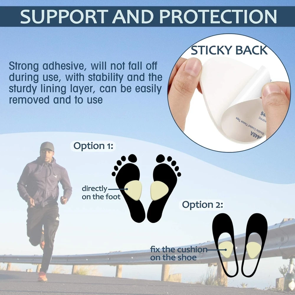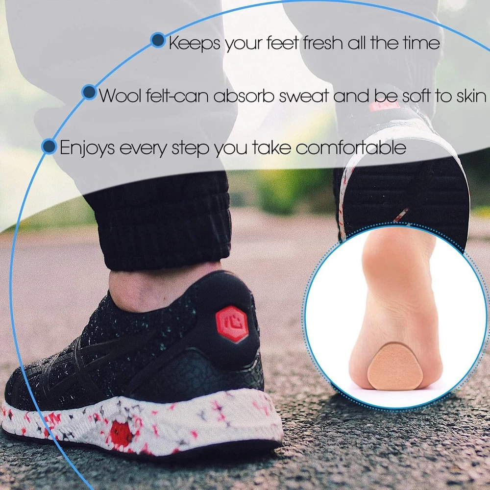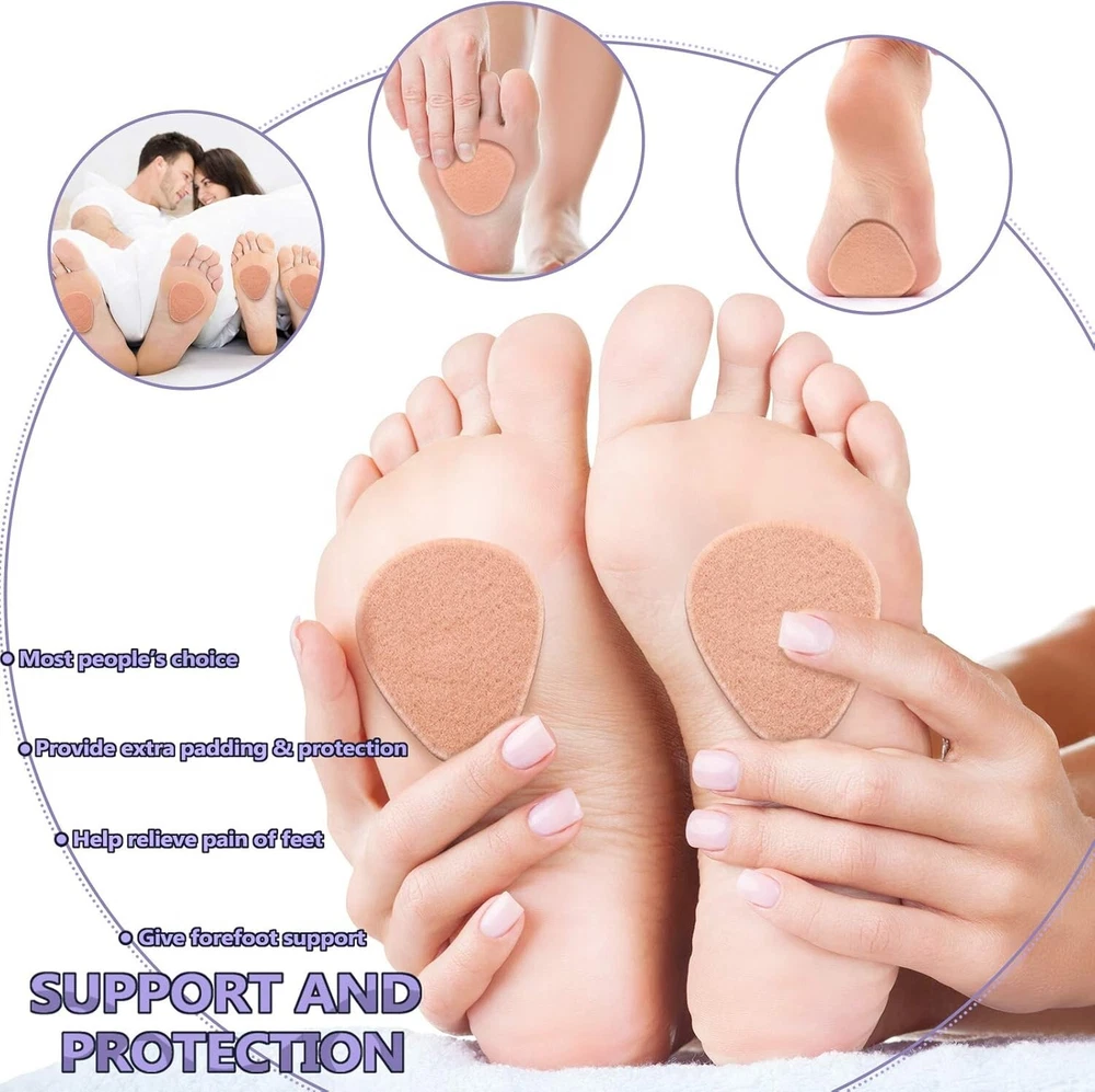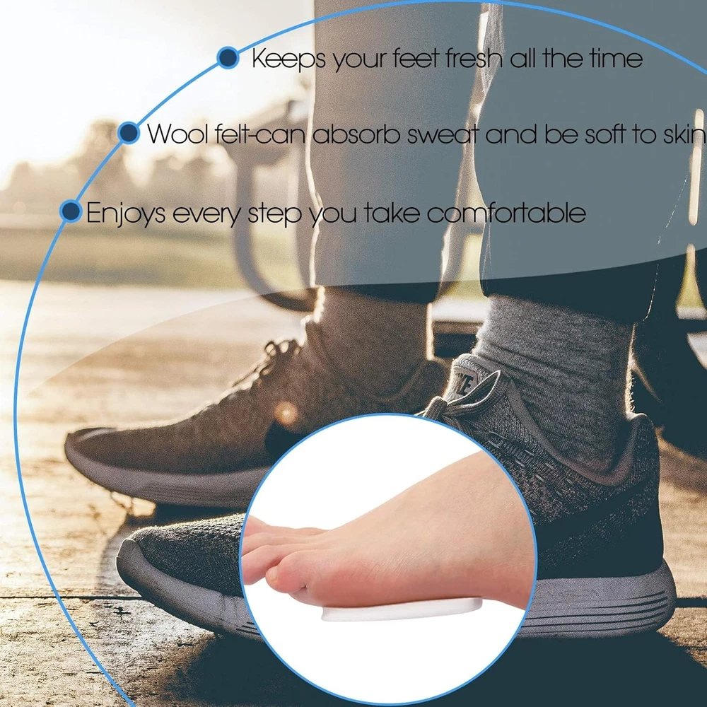 Soft and flexible: foot pads are made of wool felt, can absorb sweat and be soft to skin; The package comes with 10 pairs of pads, totally 20 pieces, sufficient quantity can meet your daily needs for use and replacement; The size fits for most people's feet, keeps your feet fresh and enjoys every step you take with confidence and comfort Thicken design for vibration absorption: the thickness of felt foot cushion is approx 1/4 inches, has a nice cushioning effect and reduces the impact with the ground on the feet, helps relieve pain and soreness of feet Strong adhesive: wool felt foot pads have strong adhesive, can be held in a place for a long time, will not fall off during use, with stability and the sturdy lining layer, can be easily removed and applied, give comfortable support to your forefoot Support and protection: foot cushions provide additional padding and protection for the soles of the feet; Before putting on shoes, fix the cushion on the insole or directly on the foot, which will not affect any of your normal life, to relieve the pain and pressure of bone, and enjoy your walking without burning or aching again Most people's choice: forefoot pad is a common but effective solution for most people; The pads work by absorbing much of the pressure from the feet bone thus providing pain relief to the ball of foot; It is very suitable for toes, calluses and various foot problems; Warm note: it is always suggested to consult a healthcare practitioner for appropriate advice