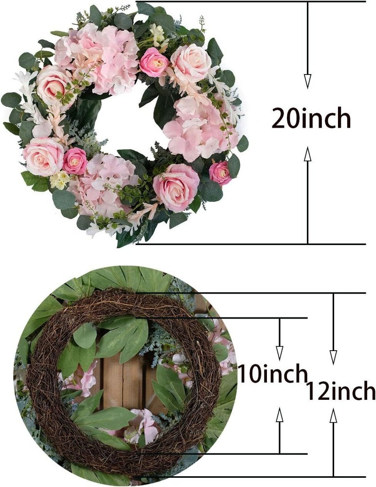 Artificial Pink Rose Wreath - 20 Inch Front Door Wreath with Hydrangea Leaves for Spring, Valentine's, Mother's Day, Wedding & Home Decor 🌹1.Size: The outer diameter of the rose wreath is about 20 inches, and the inner diameter is about 11 inches. This is a very plump beautiful wreath. You only need to tidy up the wreath to unfold, and you will get a beautiful spring wreath. 🌹2.This pink flower wreath is made of silk rose,eucalyptus leaves and hydrangea flowers that covers both the front,accented with brown durable twigs vine that cover the base of the floral wreath make for a timeless seasonal home decor. 🌹3.Elegant and generous pink rose wreath will add a romantic and warm feeling. Hang it on the front door, bedroom, living room wall or above the fireplace to add luster to your room. 🌹4.Suitable for front doors, walls, windows, mirrors, porches and living rooms. It is also ideal for holiday celebrations or gift ideas. Can be used throughout the year, bringing you the breath of spring every day. 🌹5.Since it is made of silk, it is necessary to avoid contact with water. It can be used indoors and outdoors. If it is outdoors, it is recommended to hang it on the covered porch to avoid direct sunlight and rain.