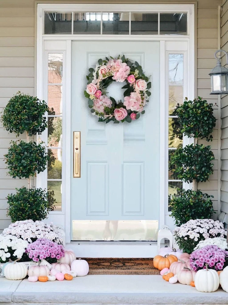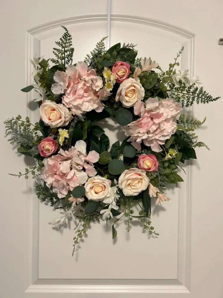 This gorgeous pink rose wreath is a showstopper! The plush silk roses and lush hydrangea leaves create a romantic, full look perfect for any season. At 20 inches, it makes a statement without being overwhelming—just fluff it up, and it’s ready to brighten your front door, wedding decor, or living space. The mix of soft pink blooms and eucalyptus adds elegance, while the sturdy base ensures durability. It’s an effortless way to add charm to your home!