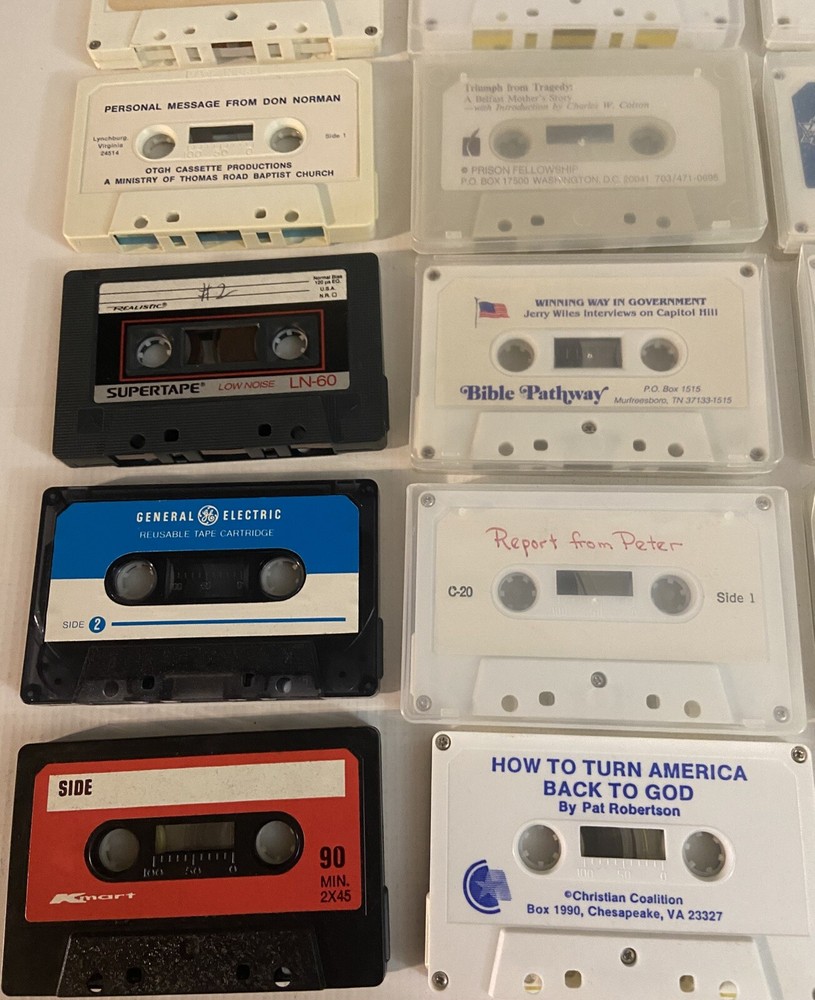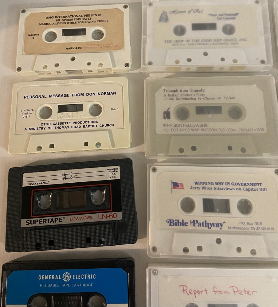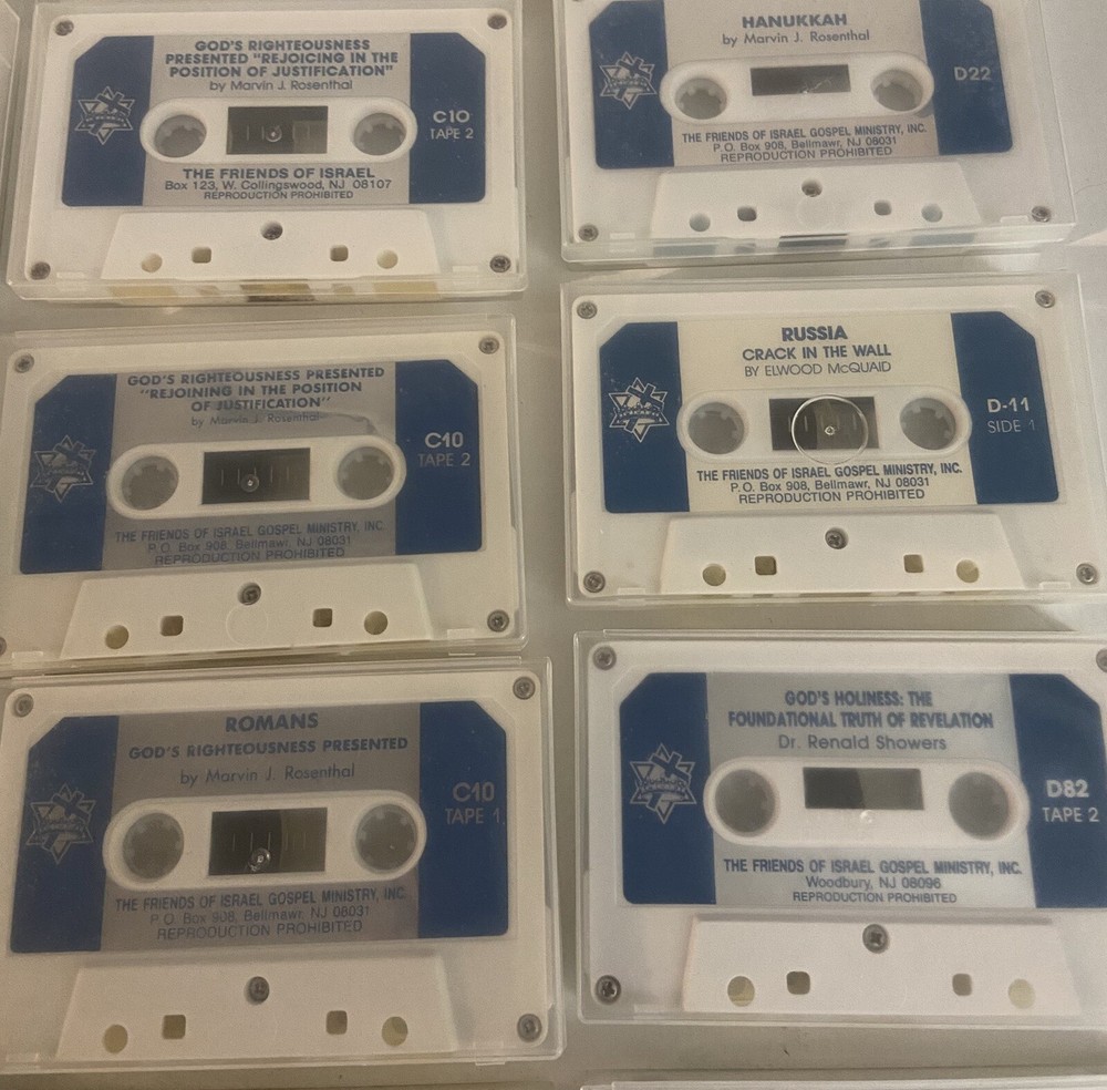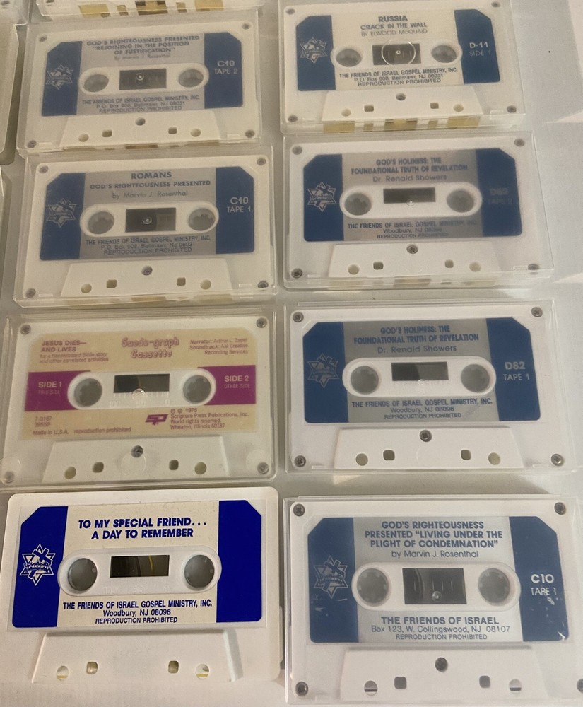 Religious Cassette Tape Lot Friends of Israel Gospel Ministry & More ~ Cassettes are untested, there are 20 cassettes total, some don’t have outer cases. There are 9pc The Friends of Israel Gospel Ministry, 1pc 1975 Scripture Press Publications, The Crew of the good ship grace inc., Prison Fellowship, AMG International, OTGH Cassette Productions, Christian Coalition, Bible Pathway, Report from Peter, and Im uncertain what’s on the three cassettes in bottom left row. Selling all 20 together as a lot as is.